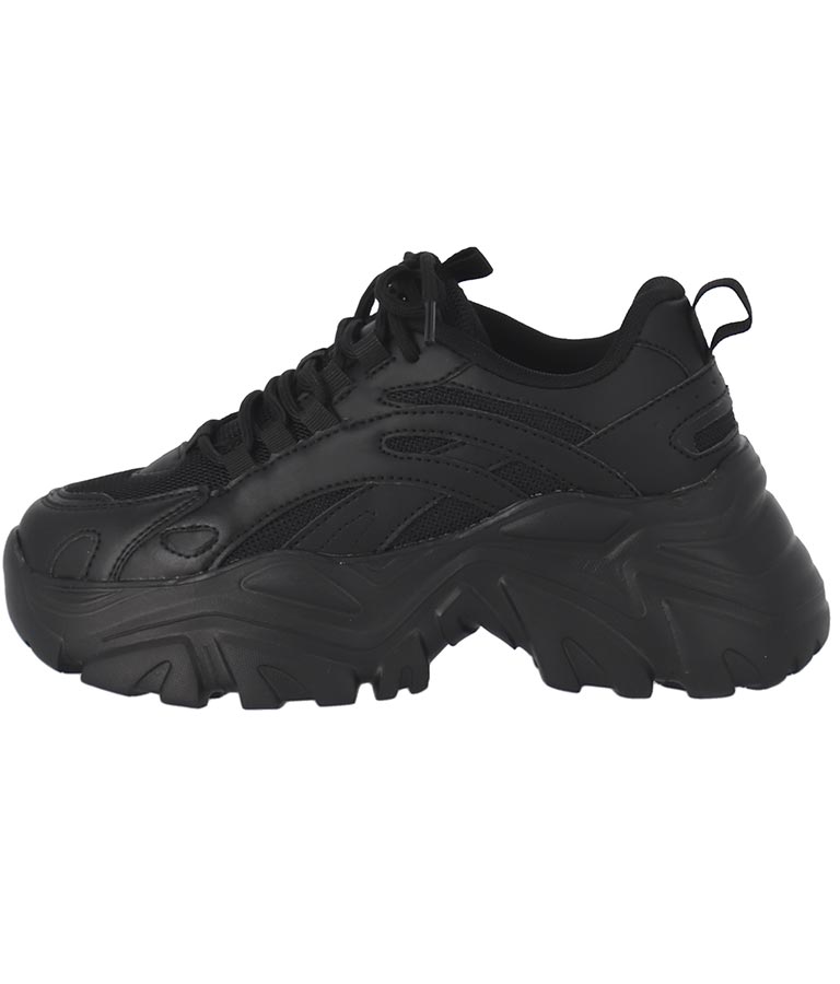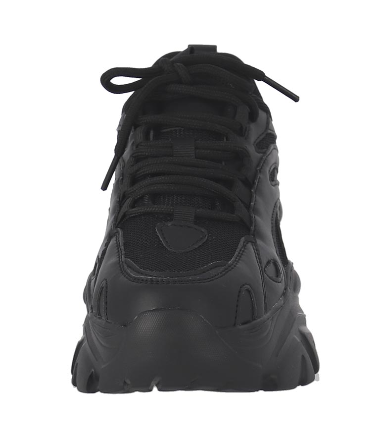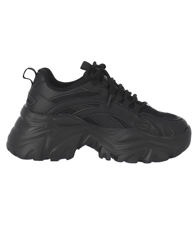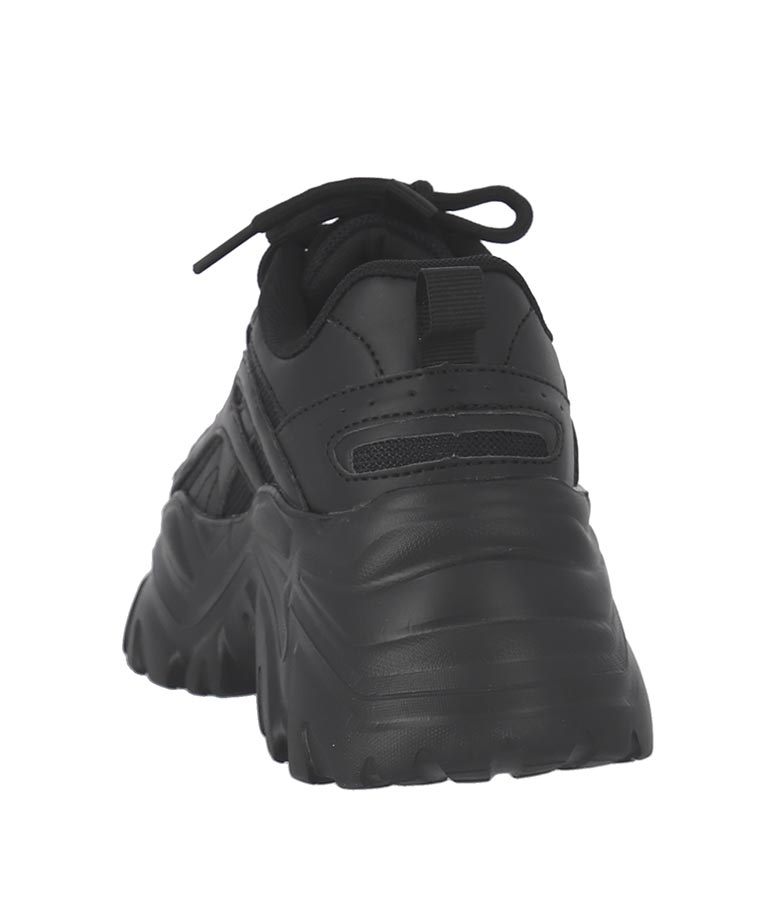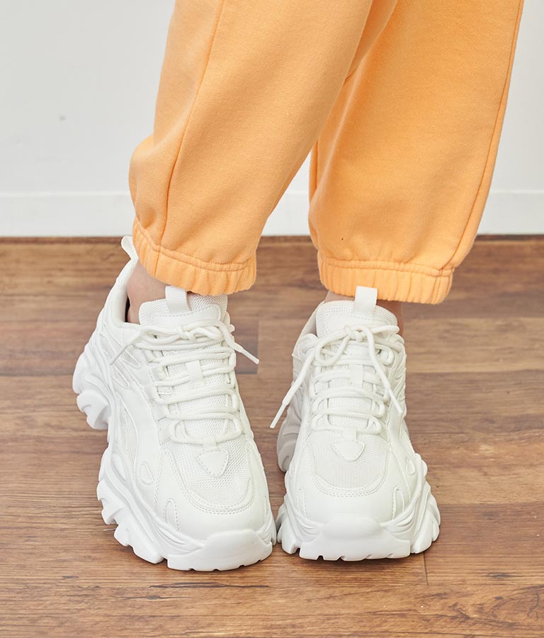シンプルな単色使いがクールな厚底スニーカー、 メンズライクな雰囲気ですが、どんなコーディネートにも馴染みやすいのがポイントです。