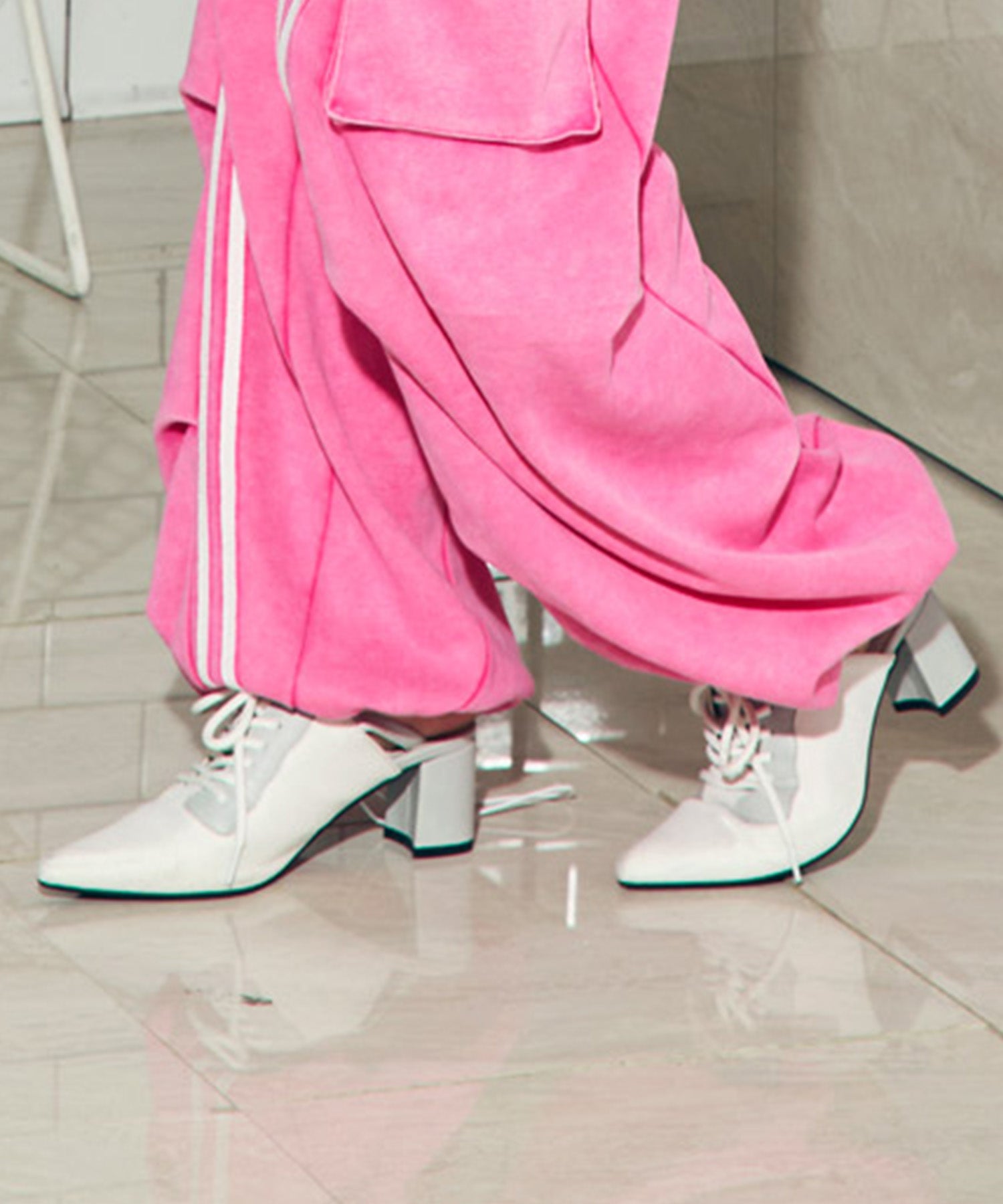 スニーカーライクなレースアップデザインに、ミュール仕様の抜け感を掛け合わせた一足。