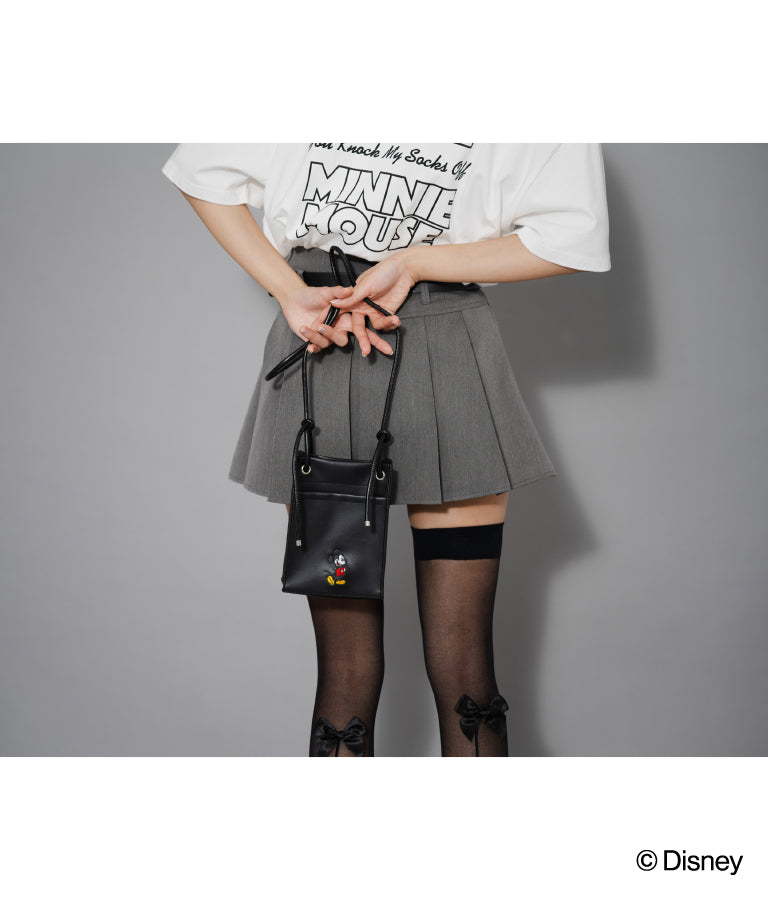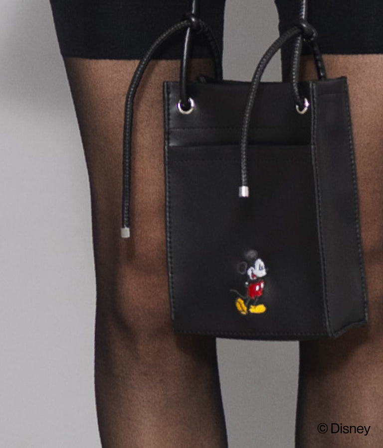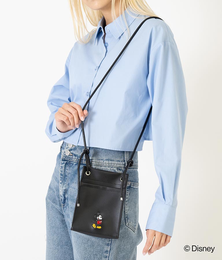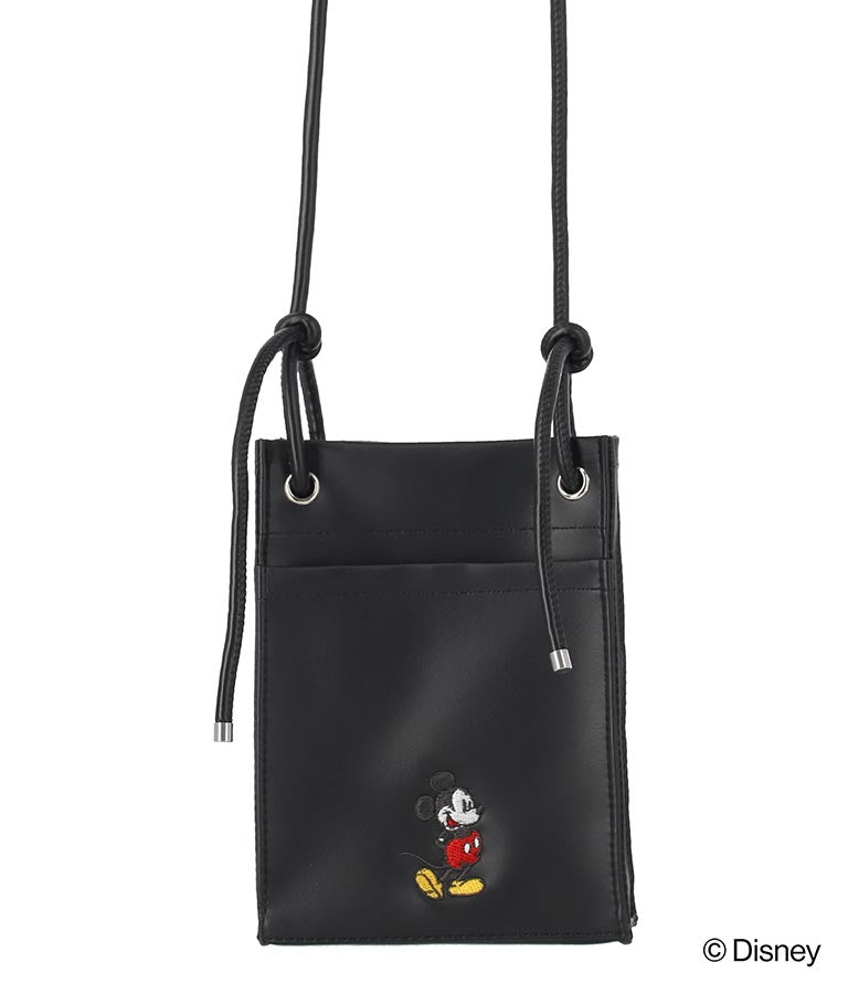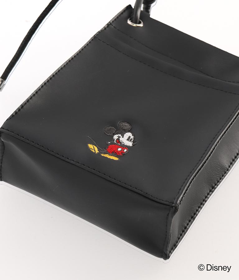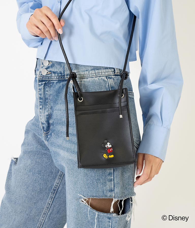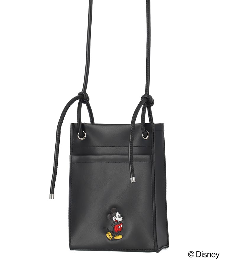 フェイクレザーのミニショルダーバッグは小さなミッキー刺繍を施したシンプルなデザインでどんなコーデにも合わせやすく、外側にスマホの入るポケットも付いているので使い勝手抜群。