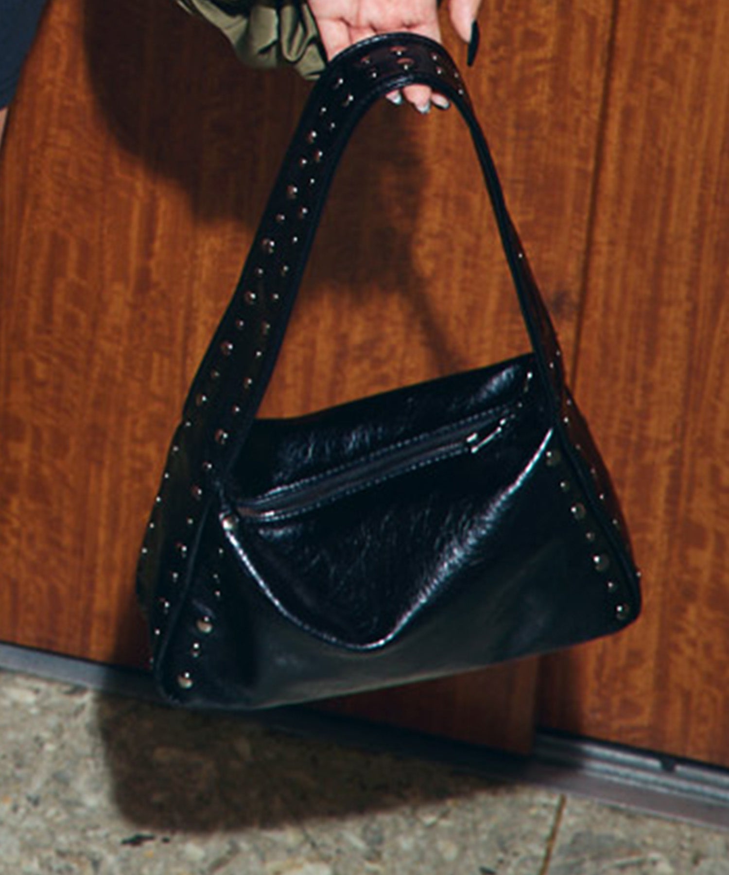 シンプルなフォルムに散りばめられたスタッズが、さりげなくスパイスを効かせるデザイン。