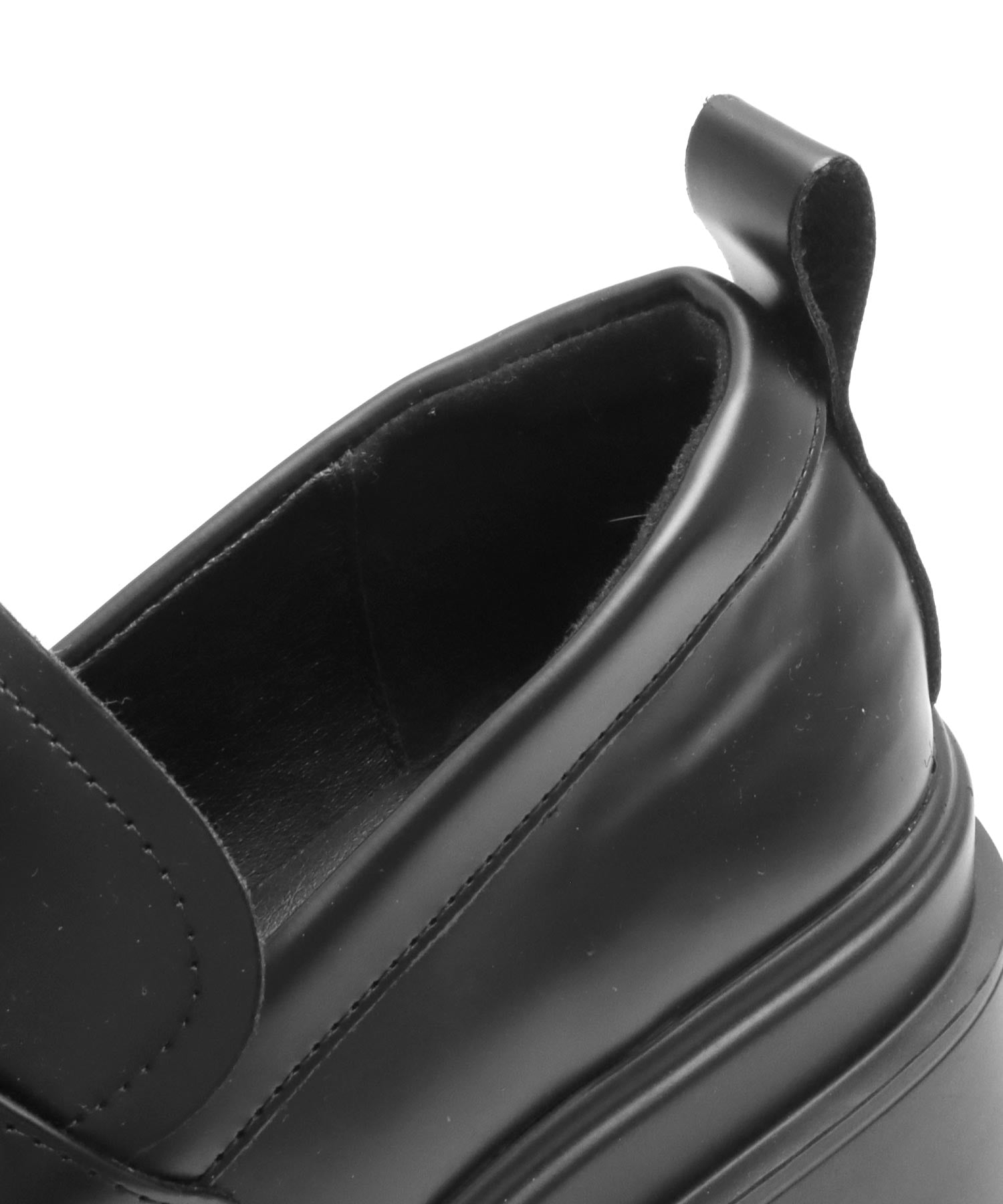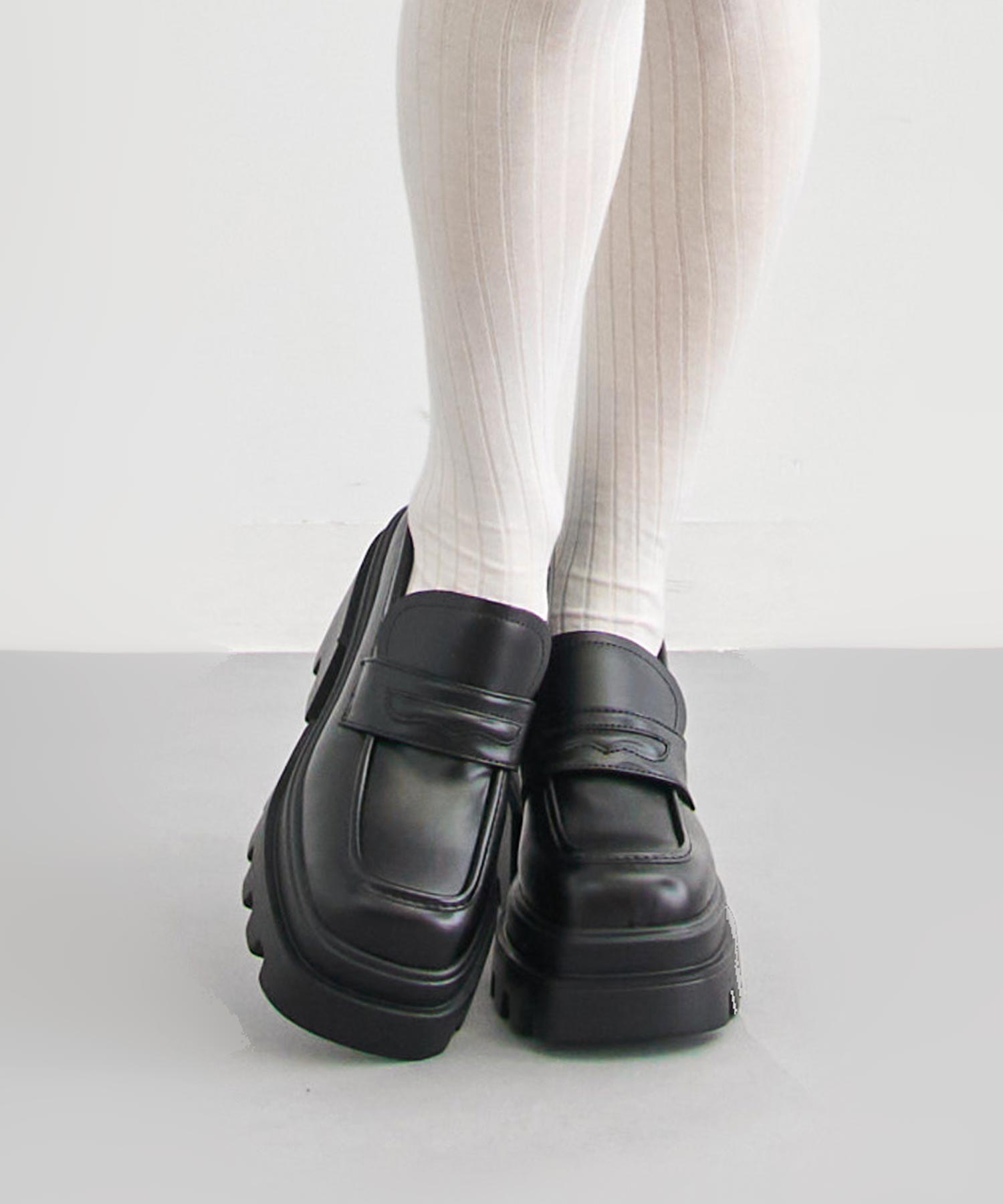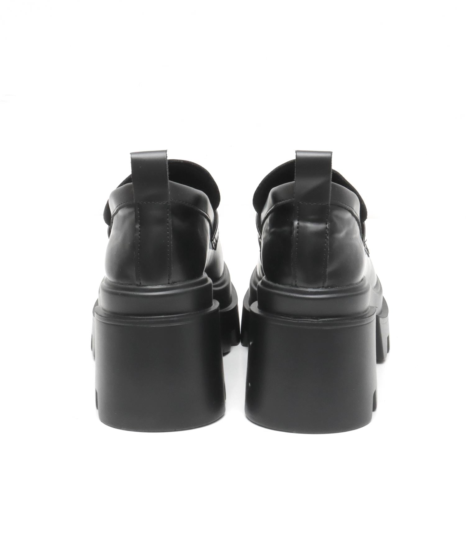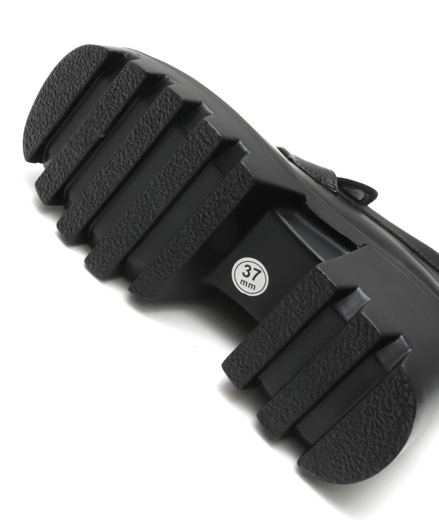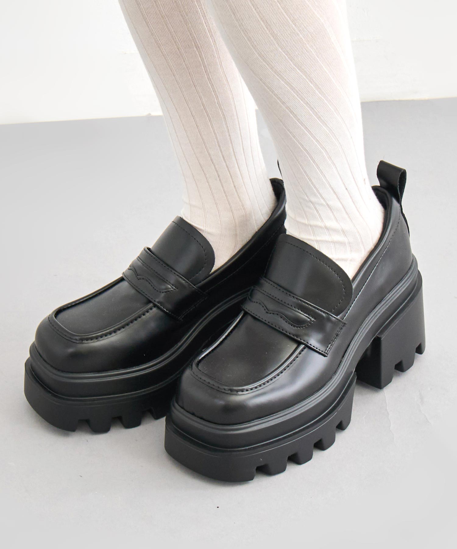ボリュームのある厚底ソールが自然なスタイルアップを叶え、重心を高めることで全身のシルエットを美しく整えます。存在感のあるタンクソールは安定感があり、見た目以上に歩きやすい設計。艶を抑えた上品なフェイクレザーがモードな雰囲気を演出し、程よい丸みのトゥラインが女性らしさもキープします。ローファーデザインならではのきちんと感がありながら、ストリートにも馴染む絶妙なバランスが魅力です。