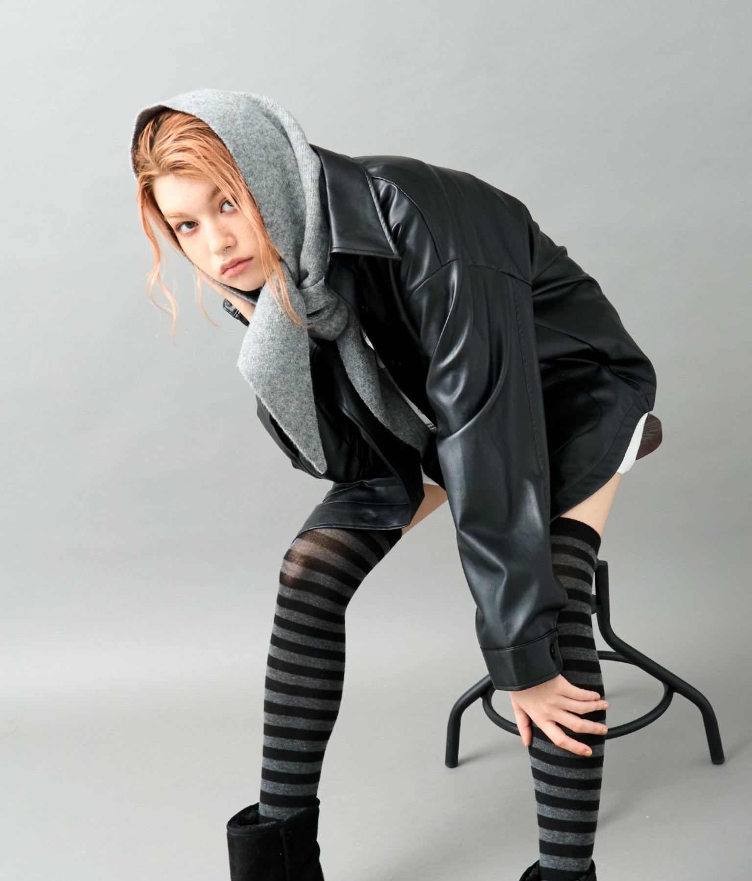 〇モードカジュアル → レザーJK×グレースカーフで都会的な雰囲気に
