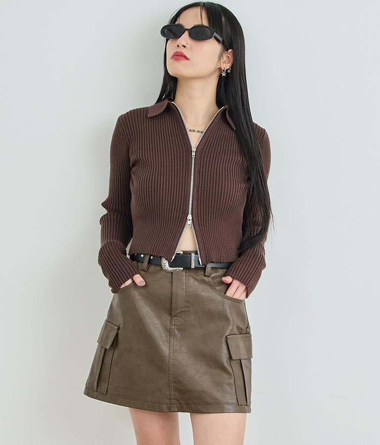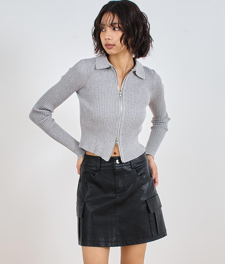 シンプルでどんなトップスにも合わせやすいフェイクレザーミニスカート。
