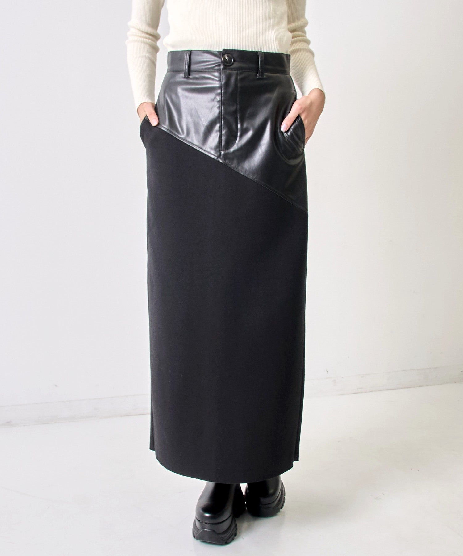 異素材のコントラストが描く、洗練シルエットのロングスカート。