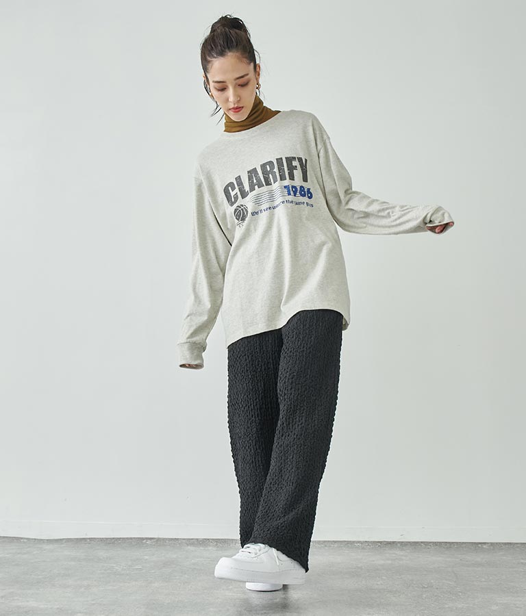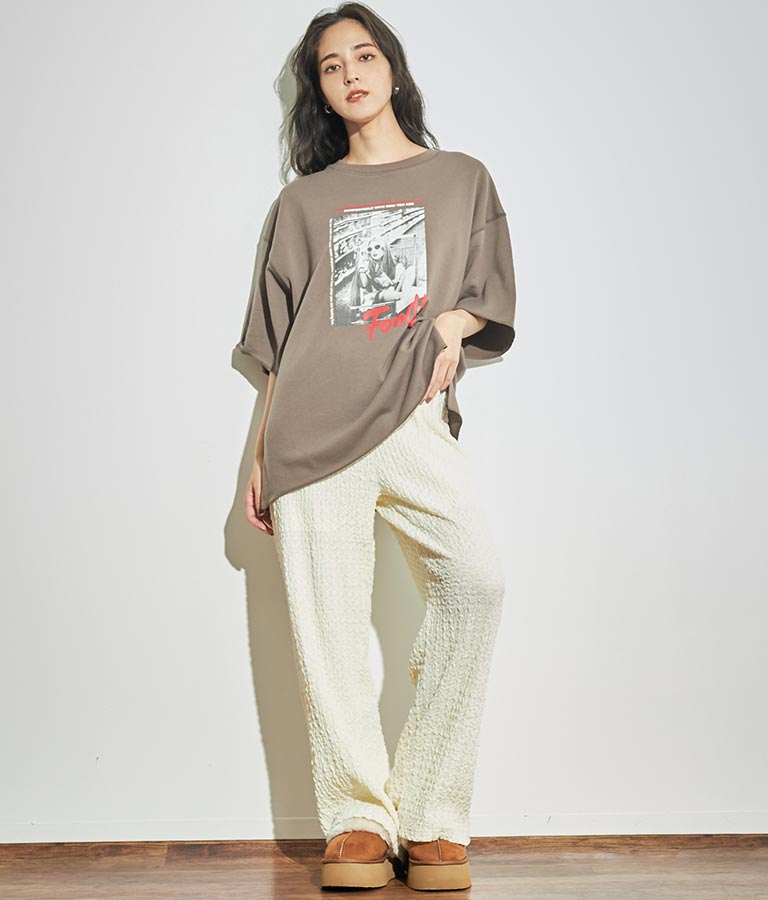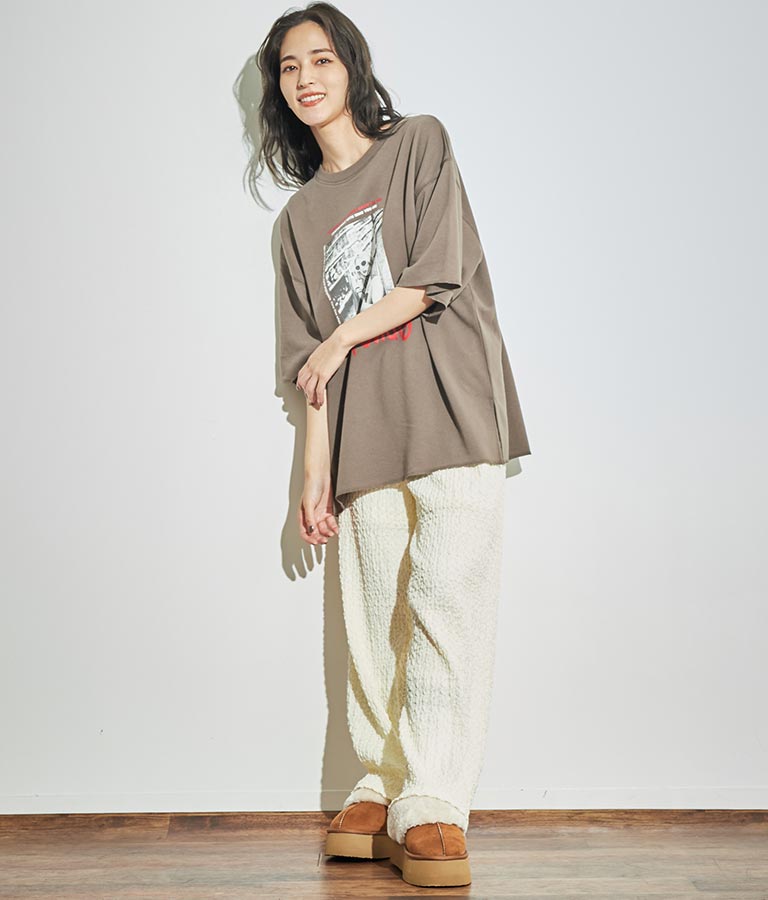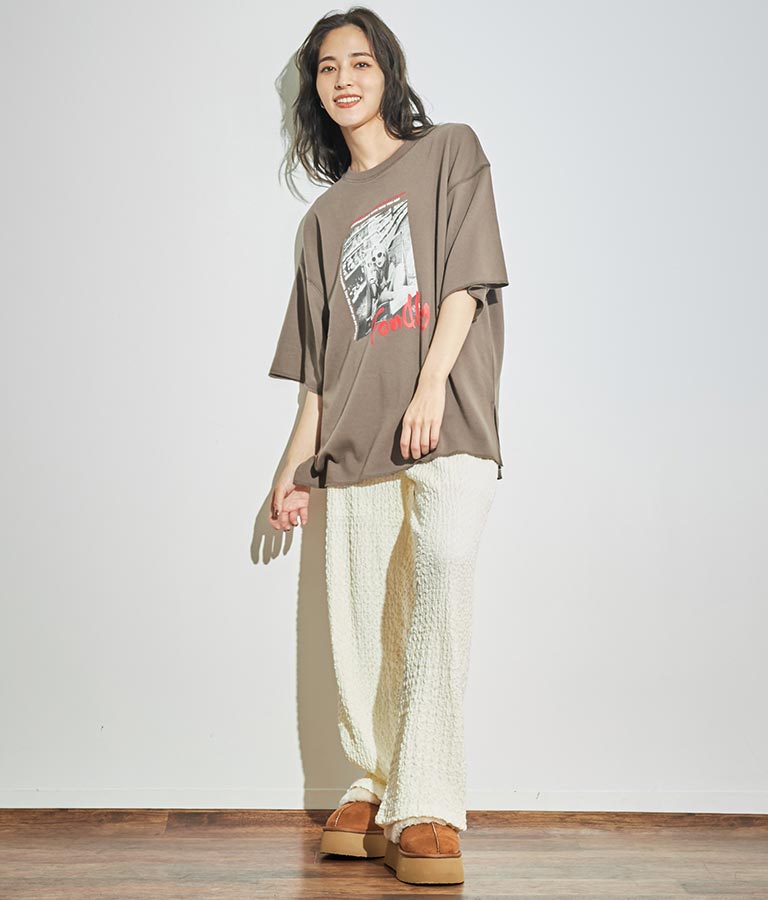 テクスチャーに表情があるためシンプルなトップスと相性が良いだけでなく、カジュアルなTシャツとの相性も抜群です。