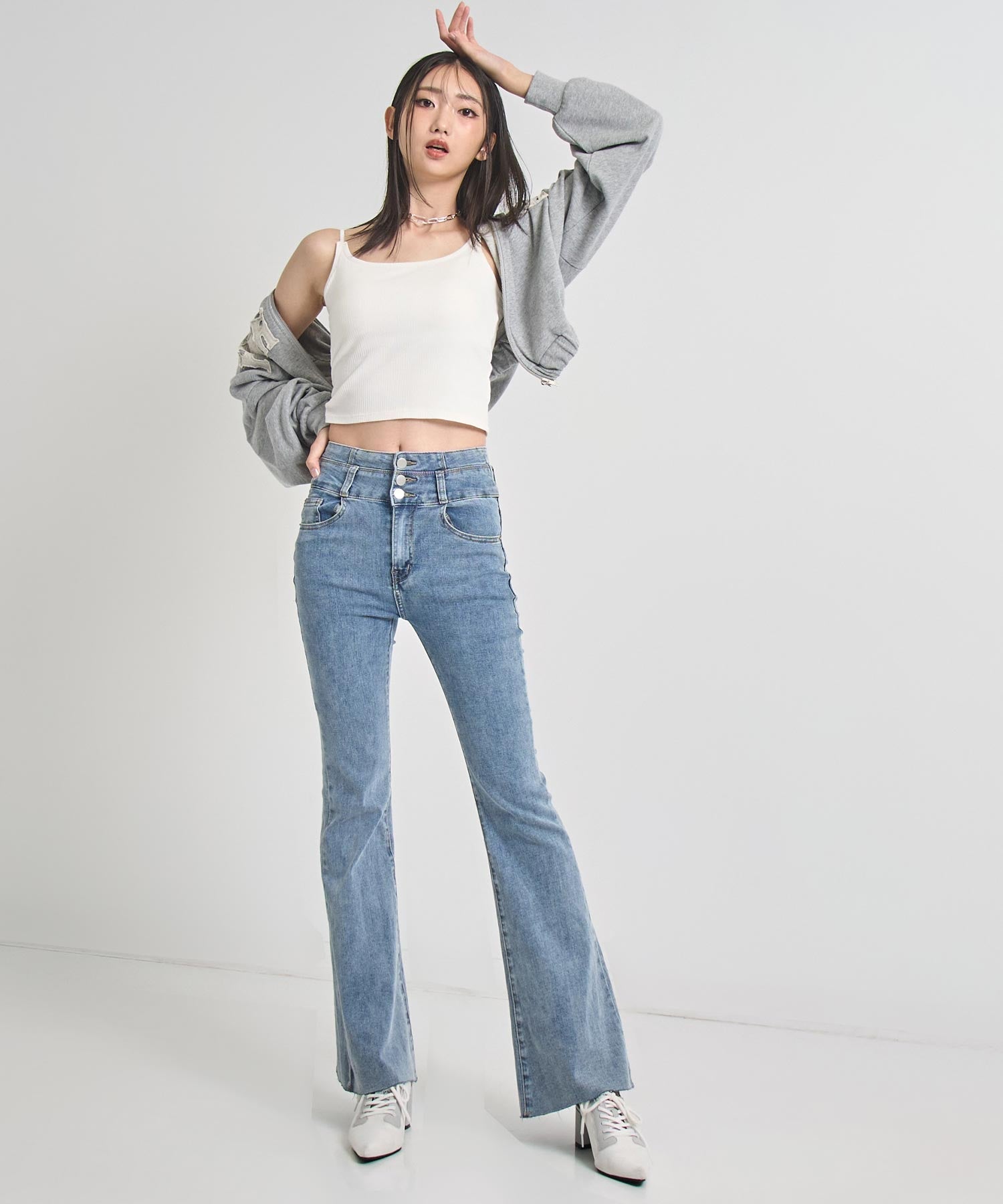 ハイウエスト仕様が腰位置を高く見せ、脚長効果を発揮。