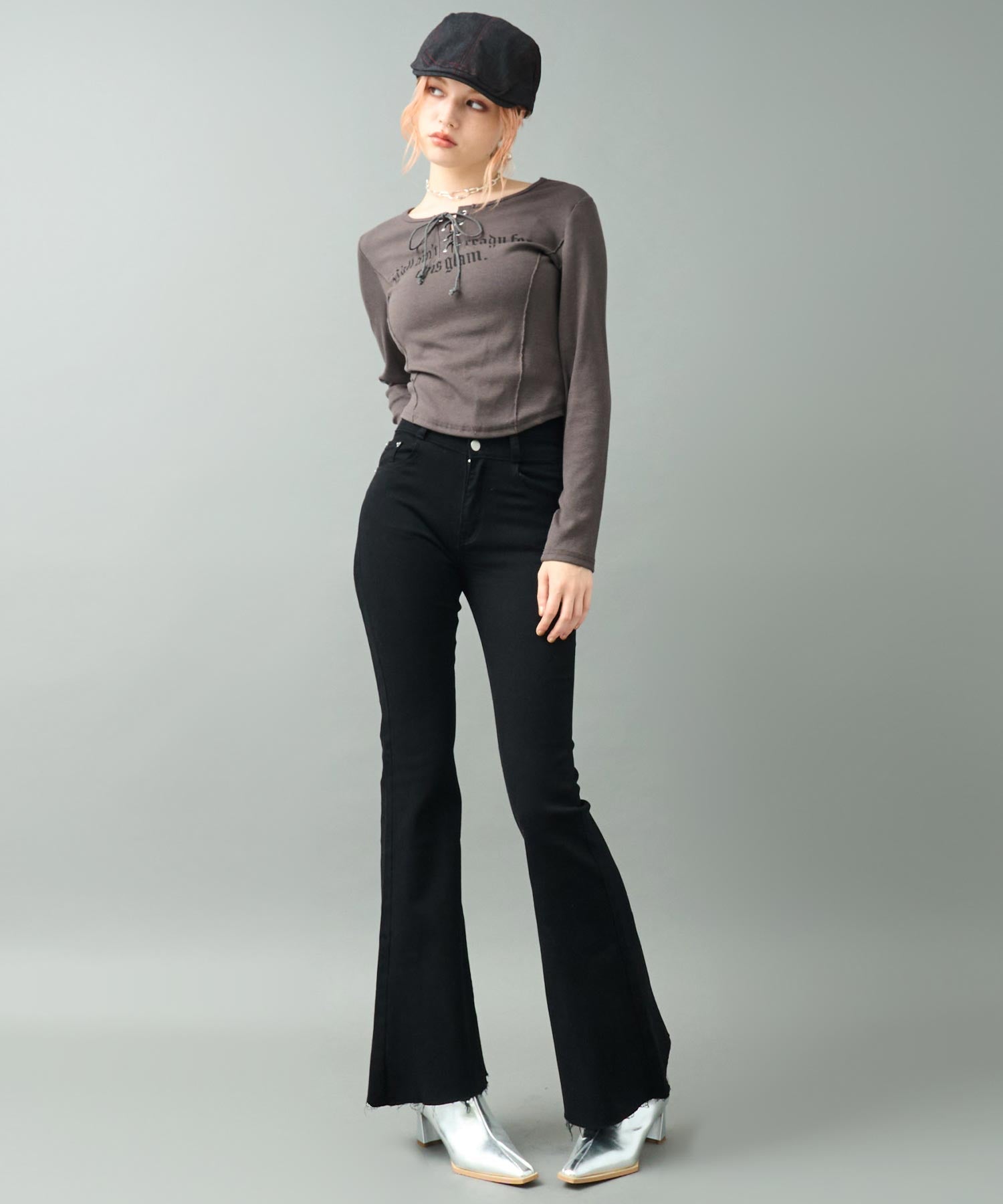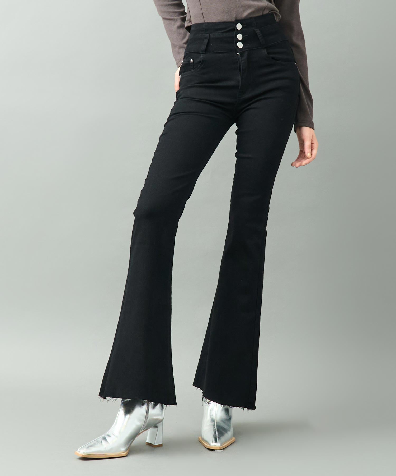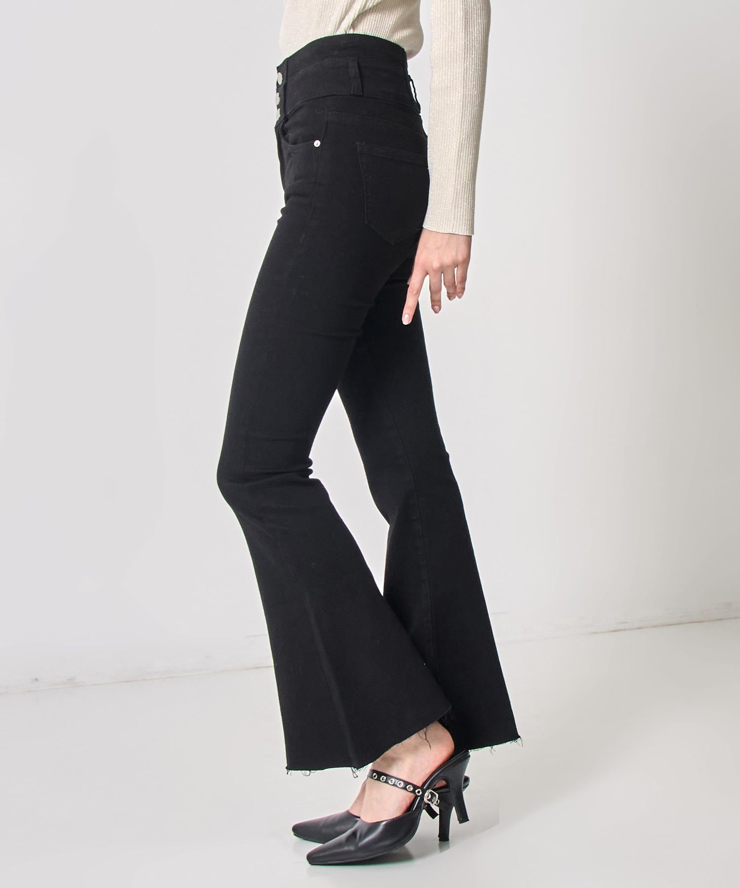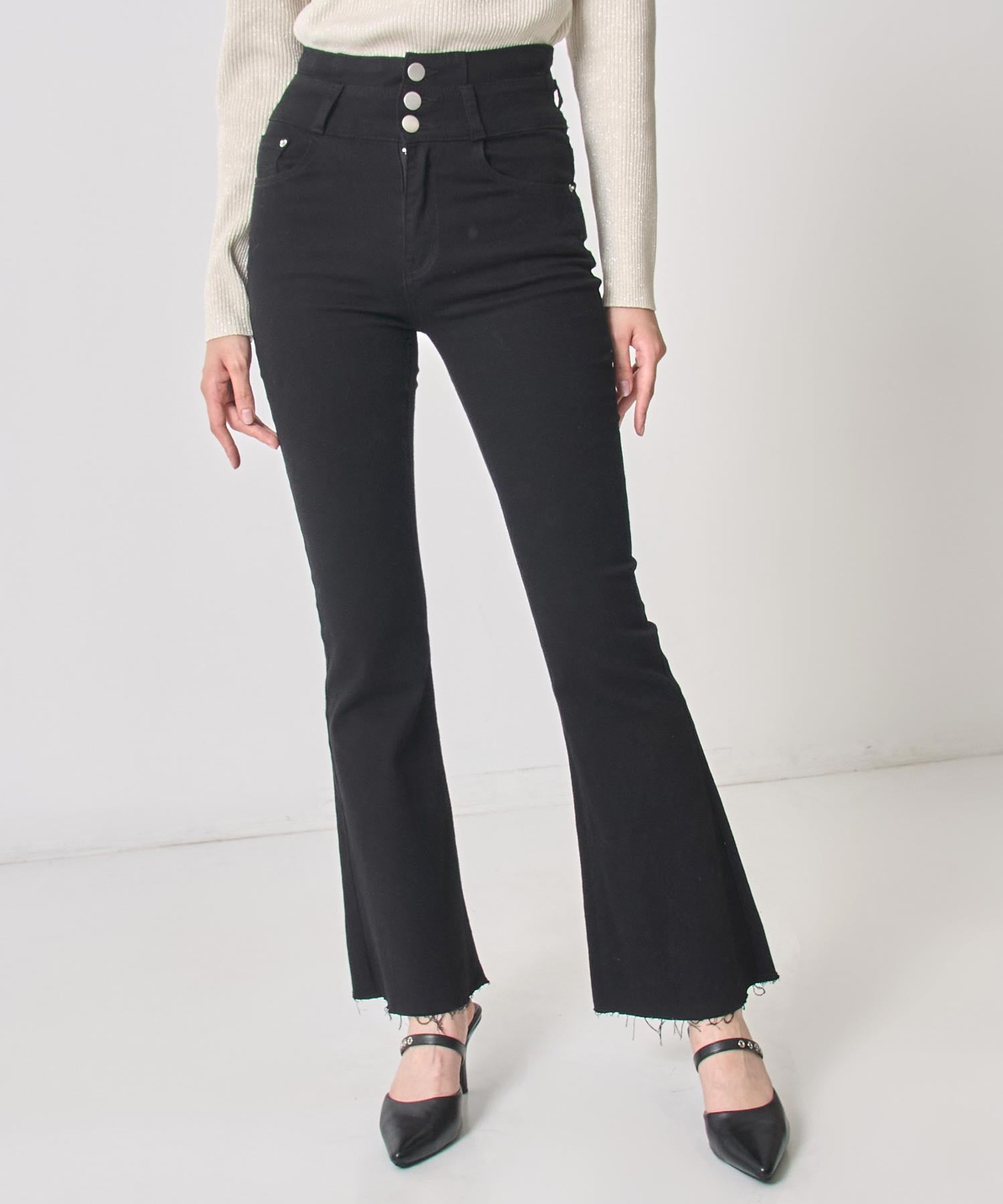 美脚ラインを引き立てるハイウエストストレッチフレアパンツ。