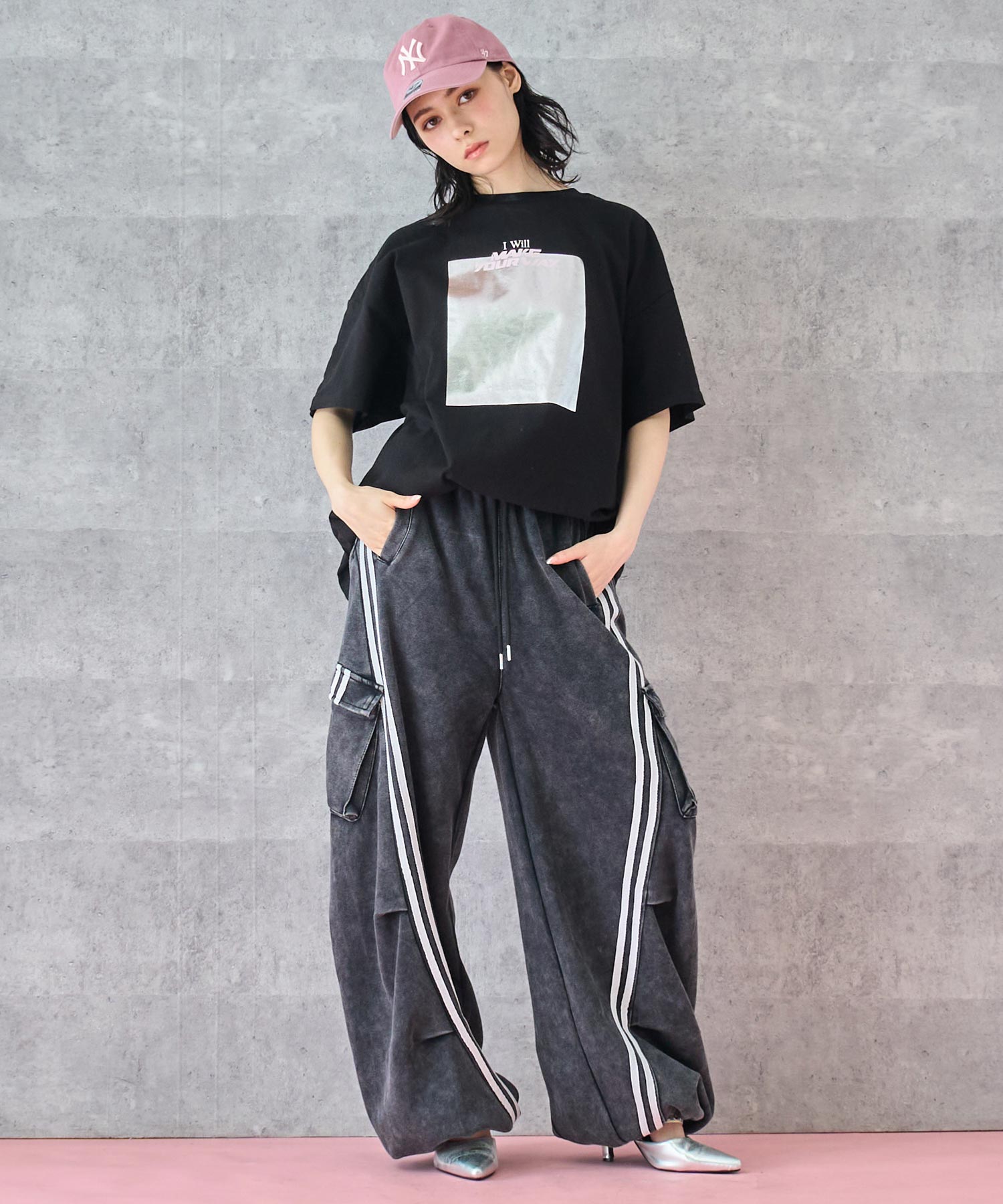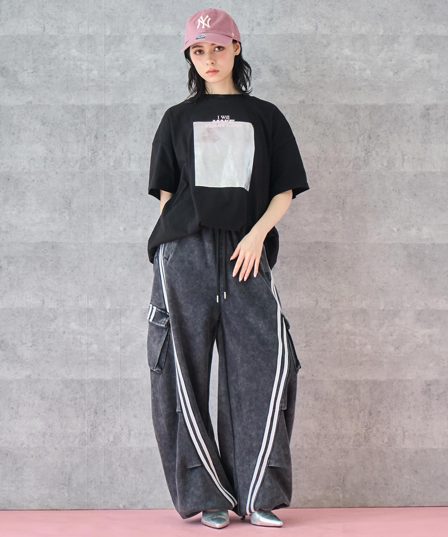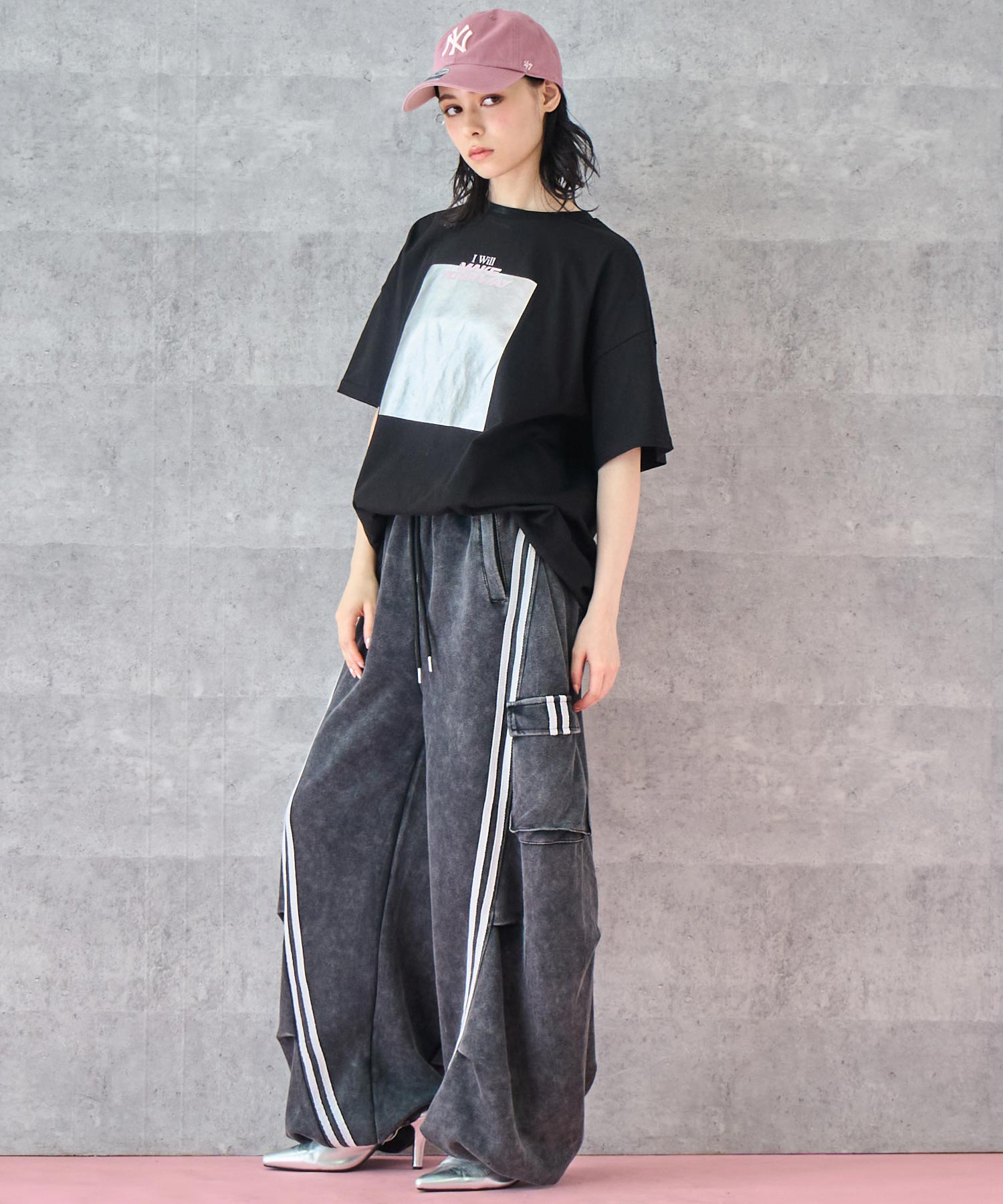 〇ストリートカジュアル→オーバーサイズのロゴTシャツとスニーカーでリラックスムードを演出。