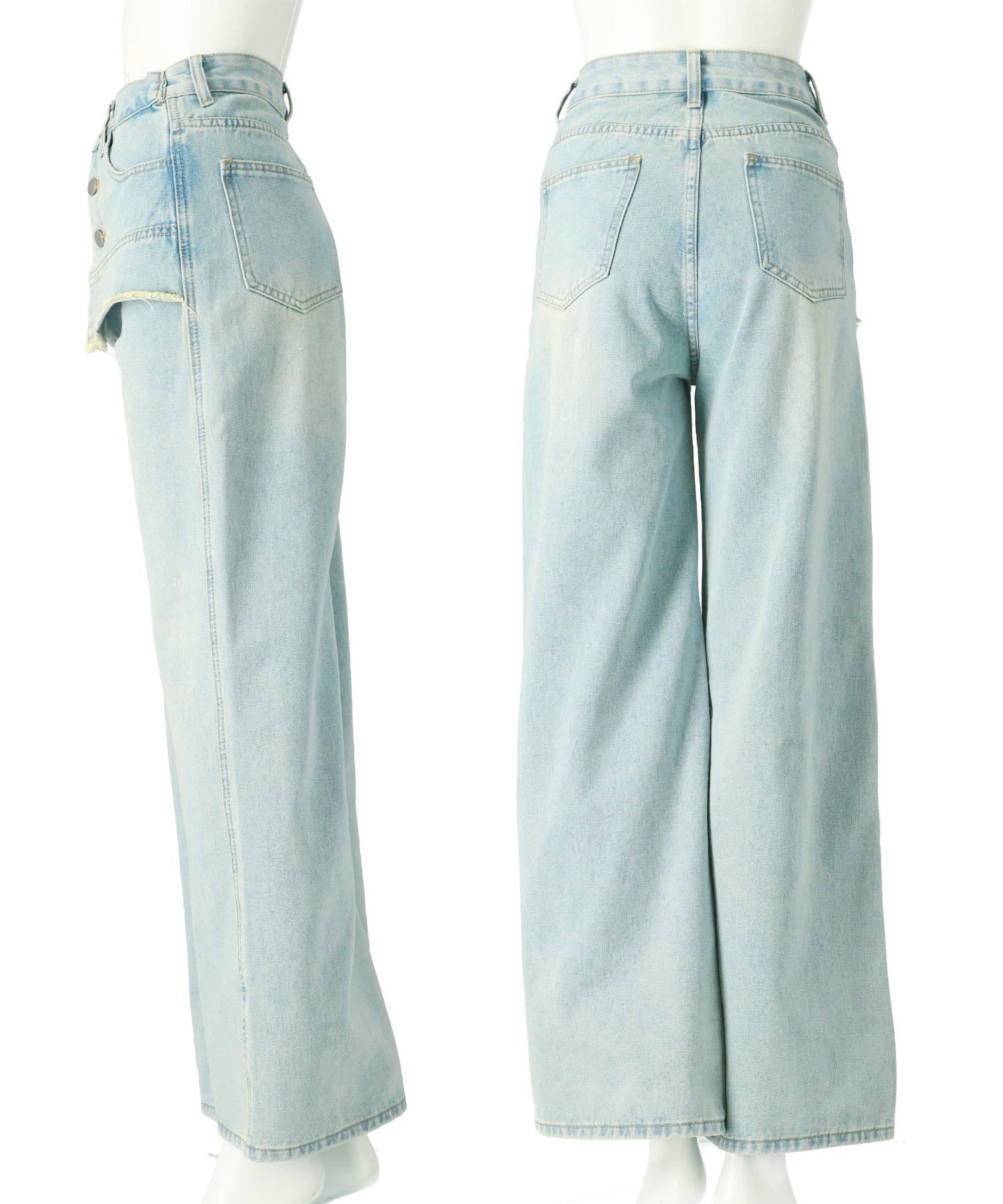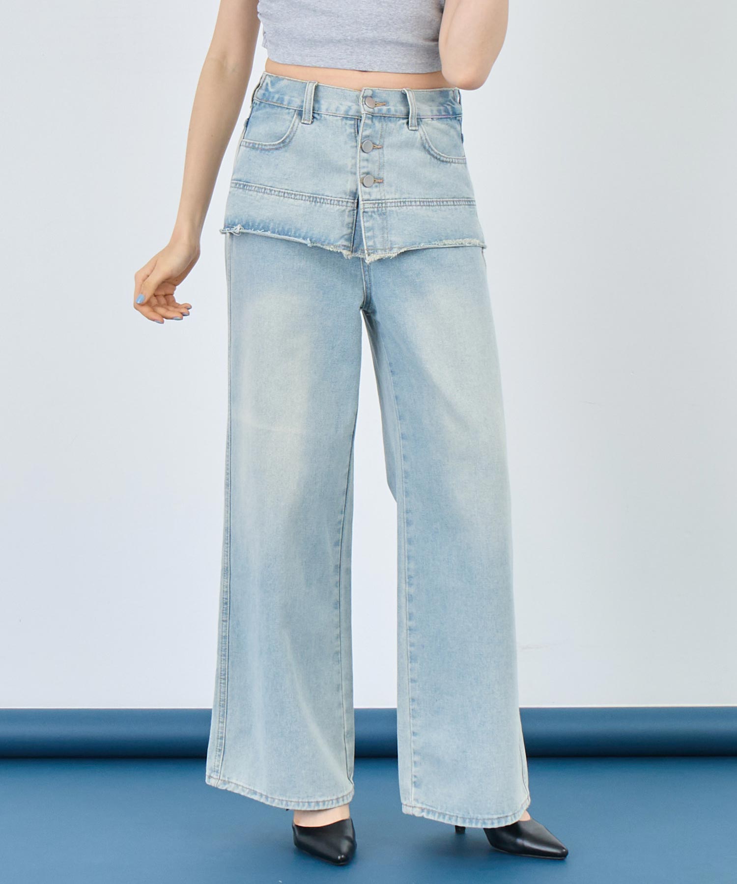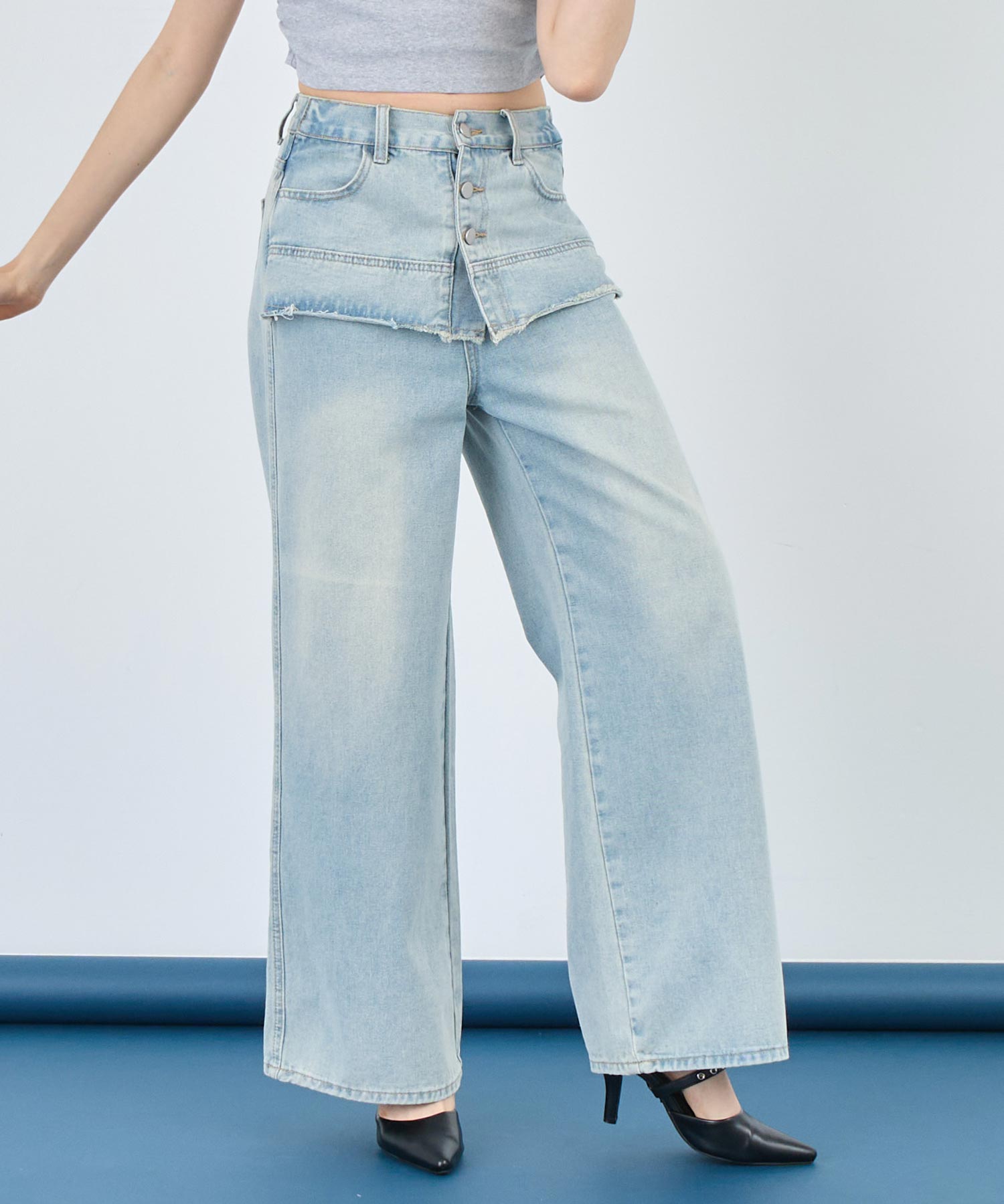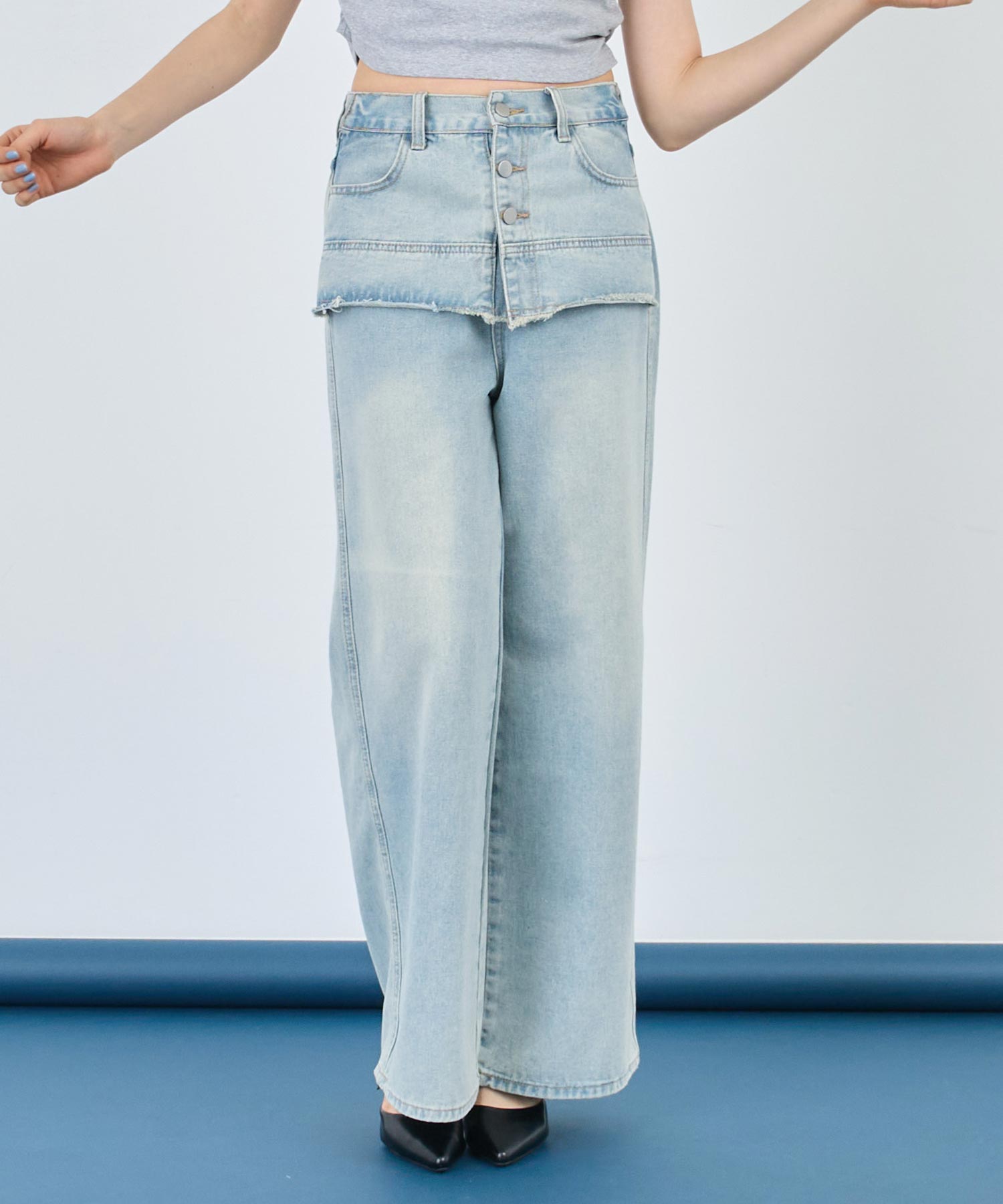 一見スカートをレイヤードしたような、ユニークな切り替えが目を引くデザインデニム。