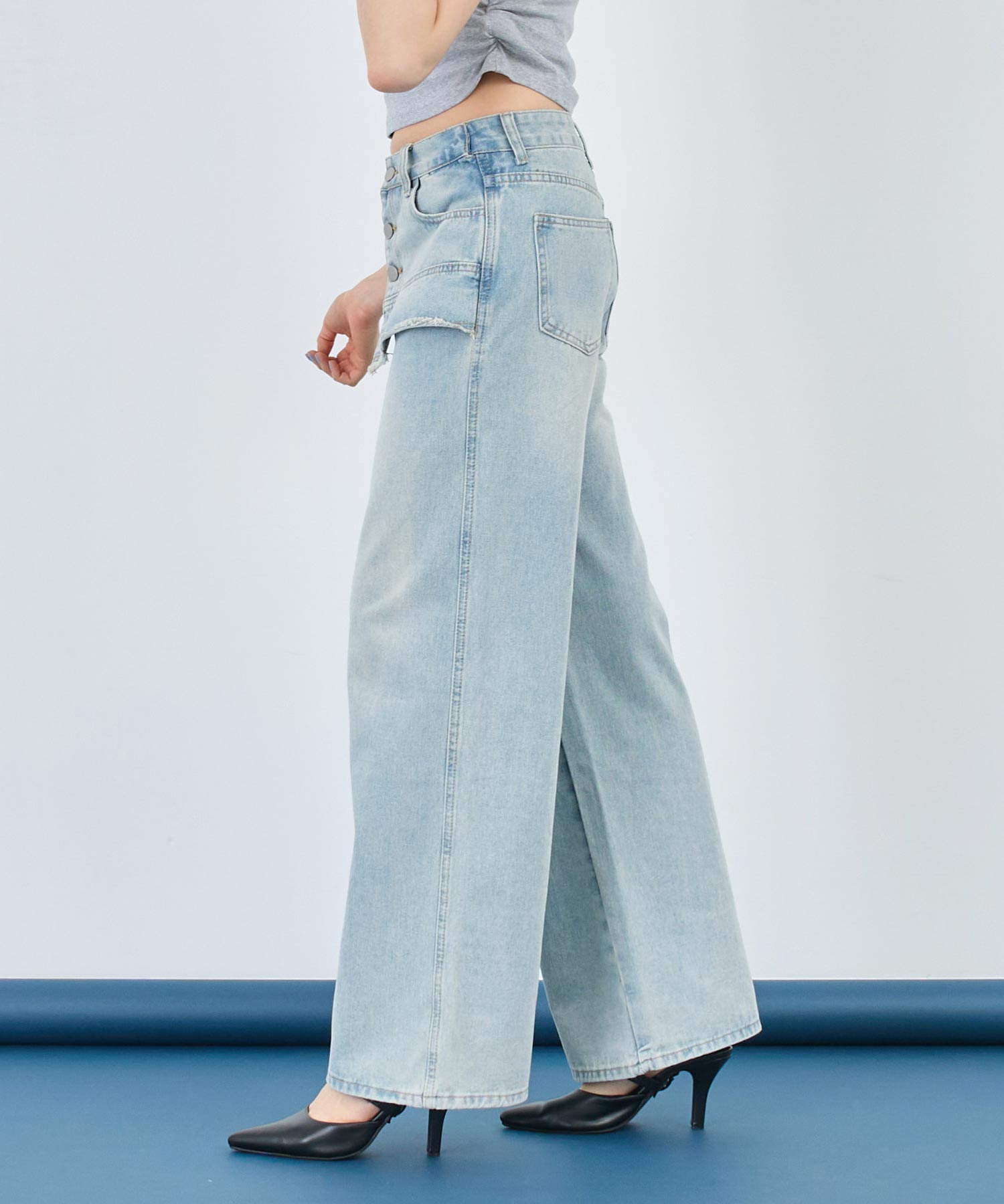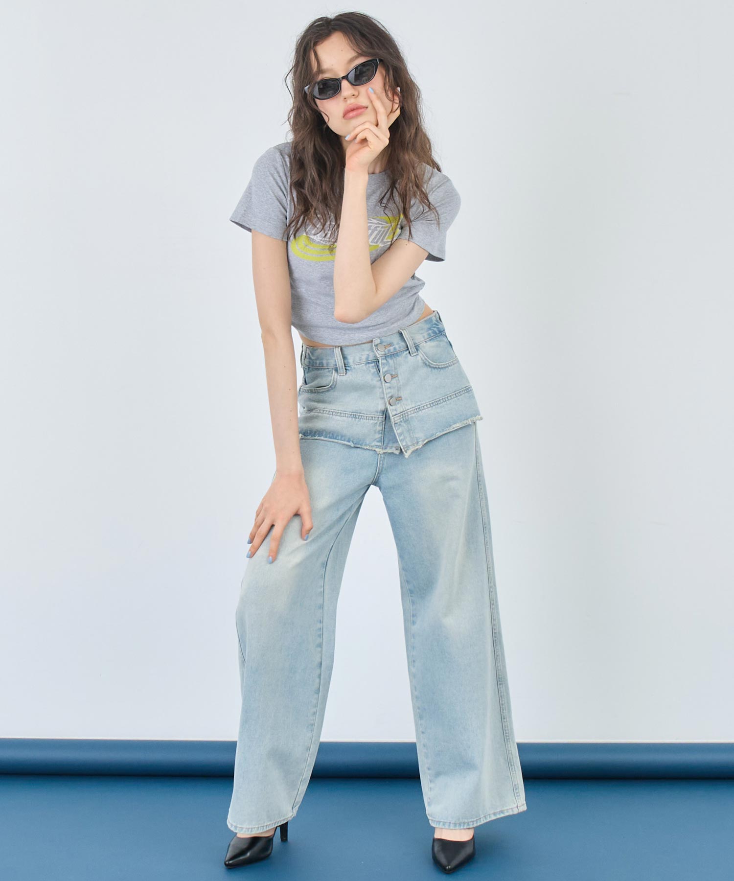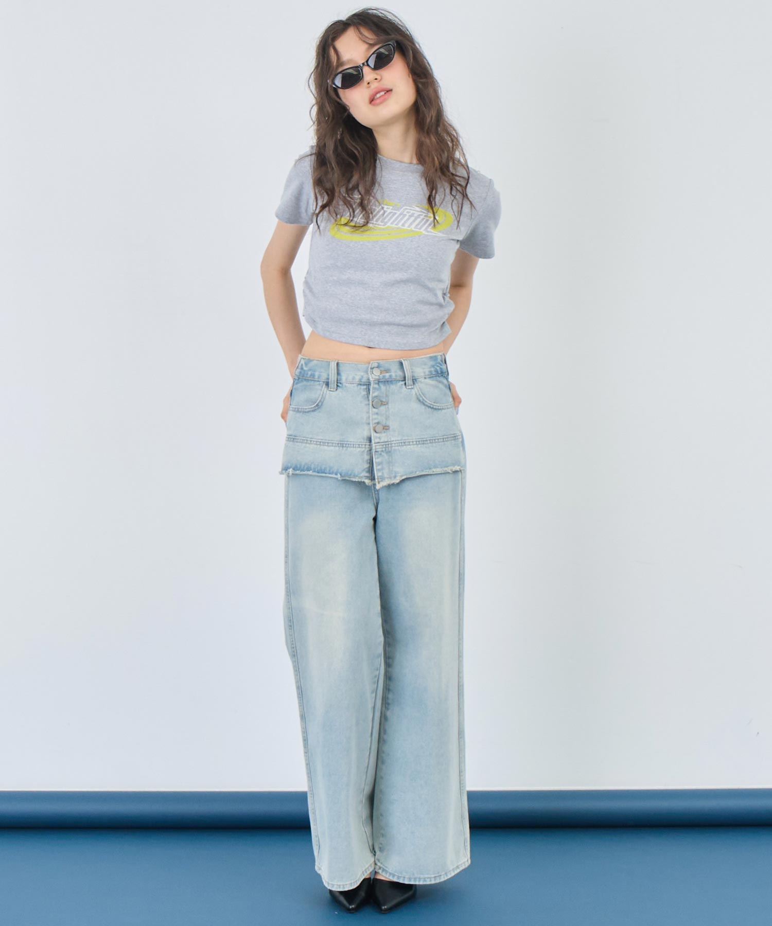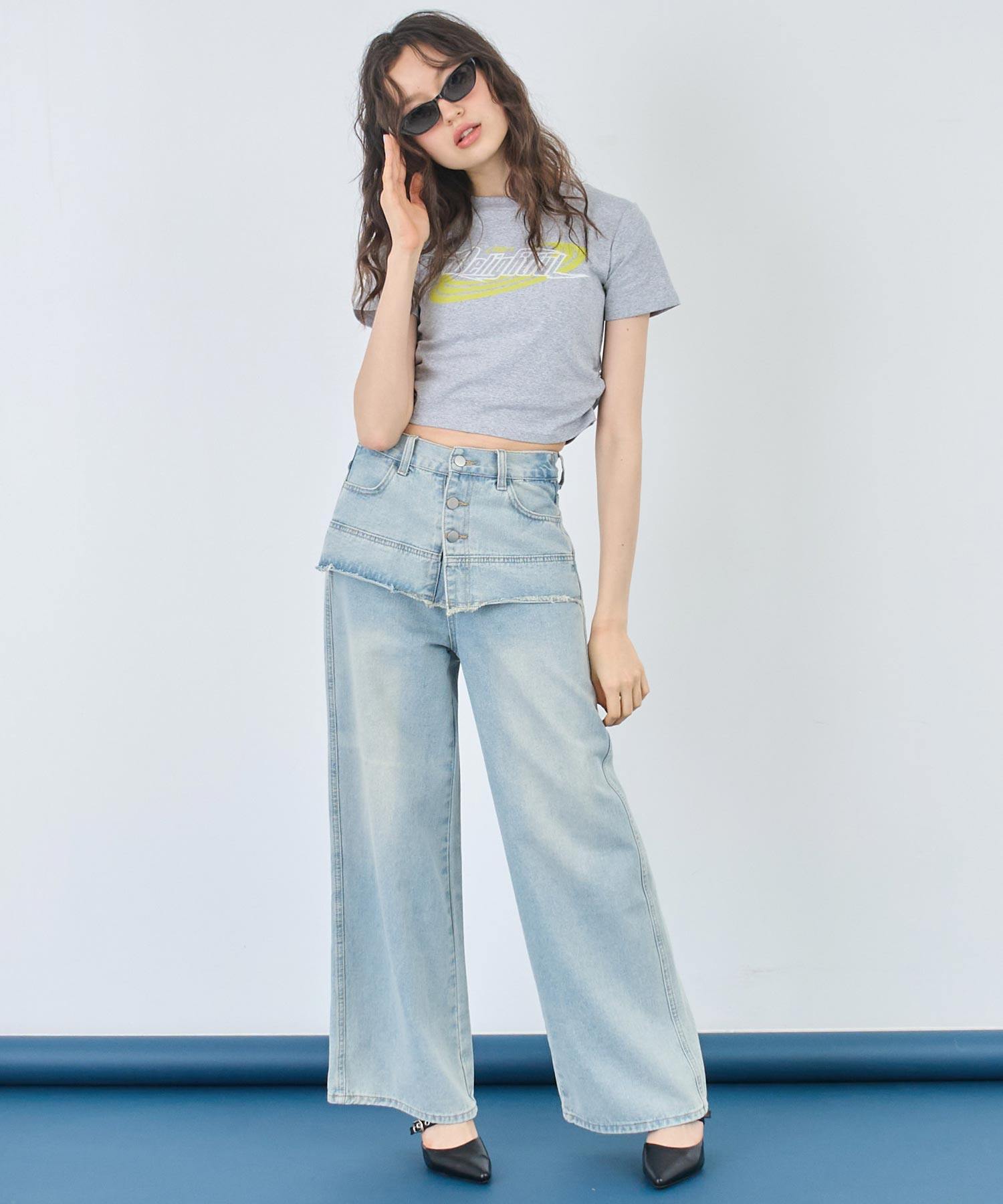 一見スカートをレイヤードしたような、ユニークな切り替えが目を引くデザインデニム。