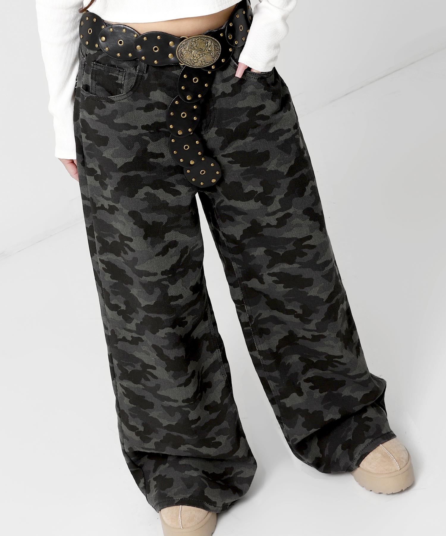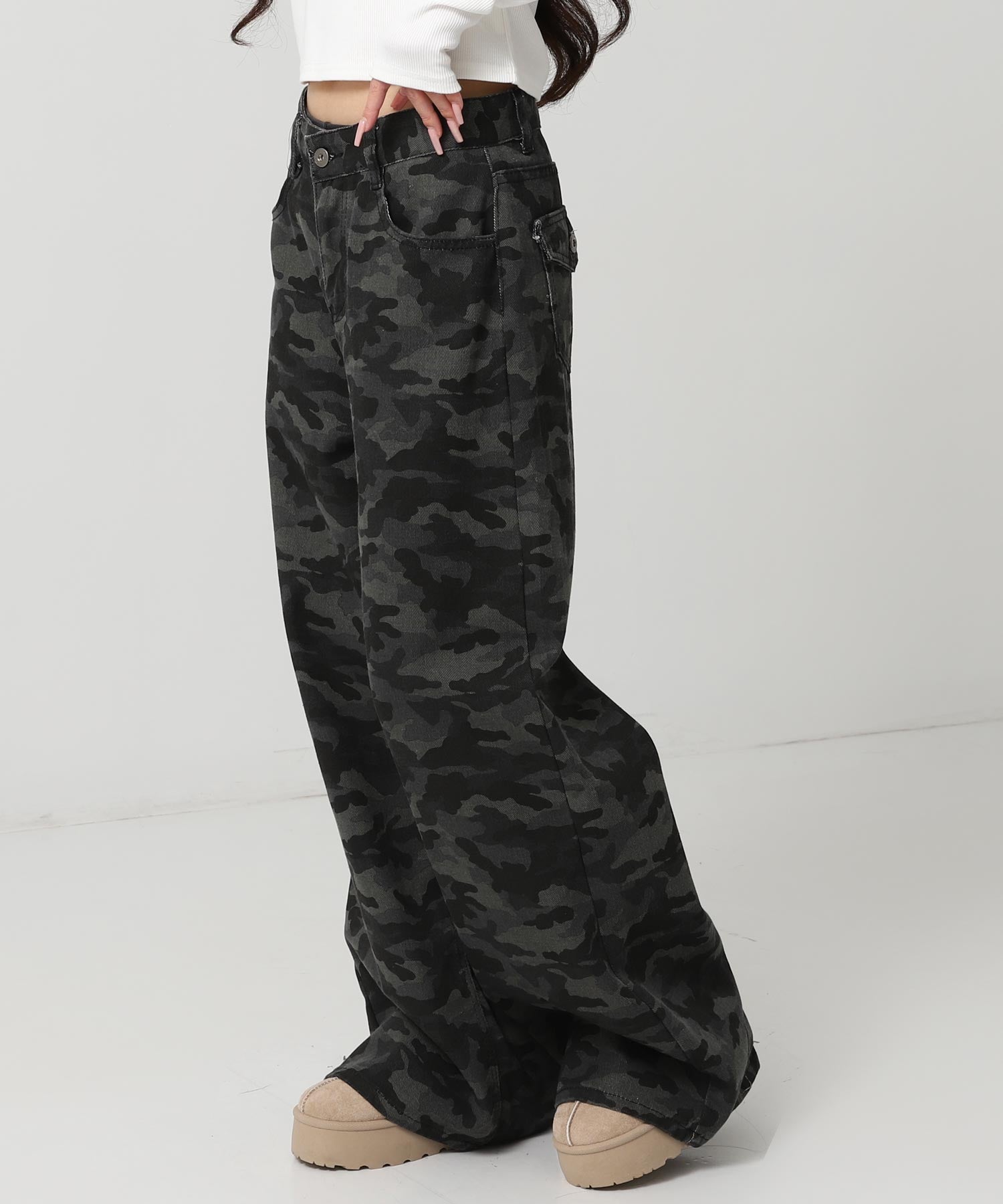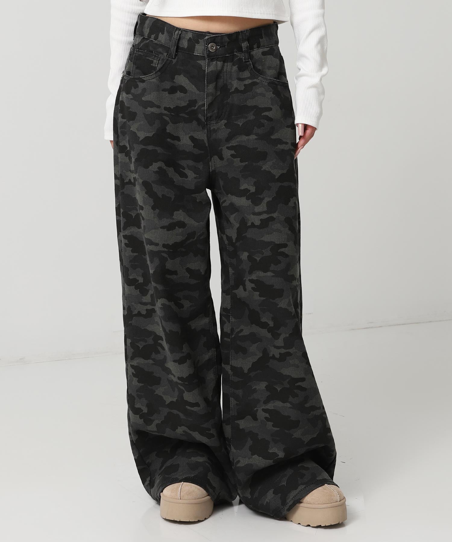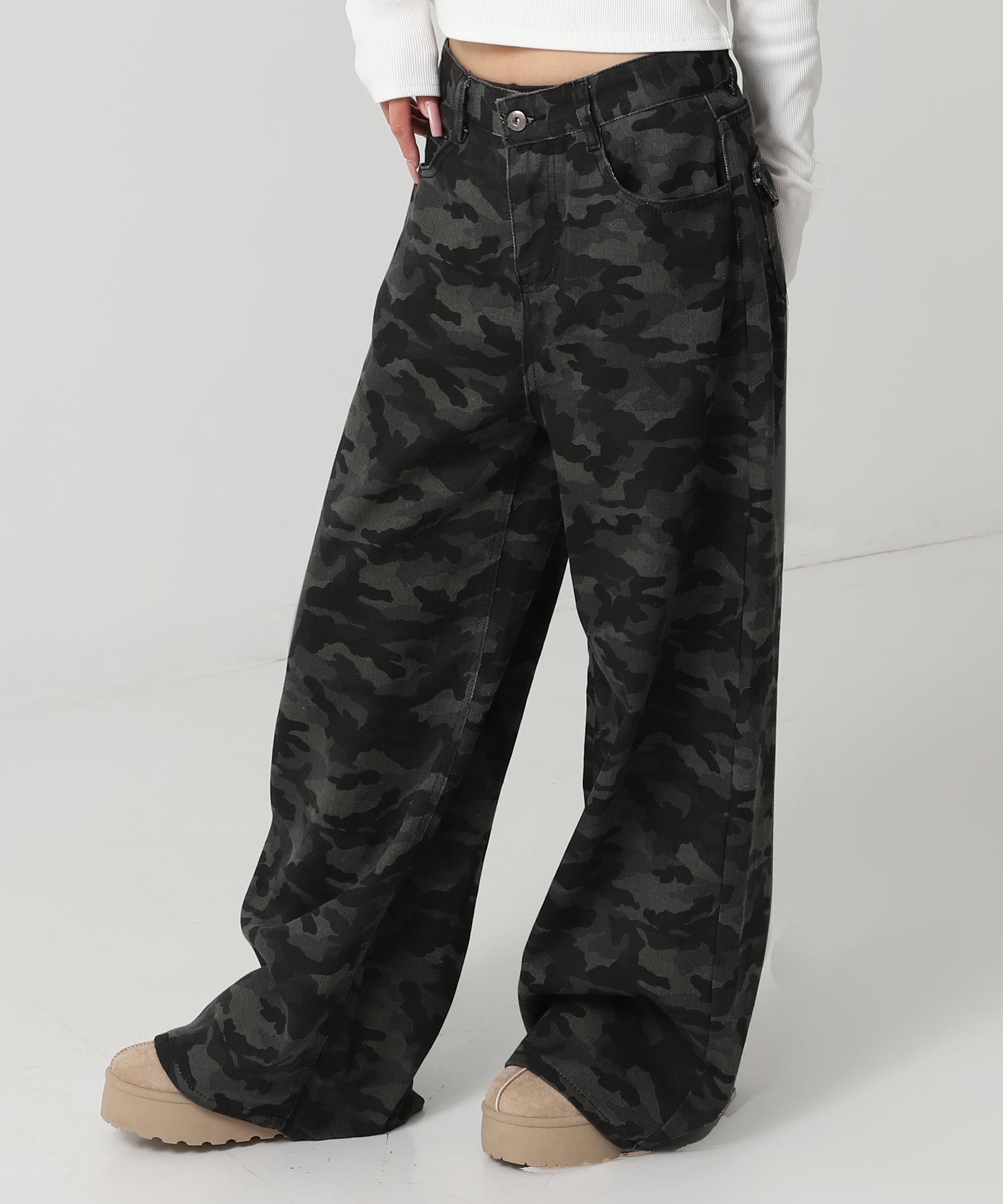 ユニセックスなムード漂うカモフラージュ柄のワイドデニム。
