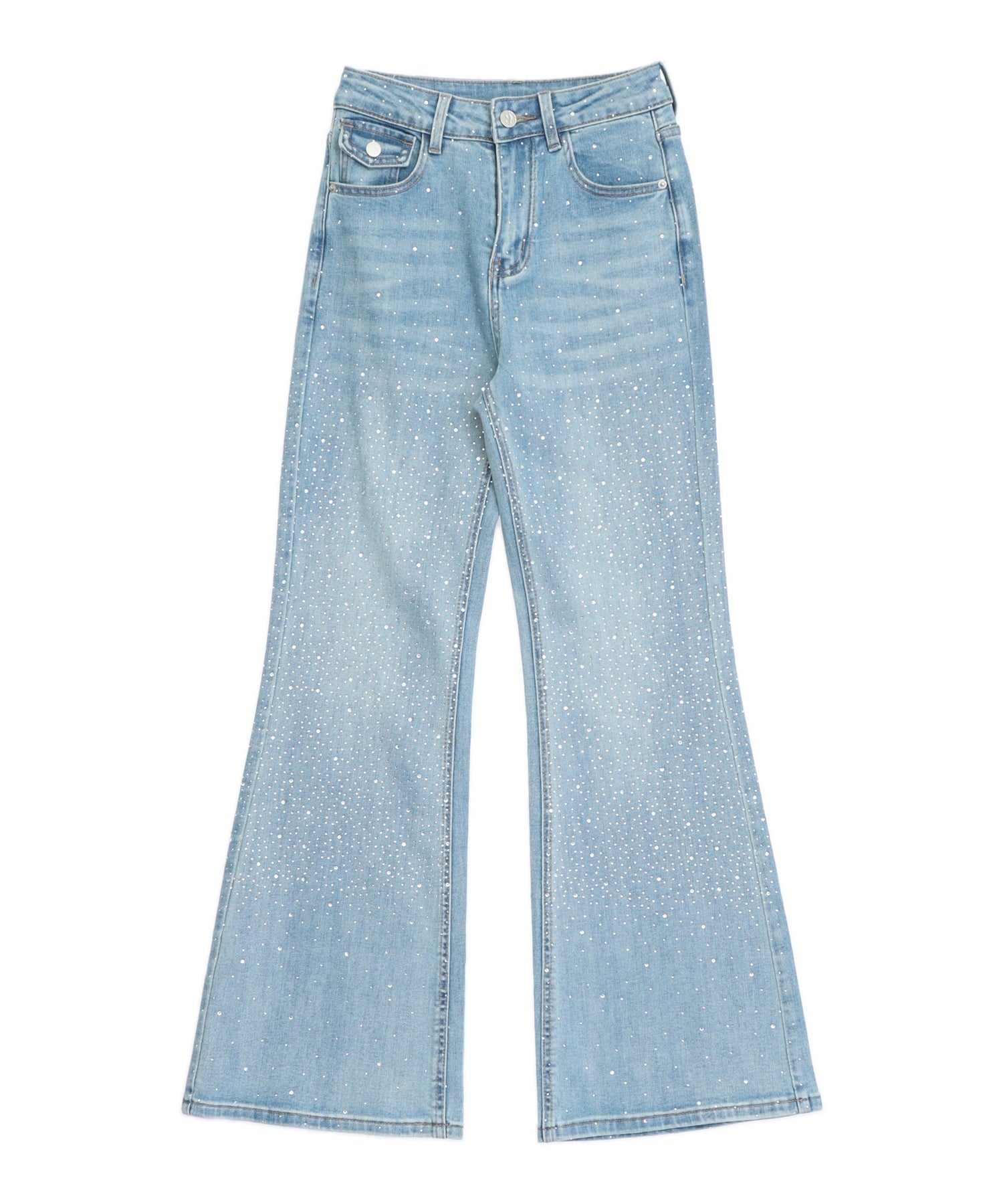 全面に散りばめられたラインストーンが光を受けて上品に煌めき、シンプルなトップス合わせでも印象的な存在感を発揮。