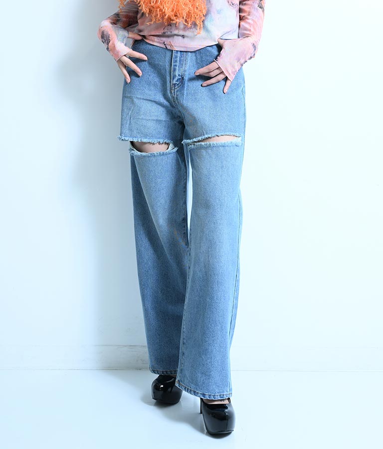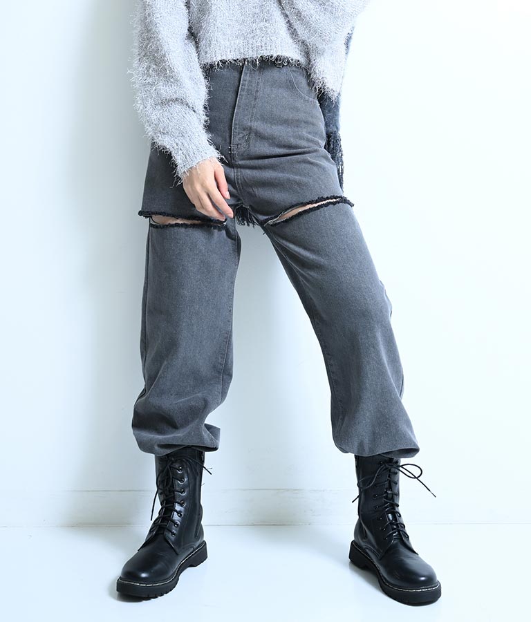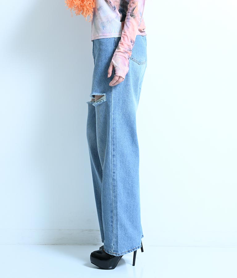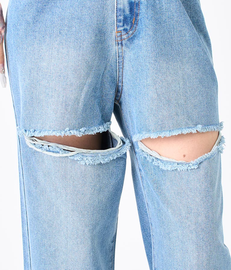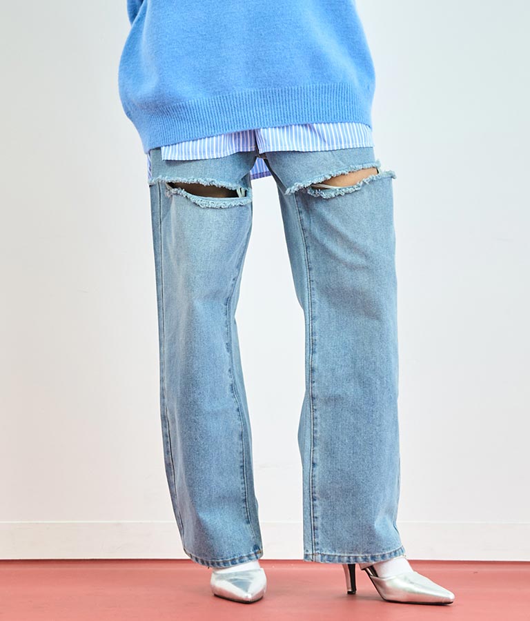 両太もも部分を大胆にカットしたデザインがヘルシーな肌見せを叶えてくれるダメージパンツ。