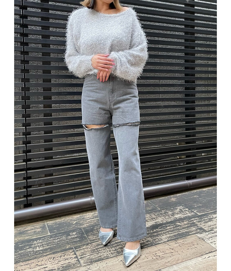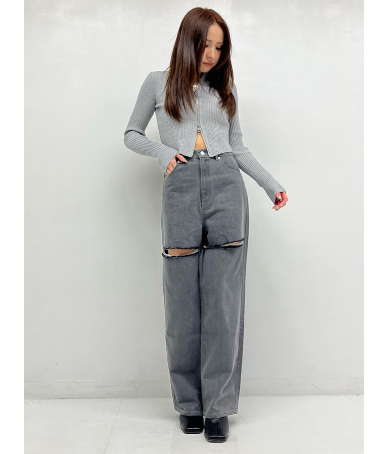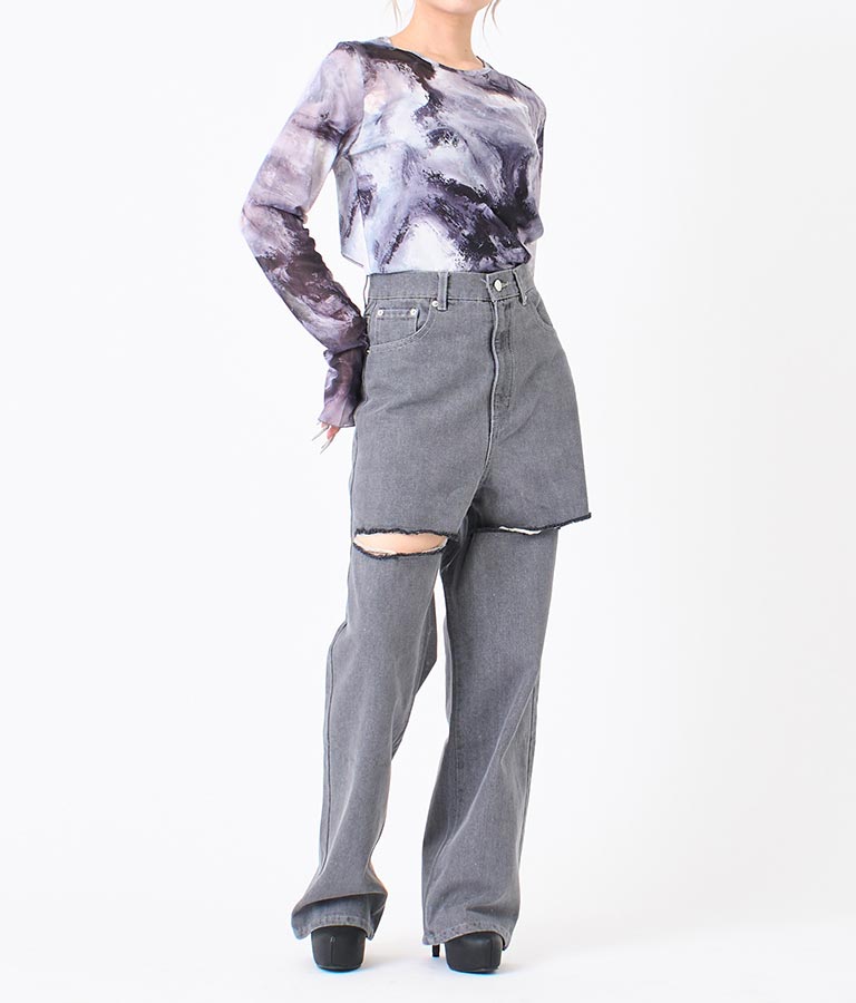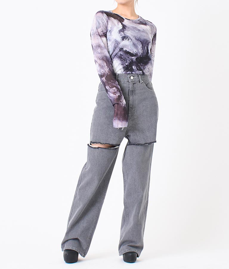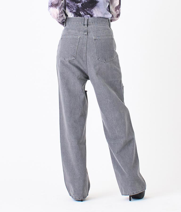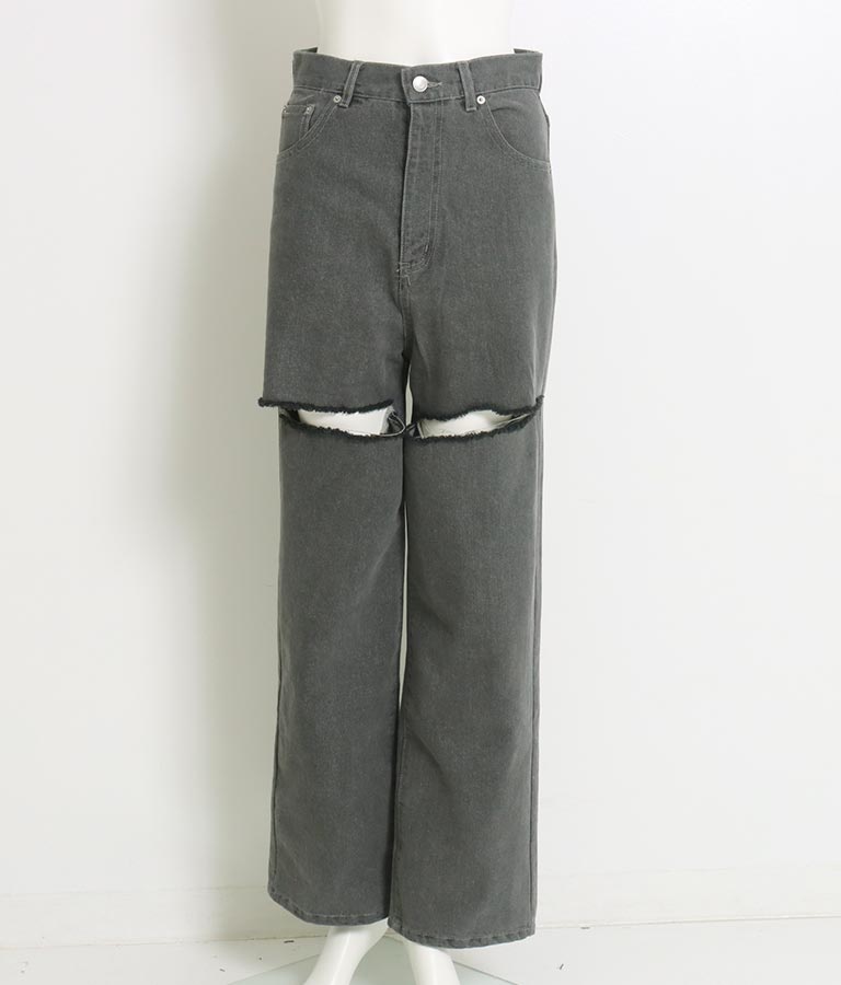 両太もも部分を大胆にカットしたデザインがヘルシーな肌見せを叶えてくれるダメージパンツ。