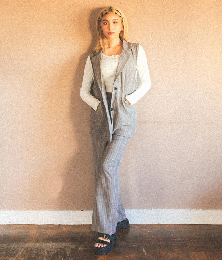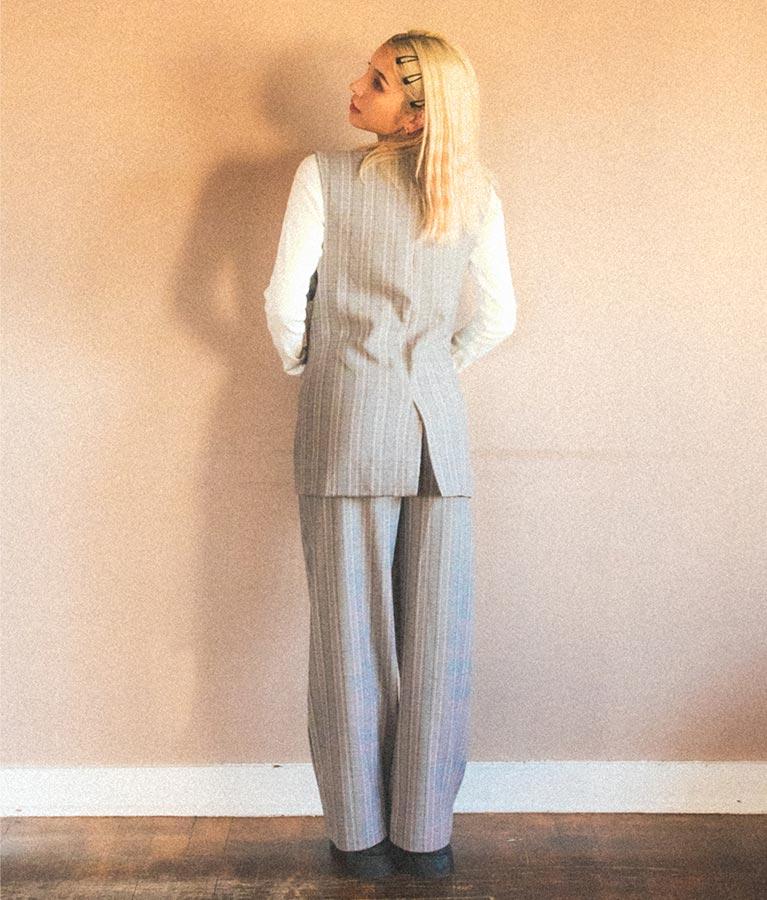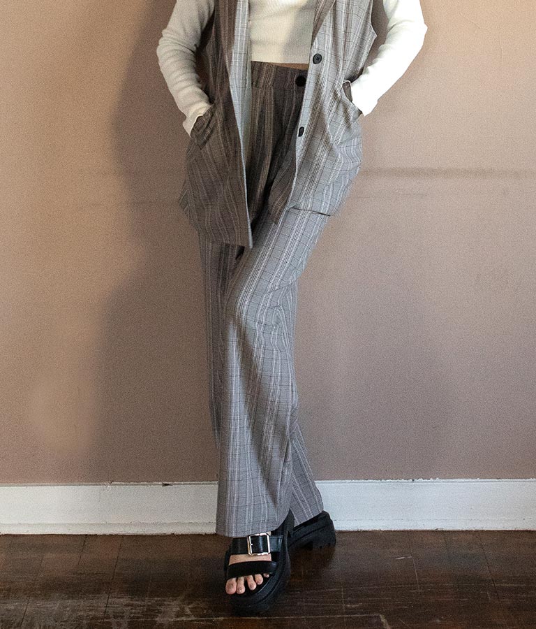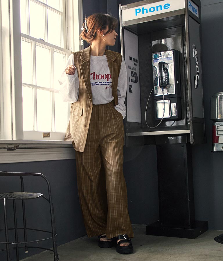 同生地を使用した【チェックベスト】とセットアップの着用もおすすめです。