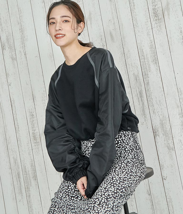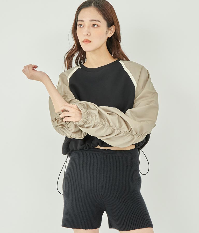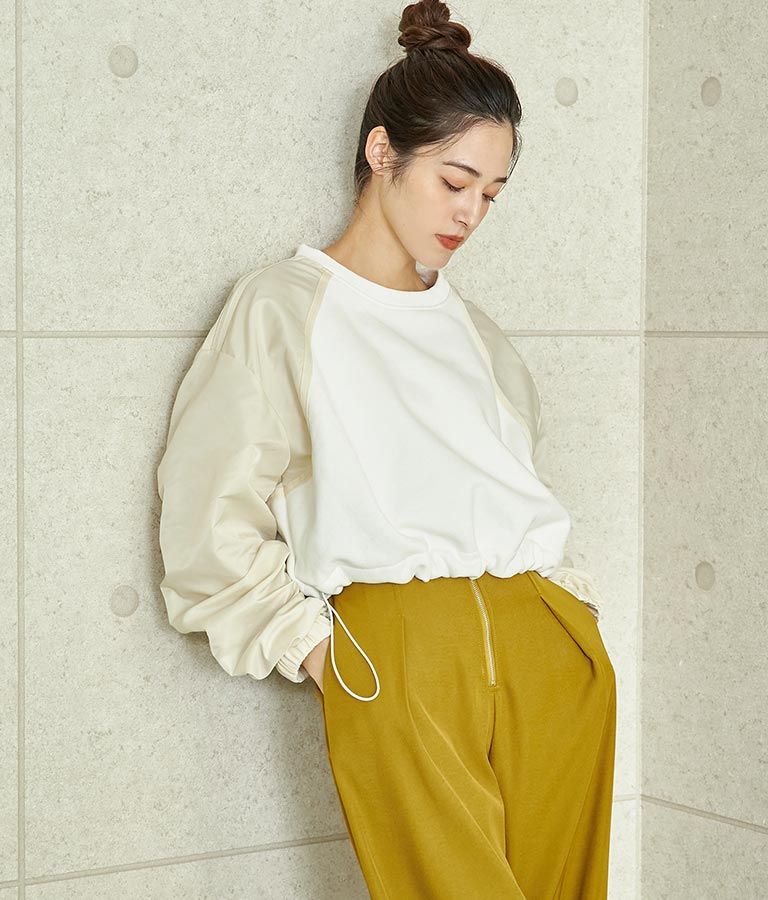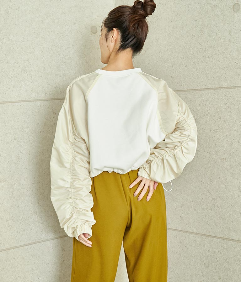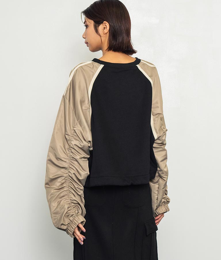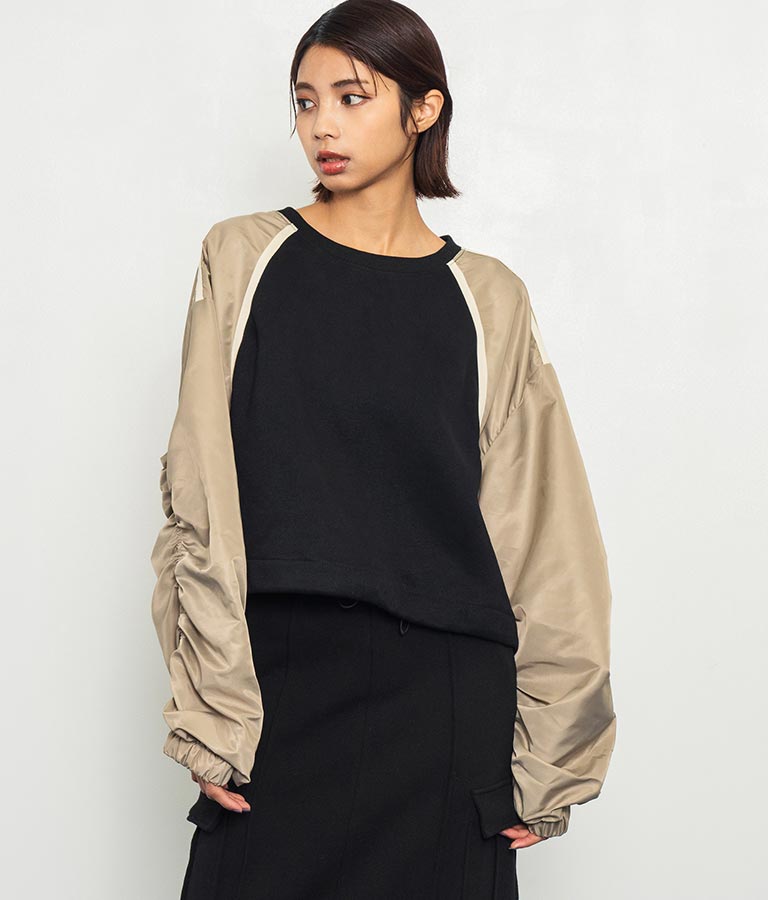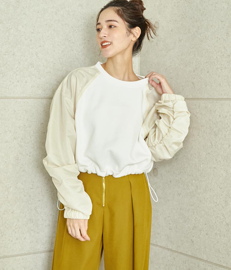 袖部分を異素材で切り替えたデザインのラグラン裏起毛トップス。