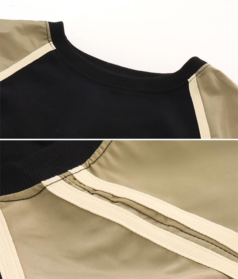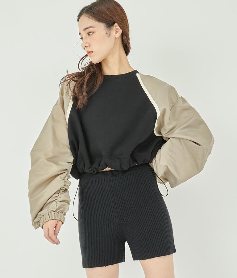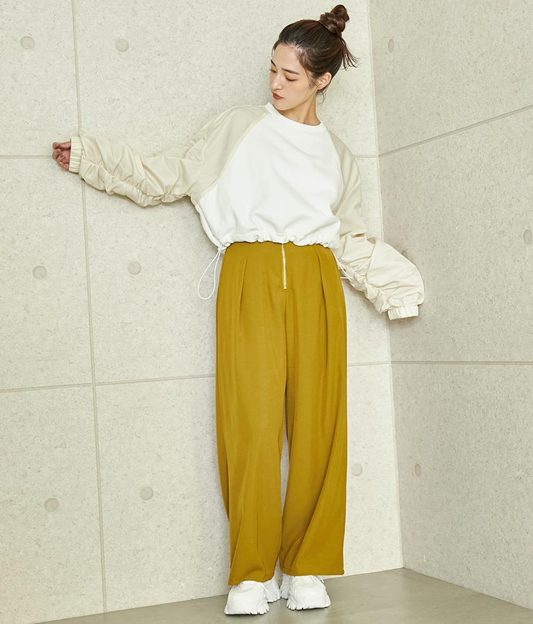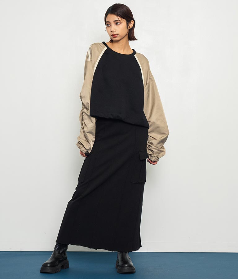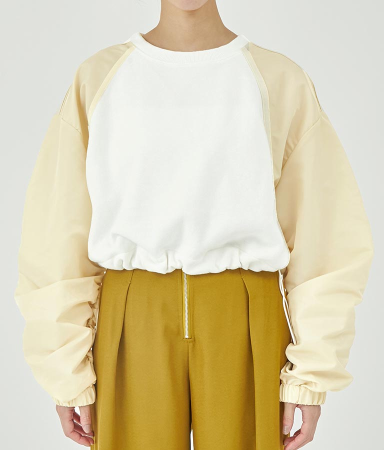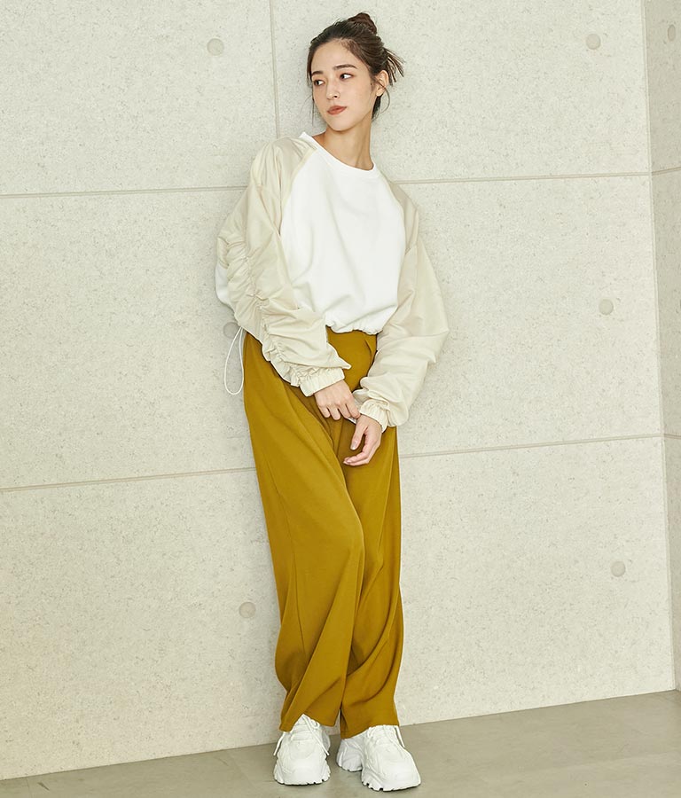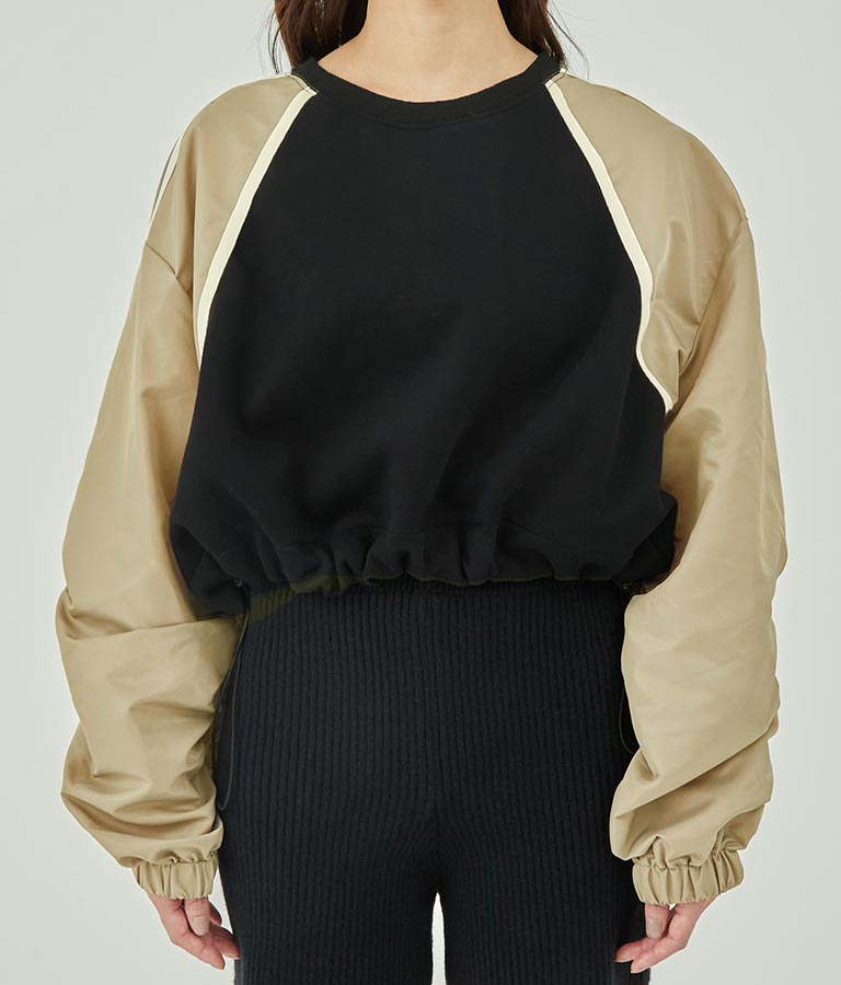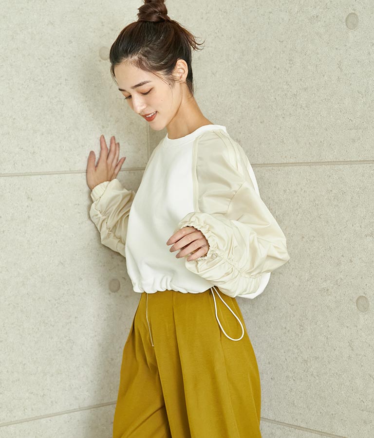 袖部分を異素材で切り替えたデザインのラグラン裏起毛トップス。