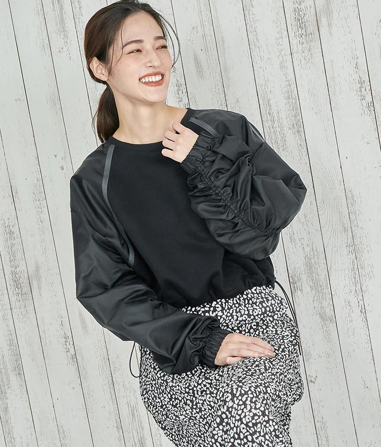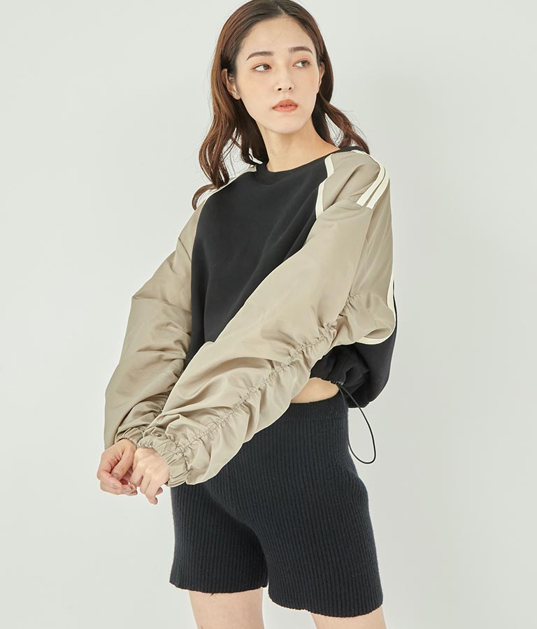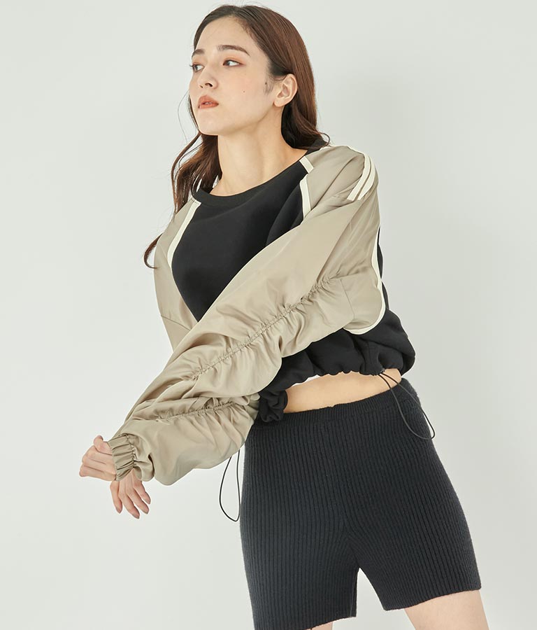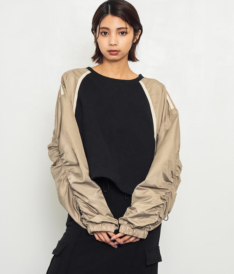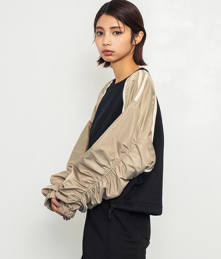 袖はシャカシャカとしたポリエステル素材で、肩に入ったダブルラインと相まってトレンドのスポーツMIXコーデにピッタリ!