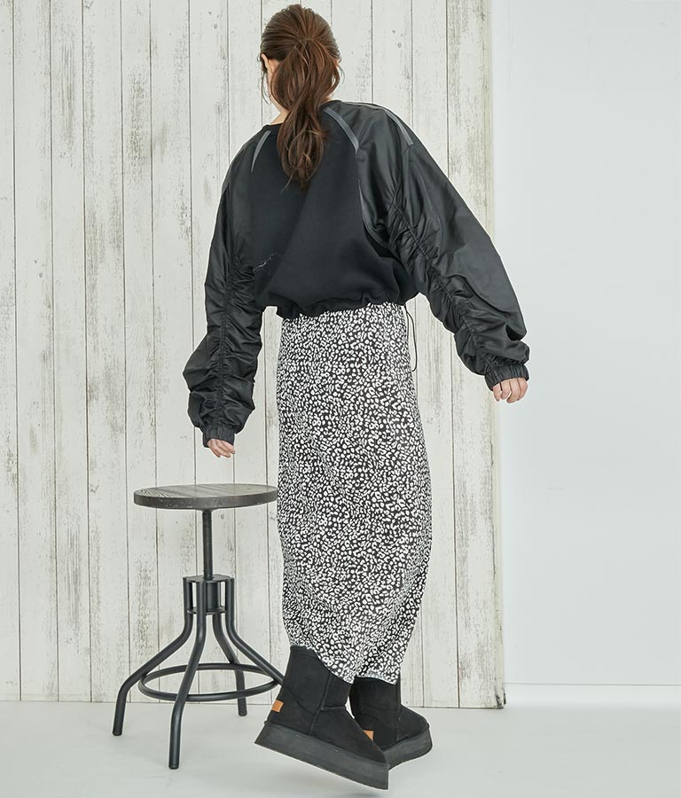 裾のドローコードで絞ることでシルエットを調節でき、動きのあるスタイルが完成します。