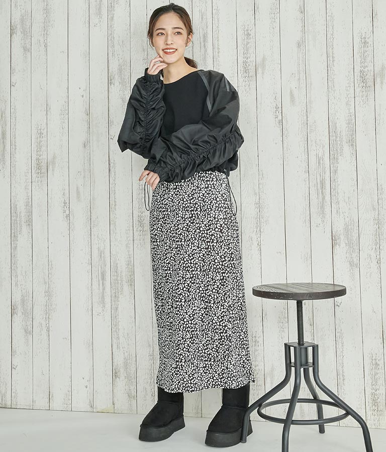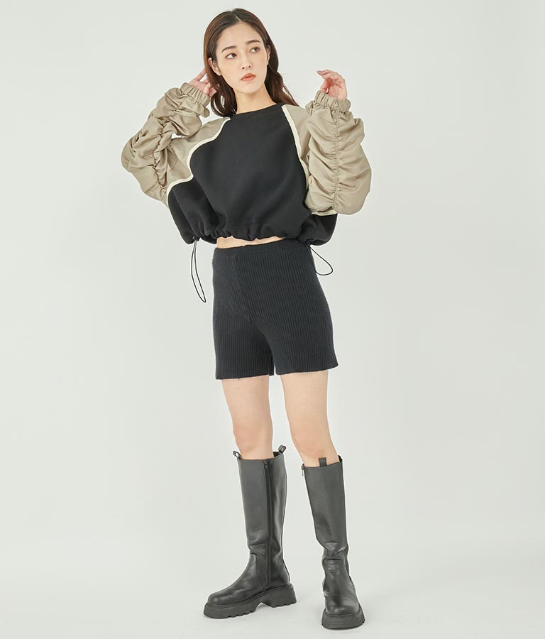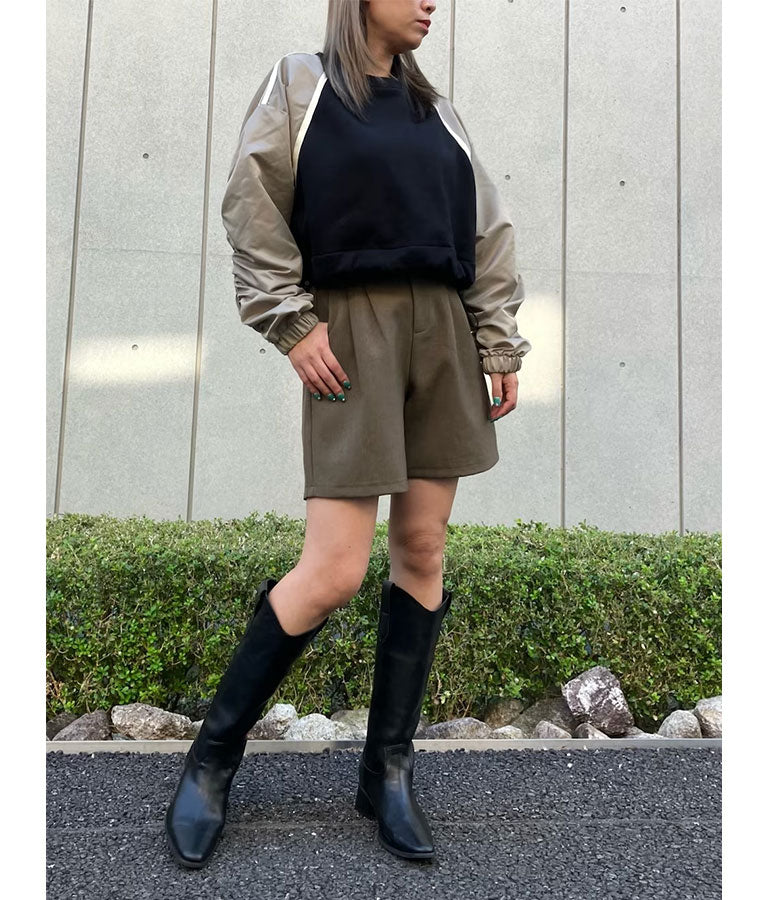 短めの着丈がボトムとのバランスも取りやすく、すっきりした形のボトムやショートパンツ+ロングブーツなどと合わせるとよりスタイルアップして見える着こなしに◎