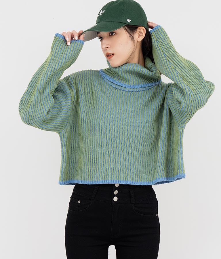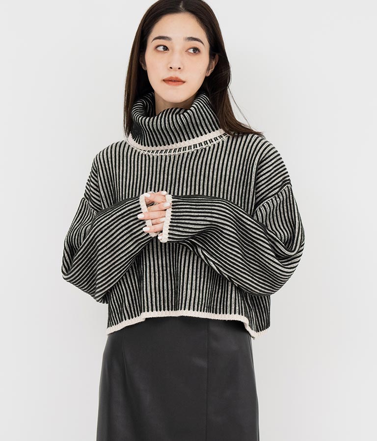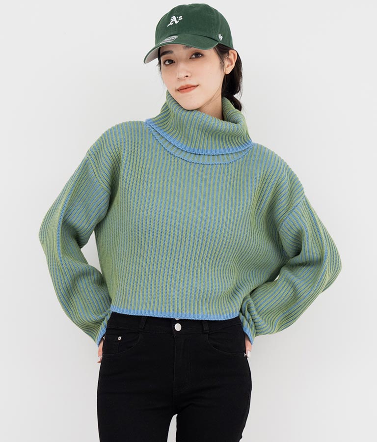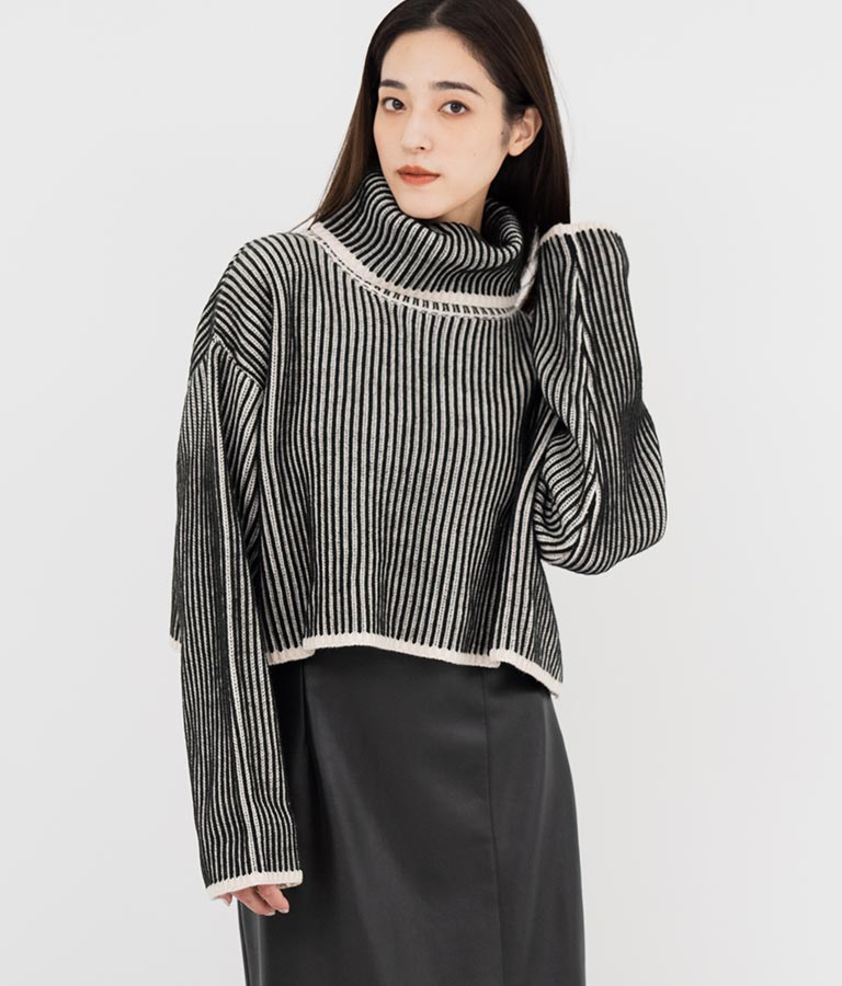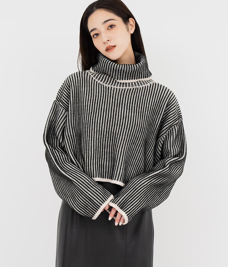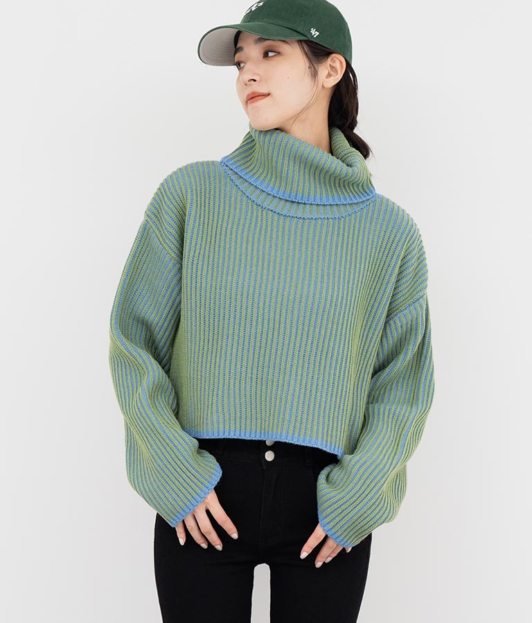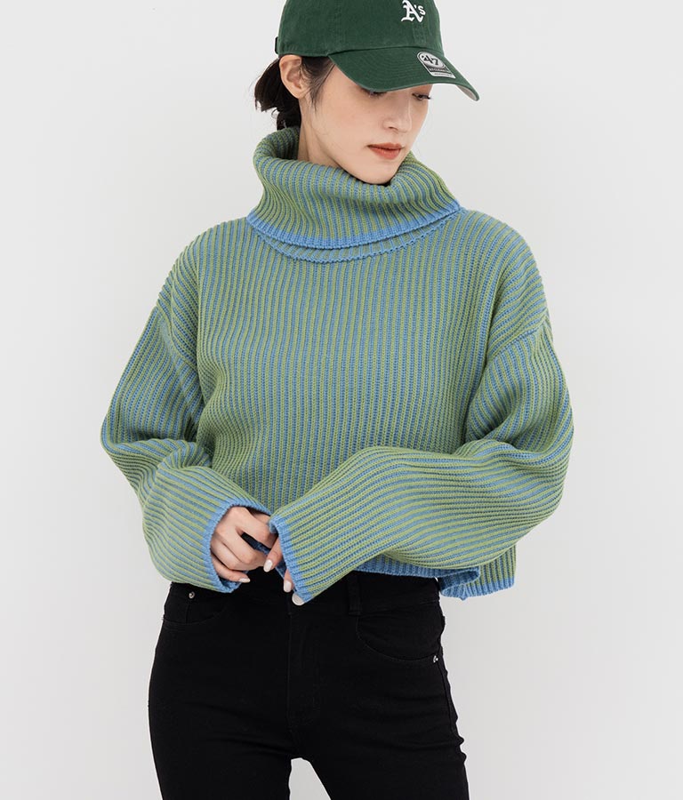 2色の糸で編んだ配色の見え方がポイントのタートルクロップドニット。