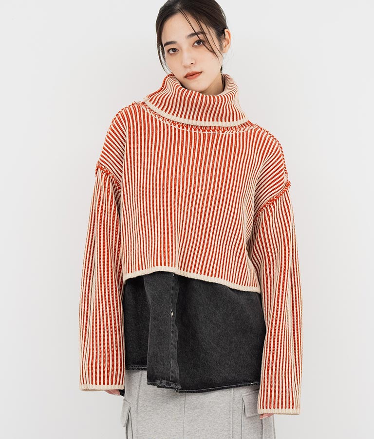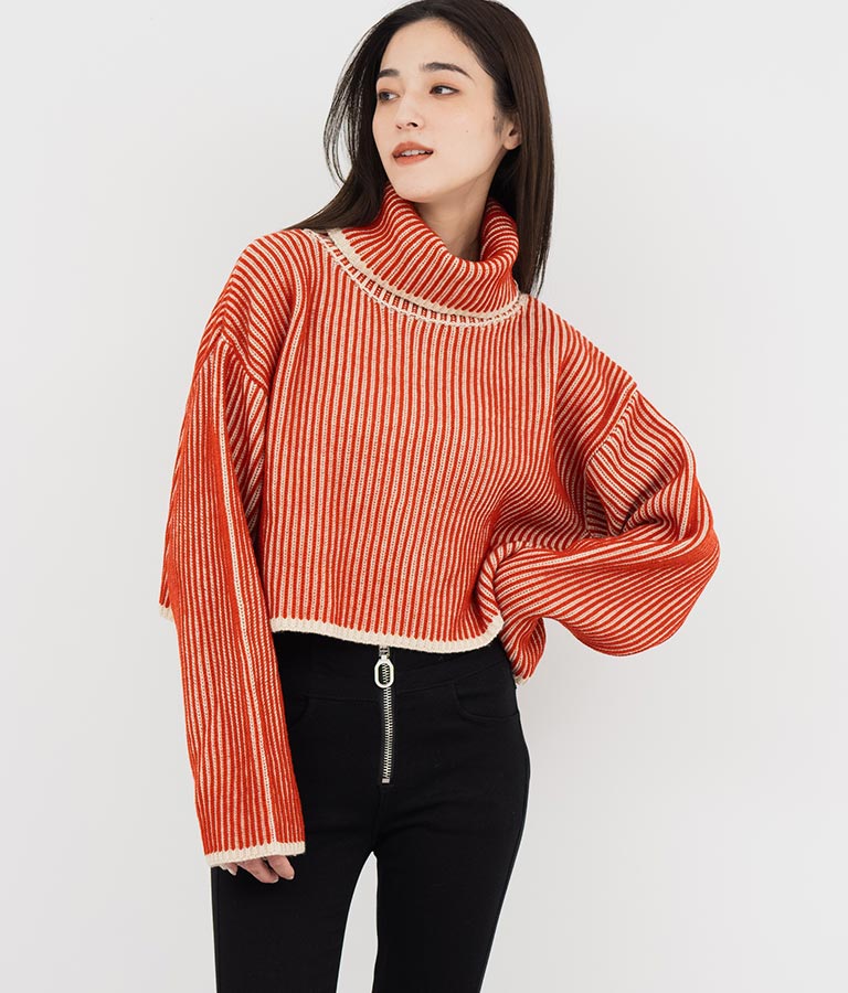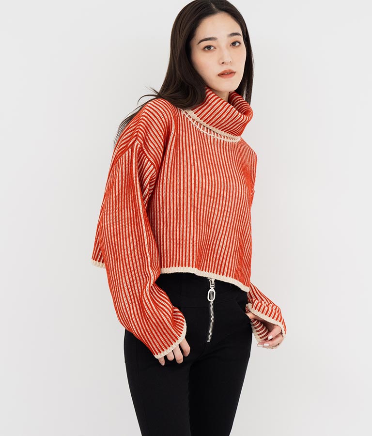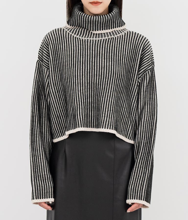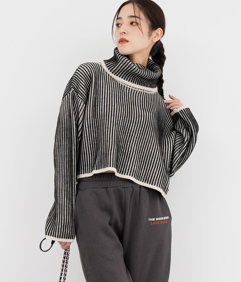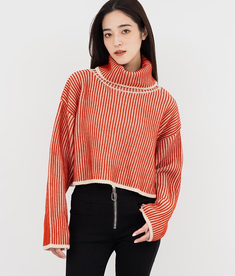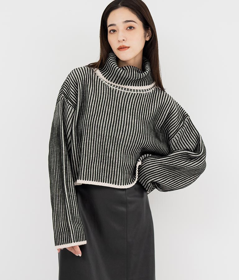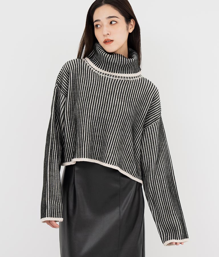 2色の糸で編んだ配色の見え方がポイントのタートルクロップドニット。