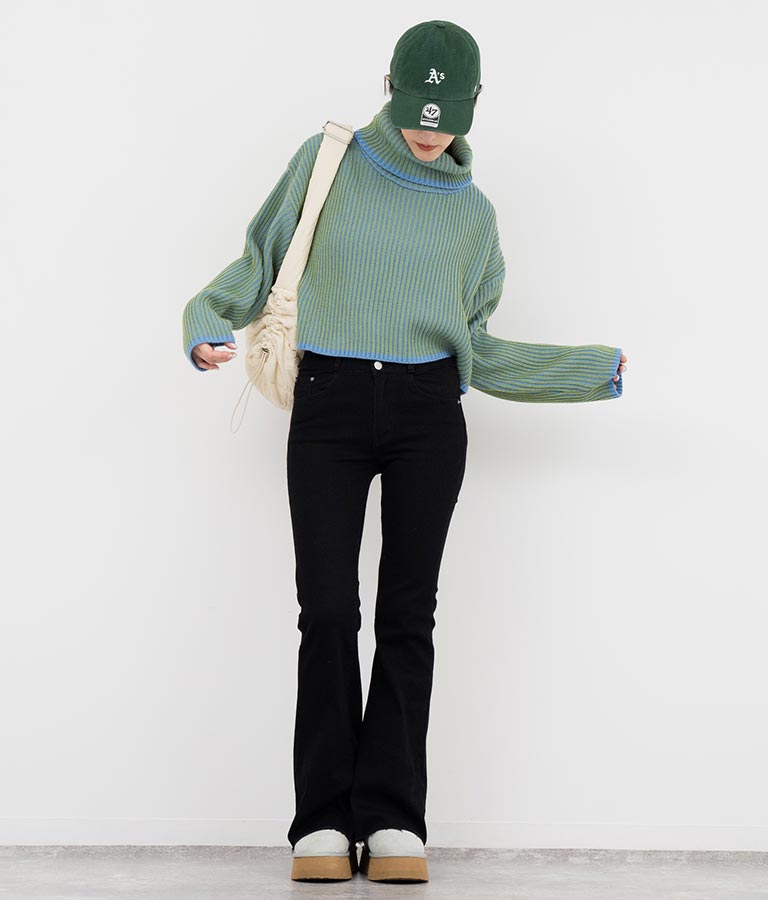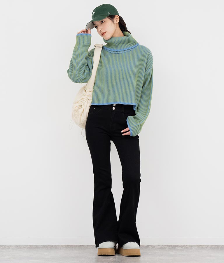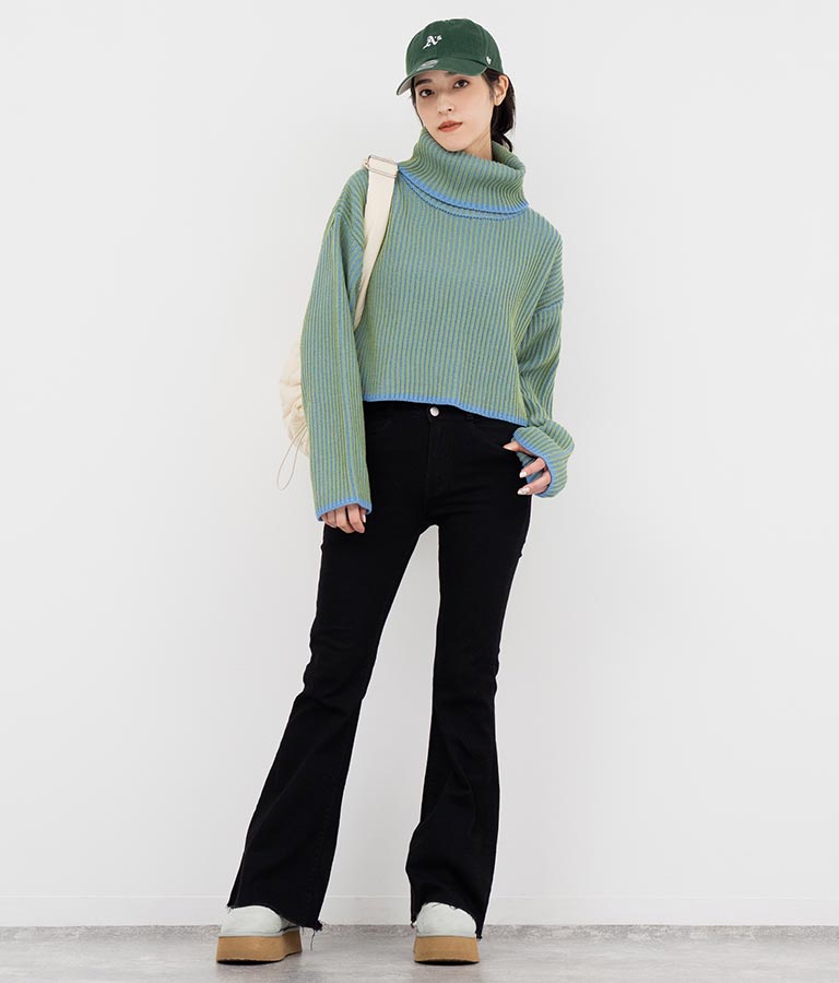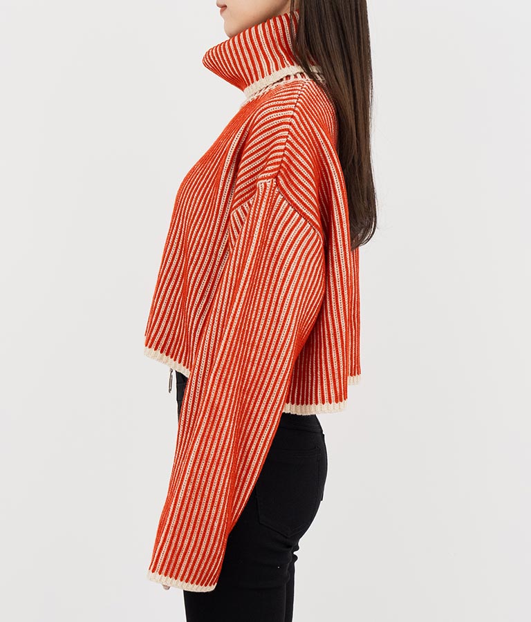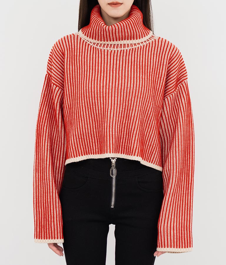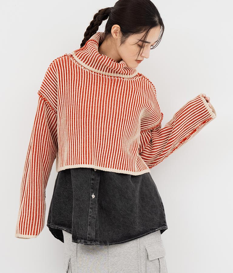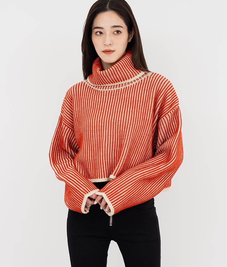 2色の糸で編んだ配色の見え方がポイントのタートルクロップドニット。