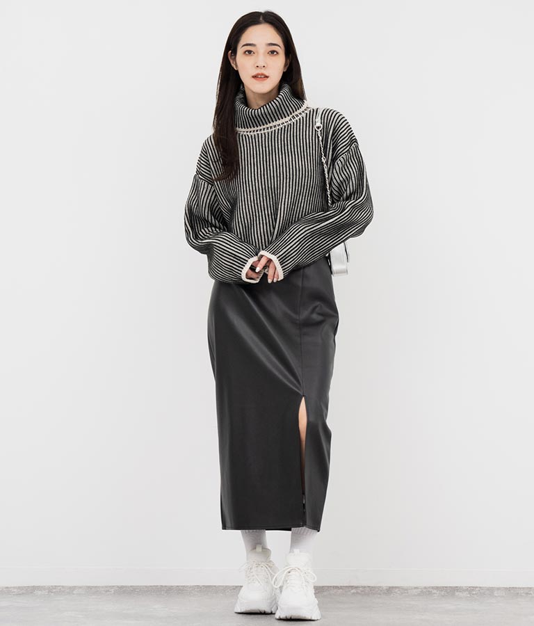 凹凸のある太めのリブ編みで立体感を演出し、縦ラインが強調されすっきりしたシルエットに見せてくれます。
