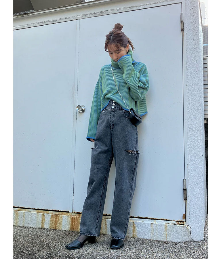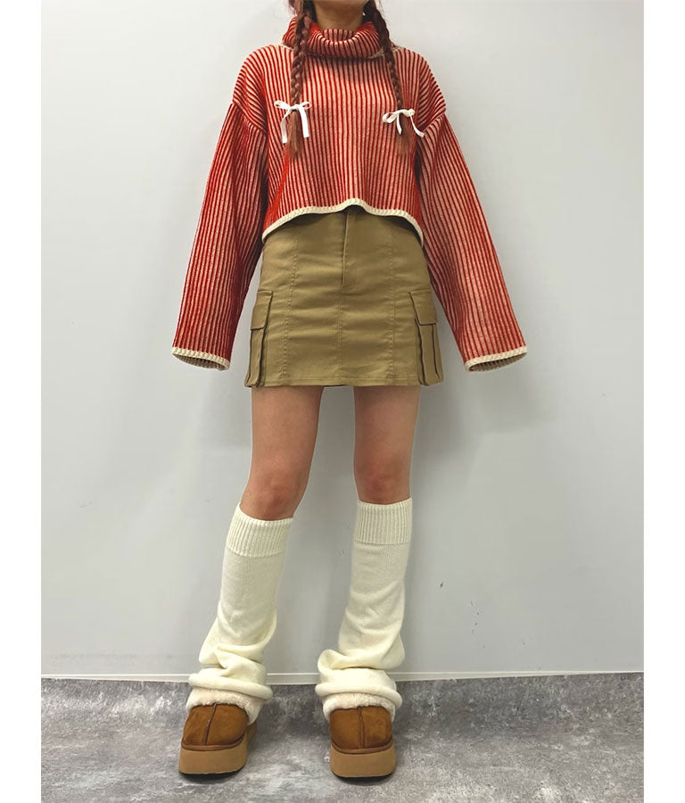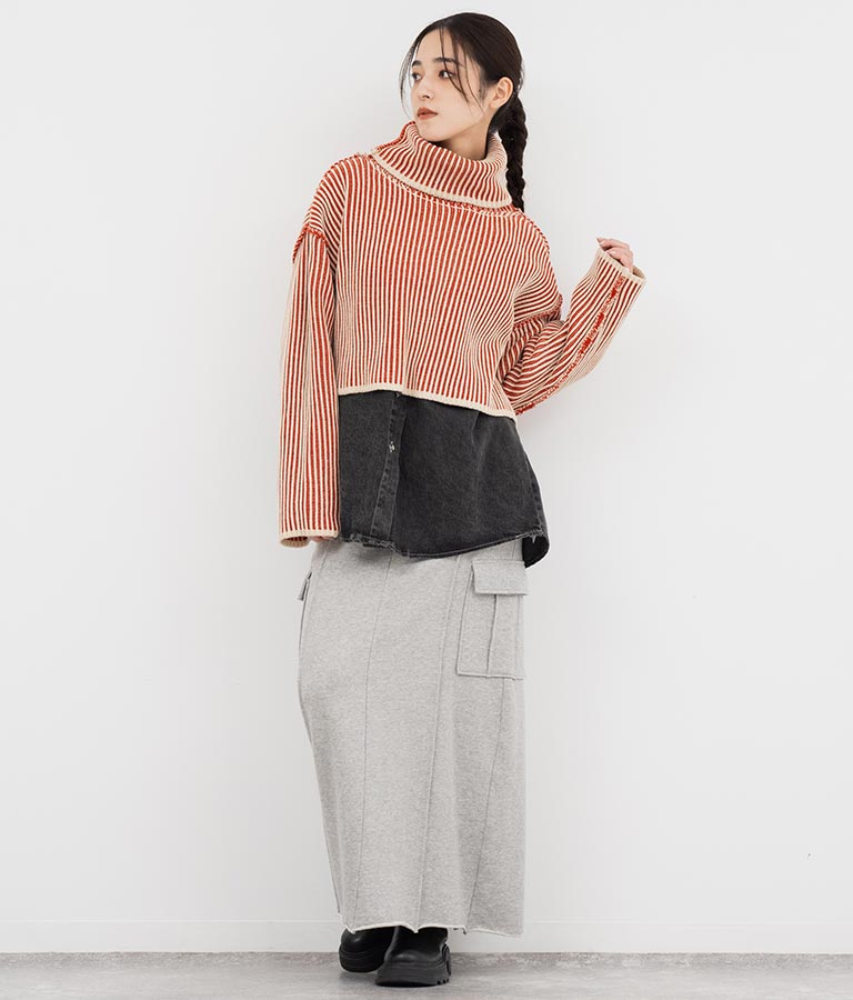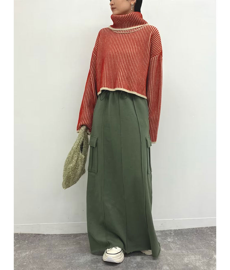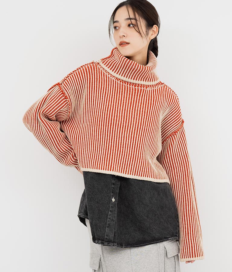 配色 リバーシブル タートルネック クロップド ニット トップス 793-9104