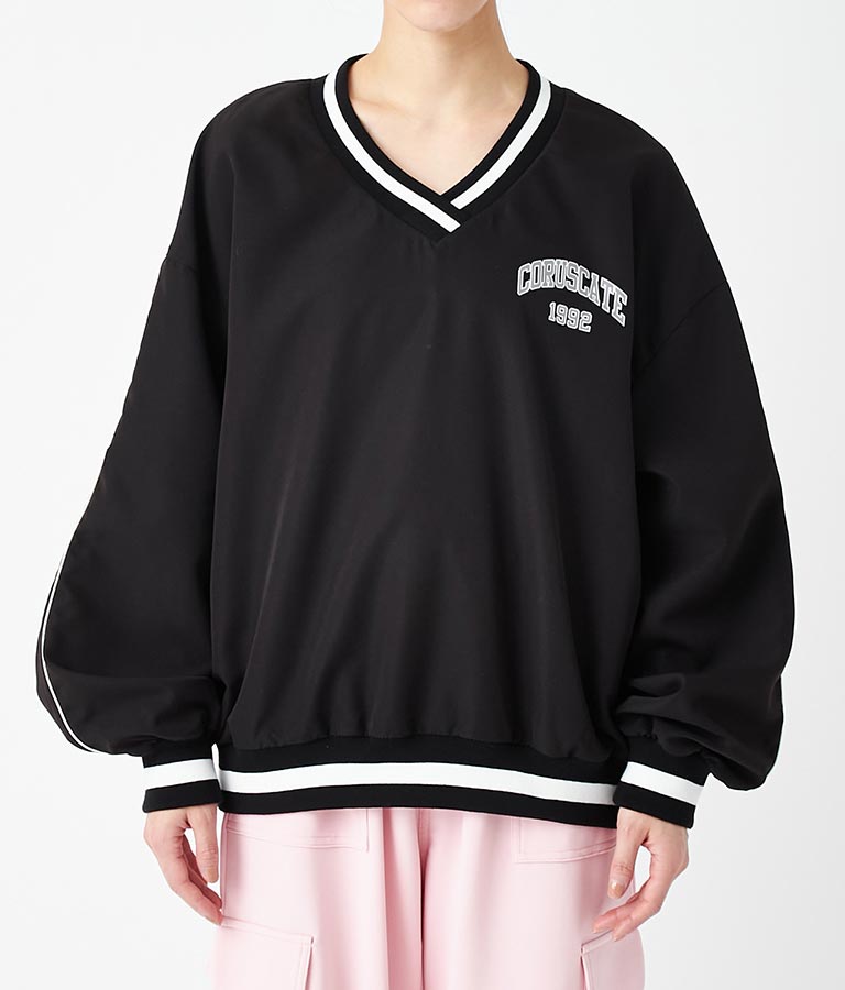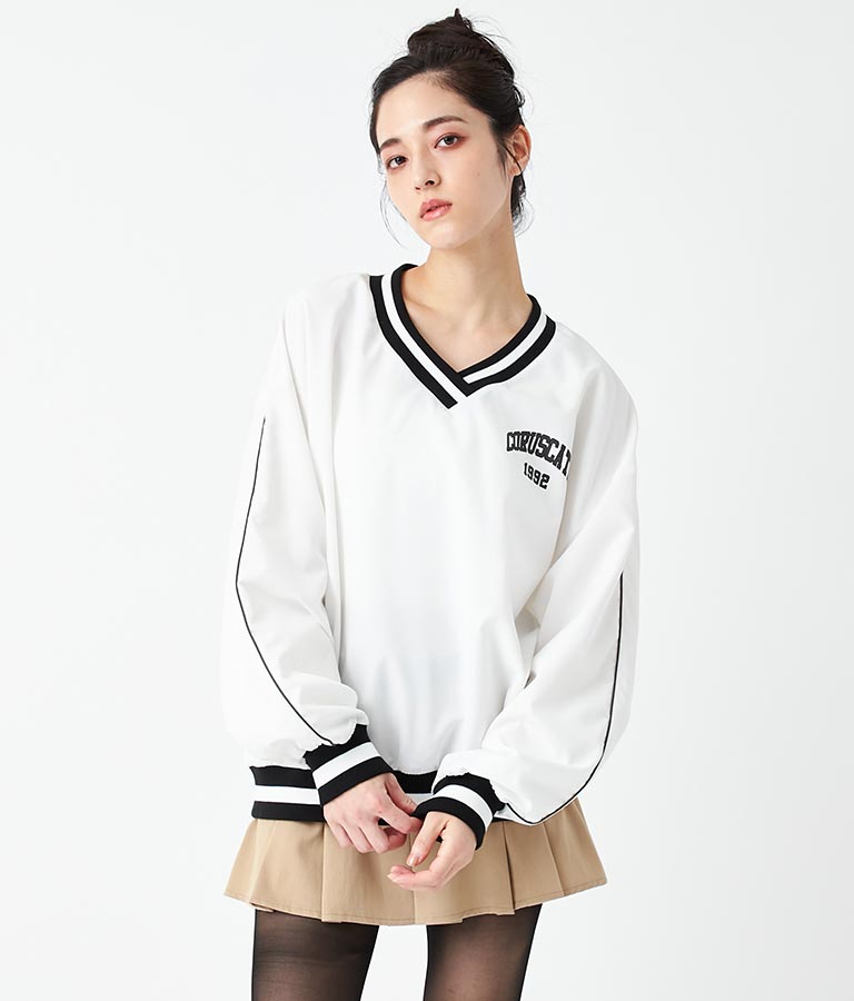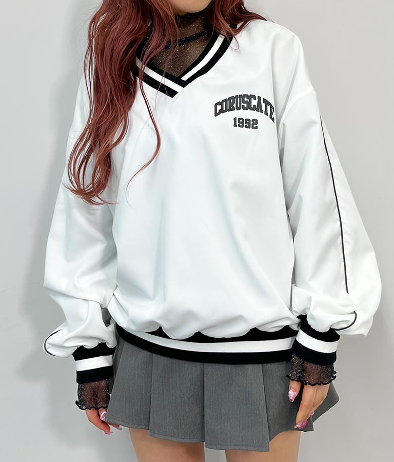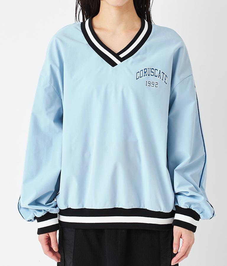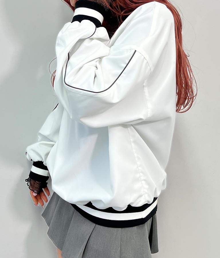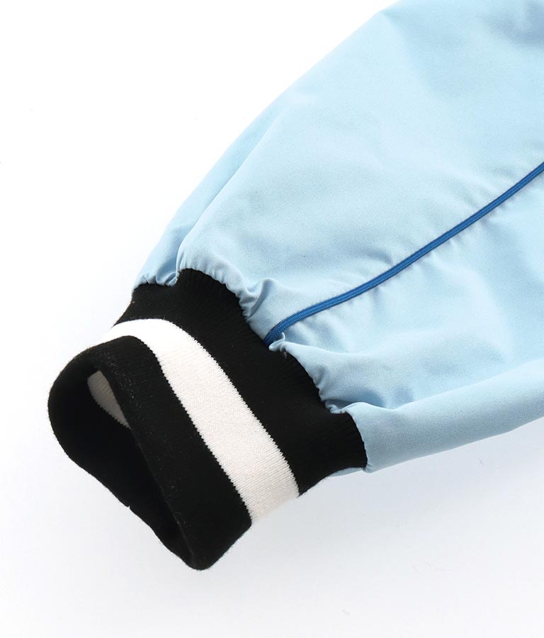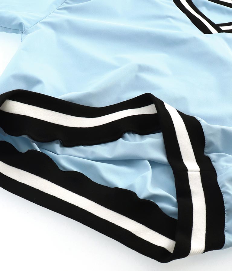 ポリエステルのシャカシャカした手触りでネック部分、袖口のラインリブがスポーティーな印象を与えてくれます。