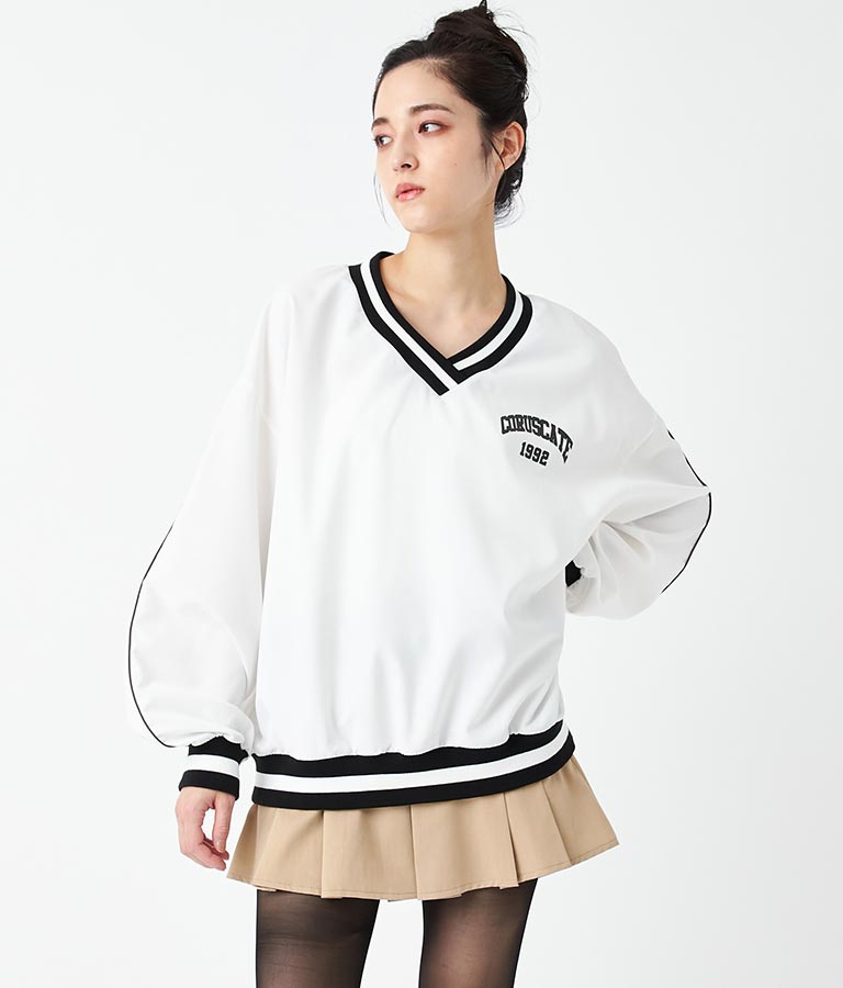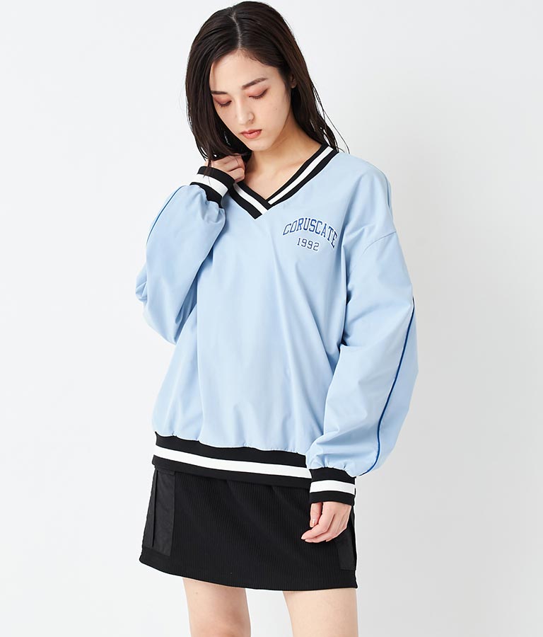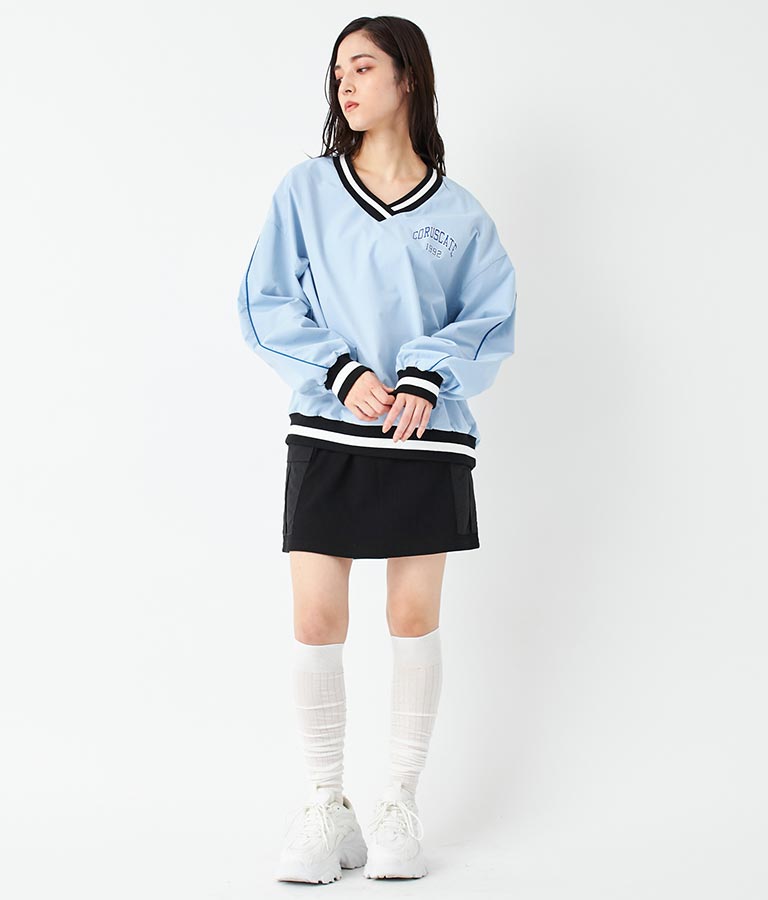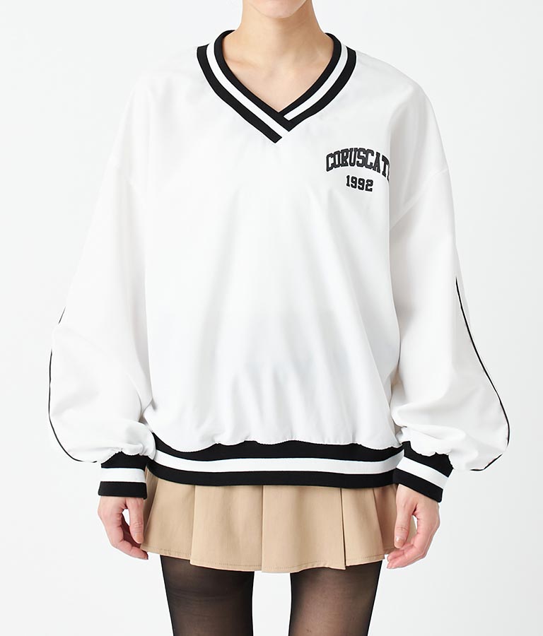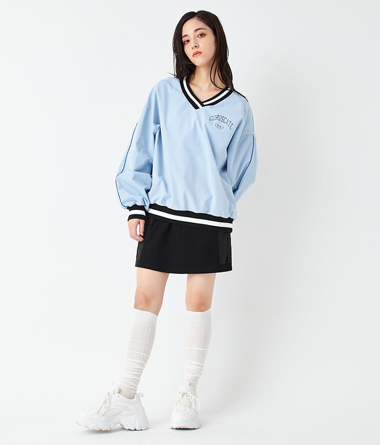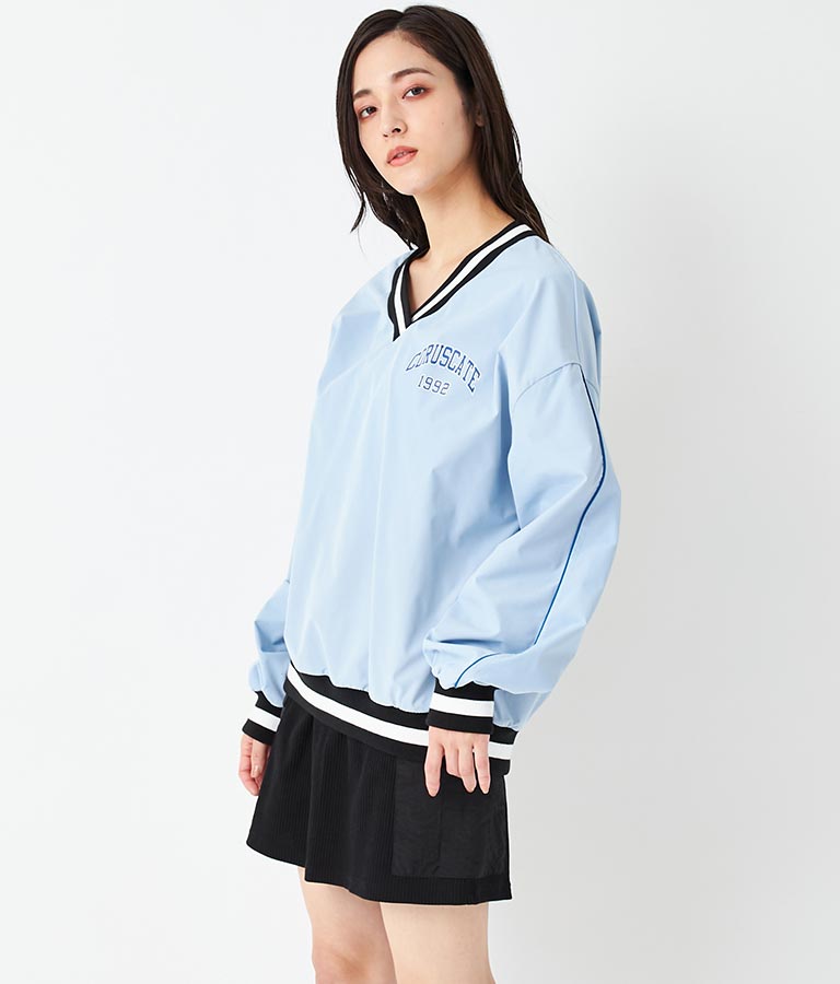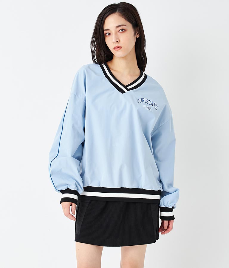 ポリエステルのシャカシャカした手触りでネック部分、袖口のラインリブがスポーティーな印象を与えてくれます。