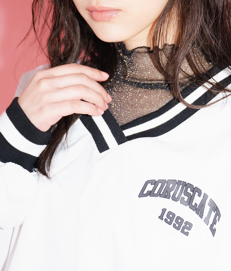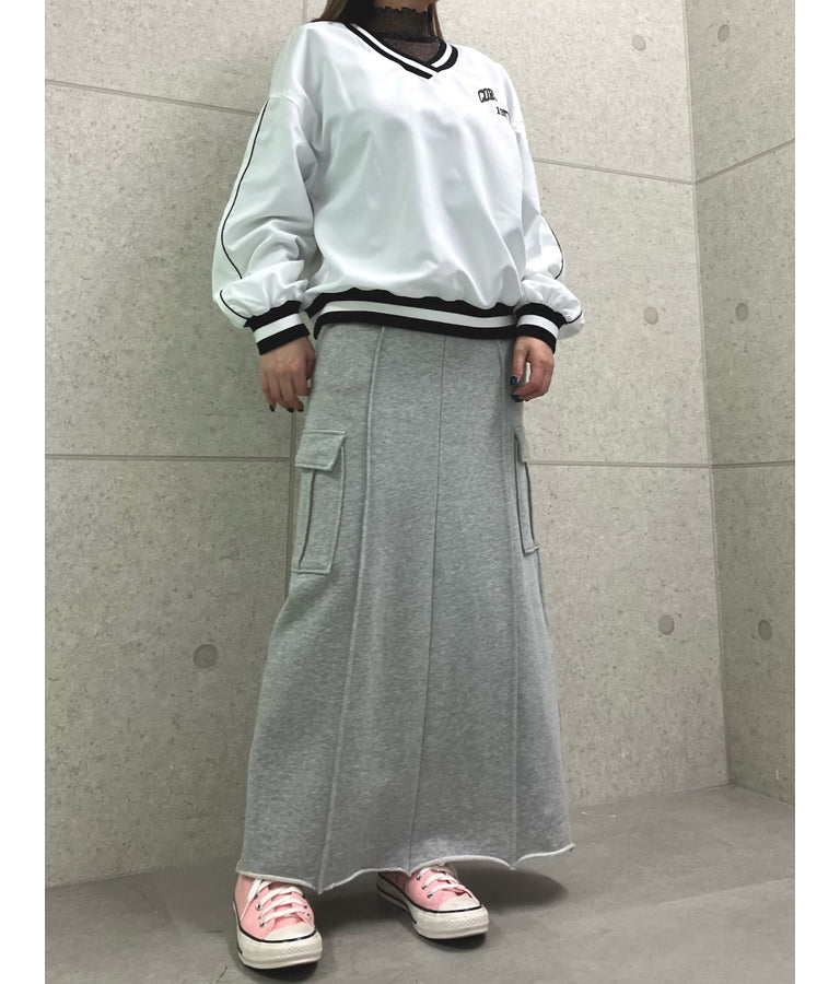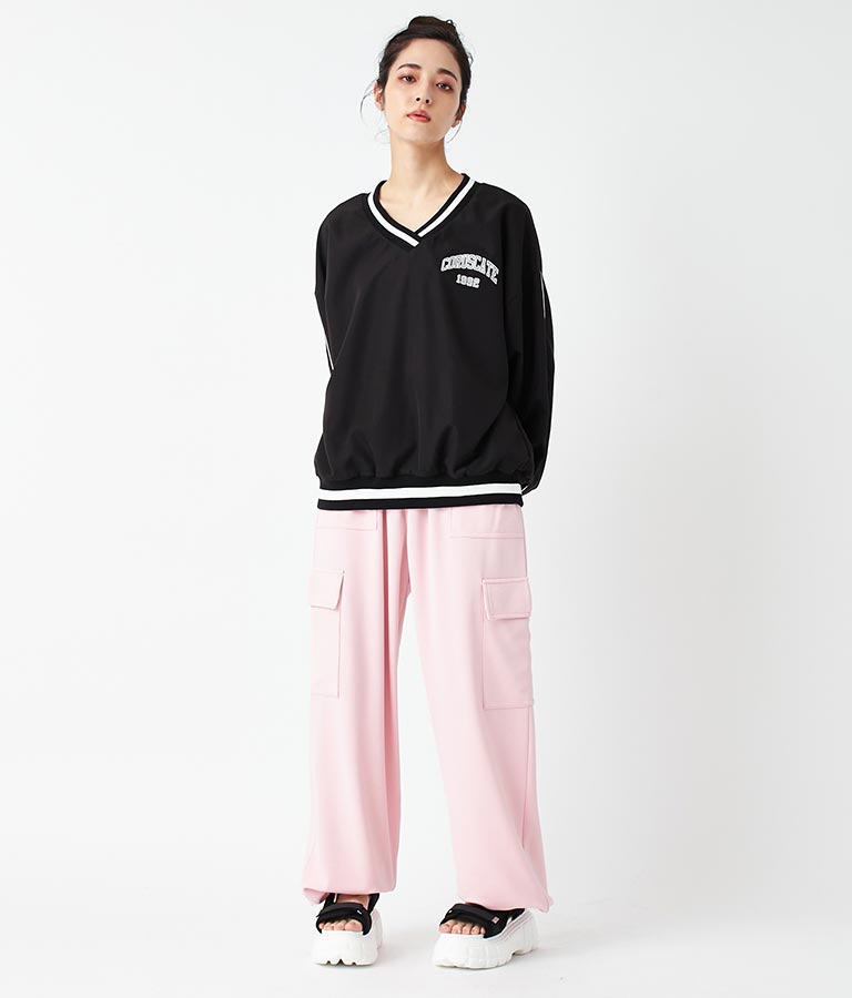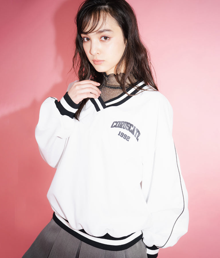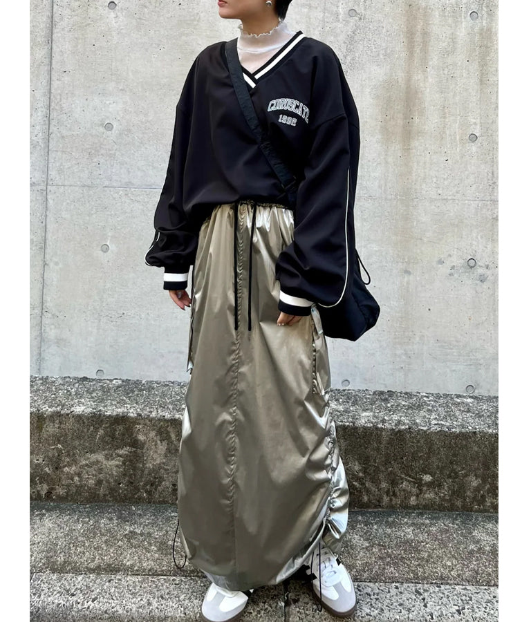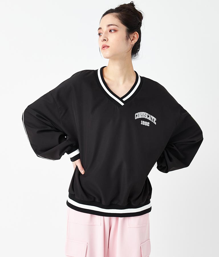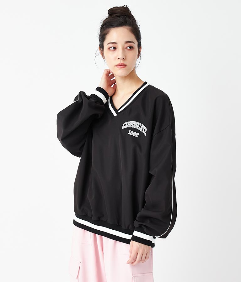 ポリエステルのシャカシャカした手触りでネック部分、袖口のラインリブがスポーティーな印象を与えてくれます。