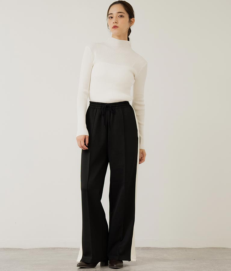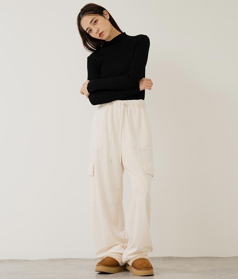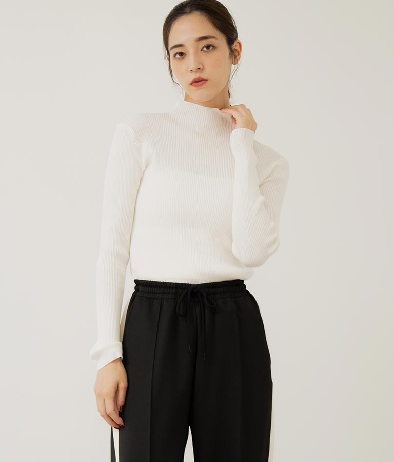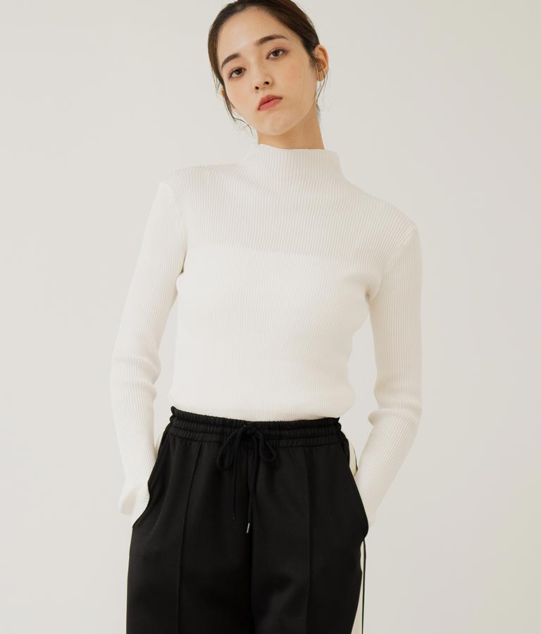 プチハイネックで顔周りに上品さを与えるニットトップス。