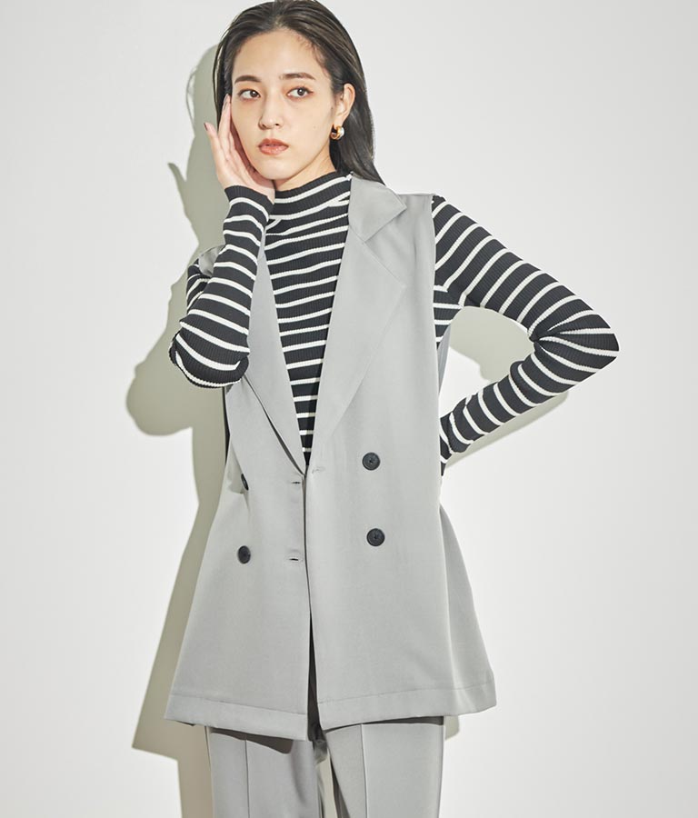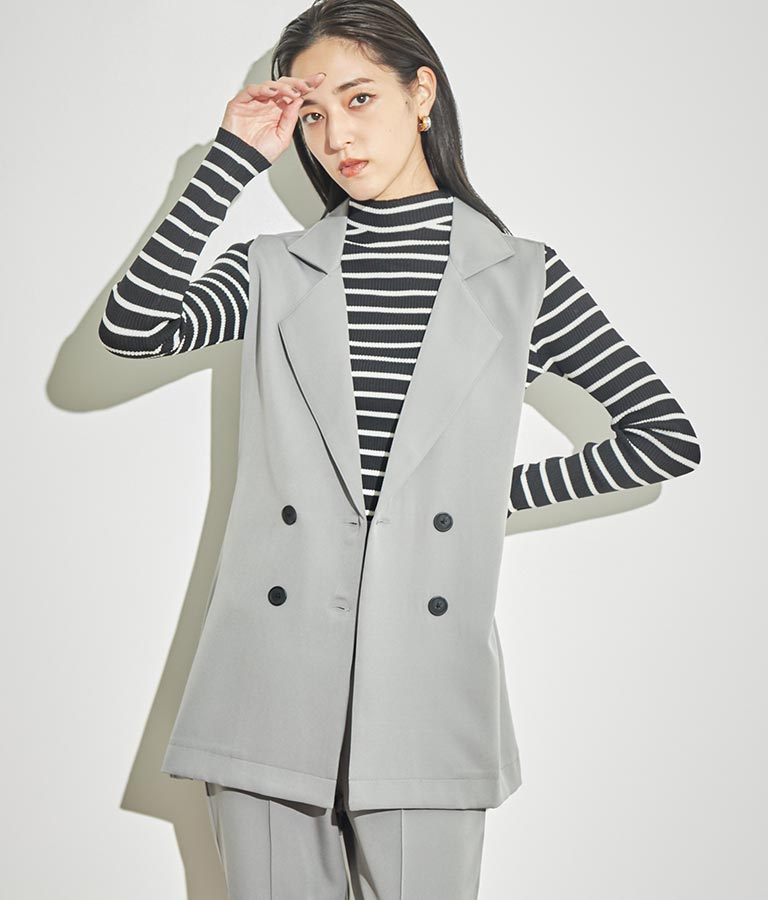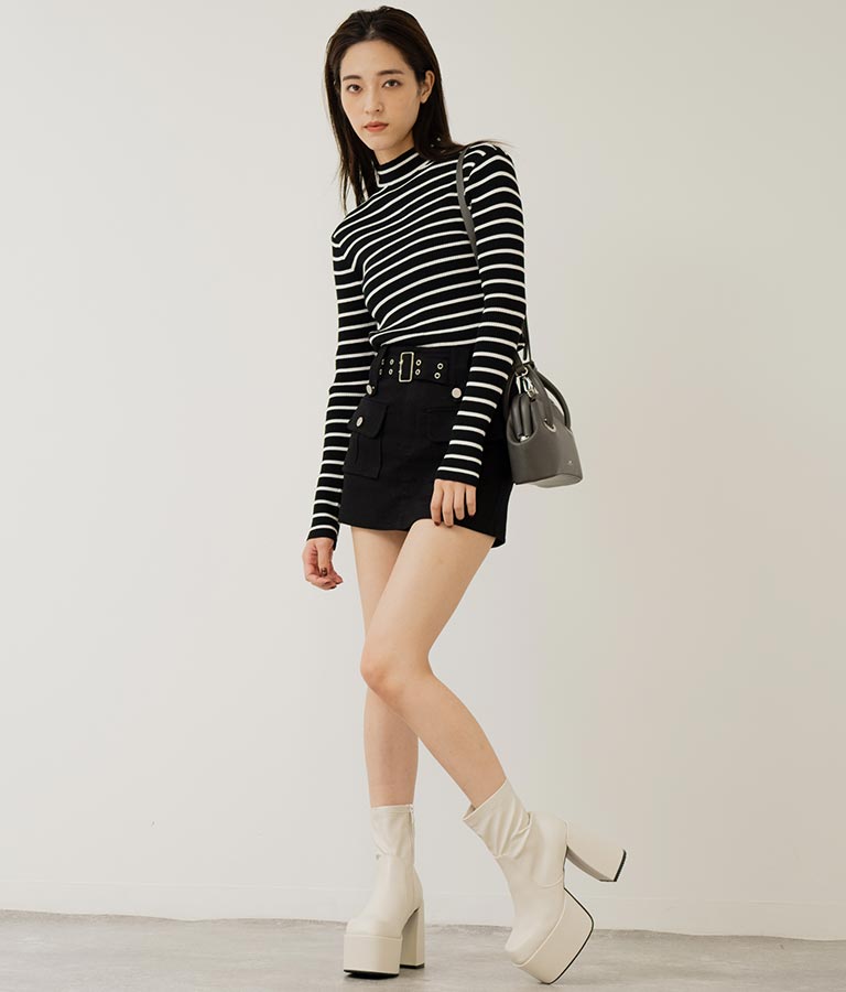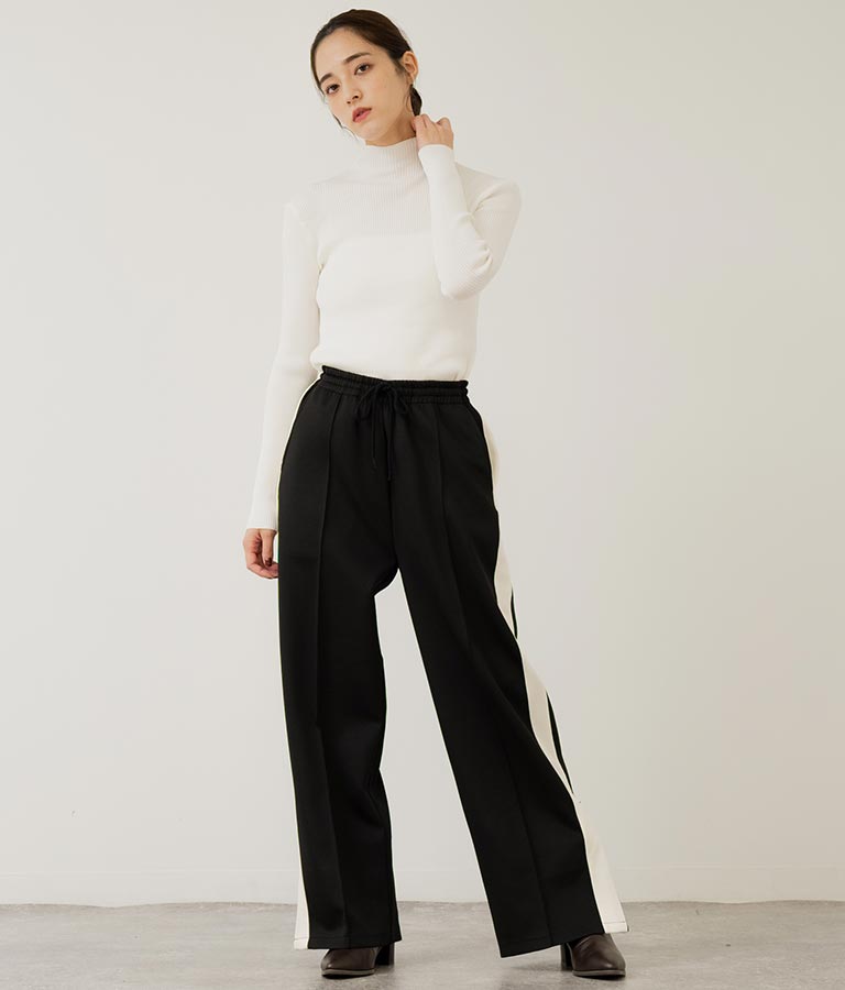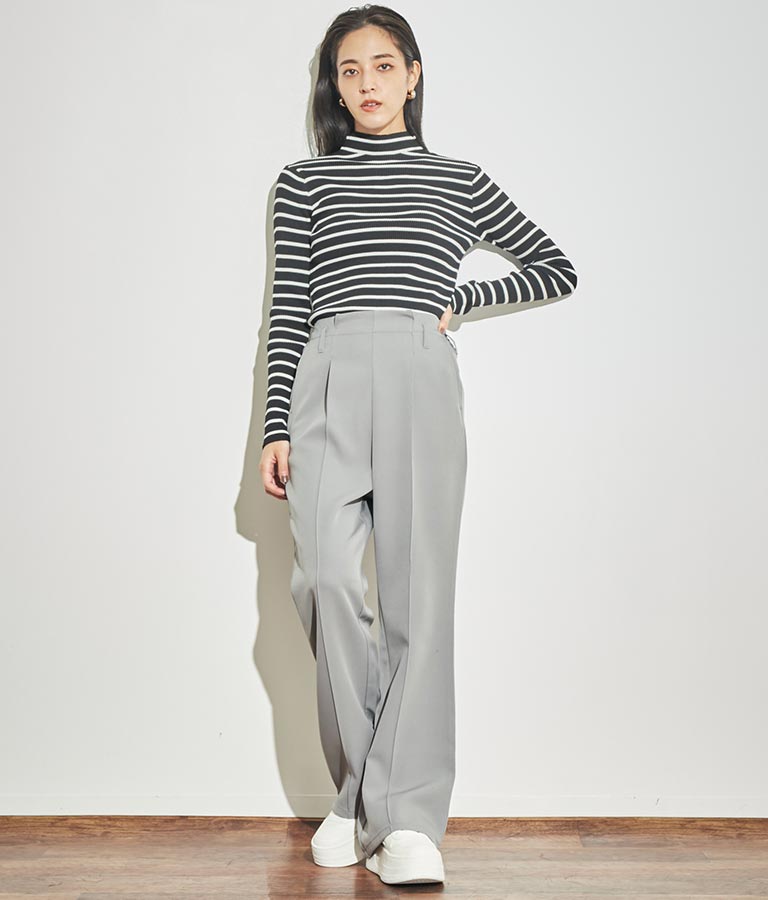 プチハイネックで顔周りに上品さを与えるニットトップス。