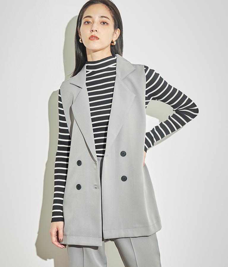 シンプルな単色ながらもリブ素材の編み地によって飽きずに着用可能。