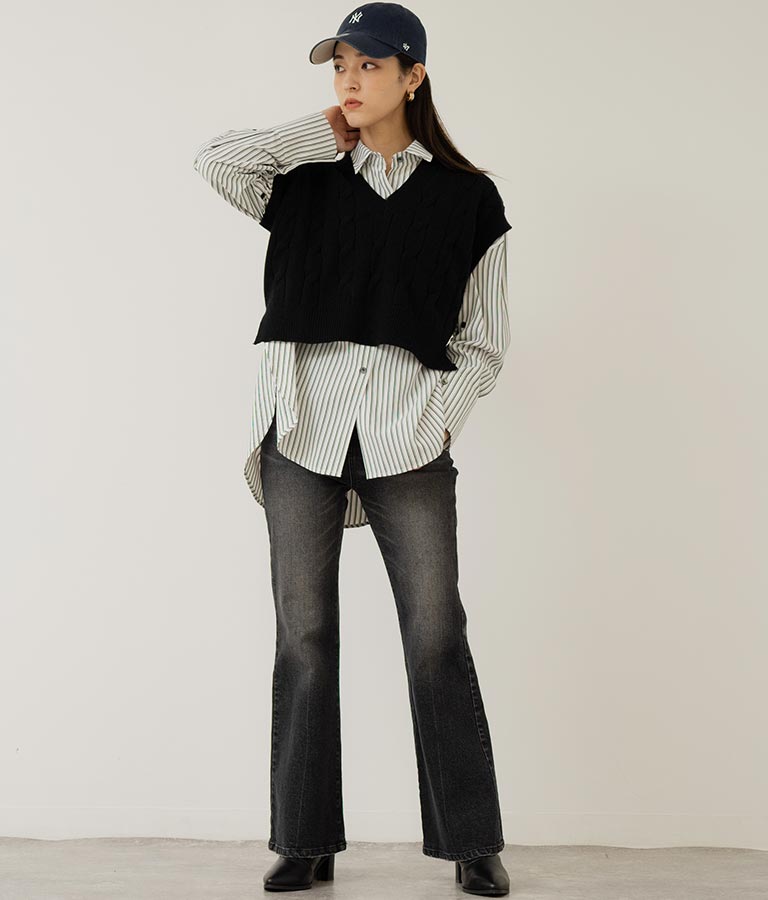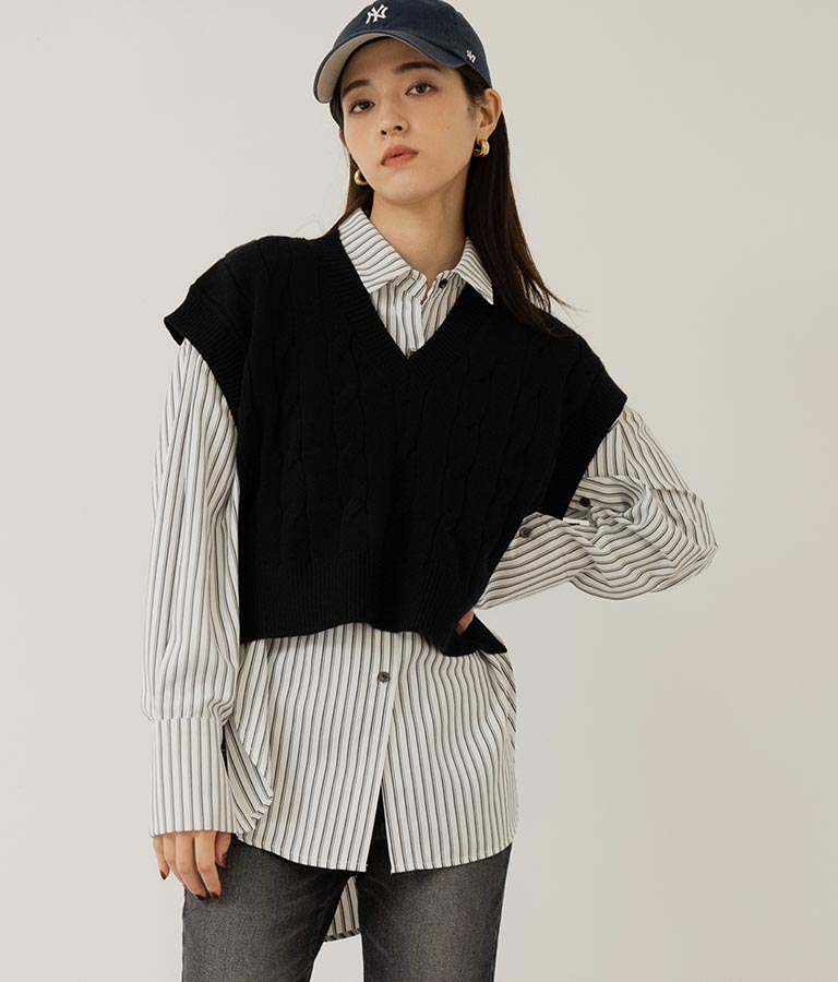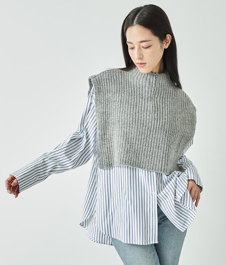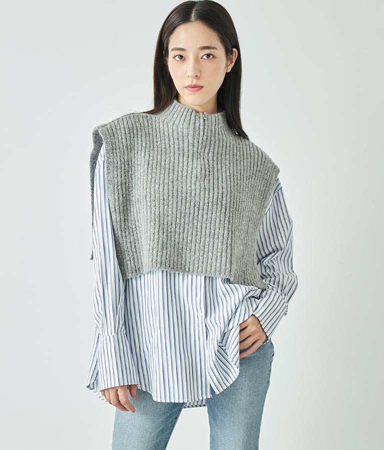 インナーのレイヤードだけでなく、上にベストやトレーナー、ニットなどを重ねて襟を見せるスタイルもおすすめ。