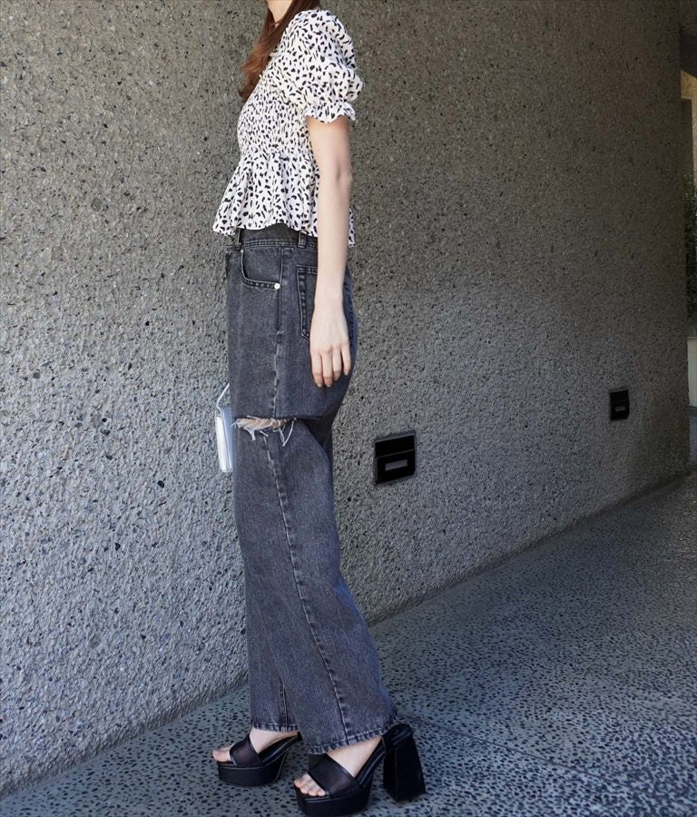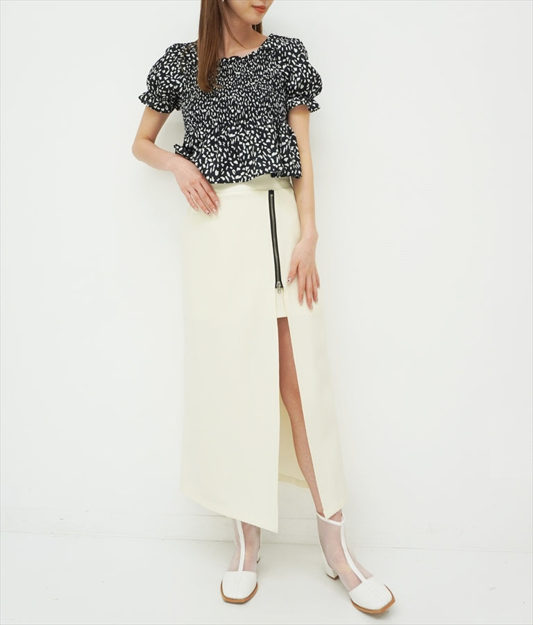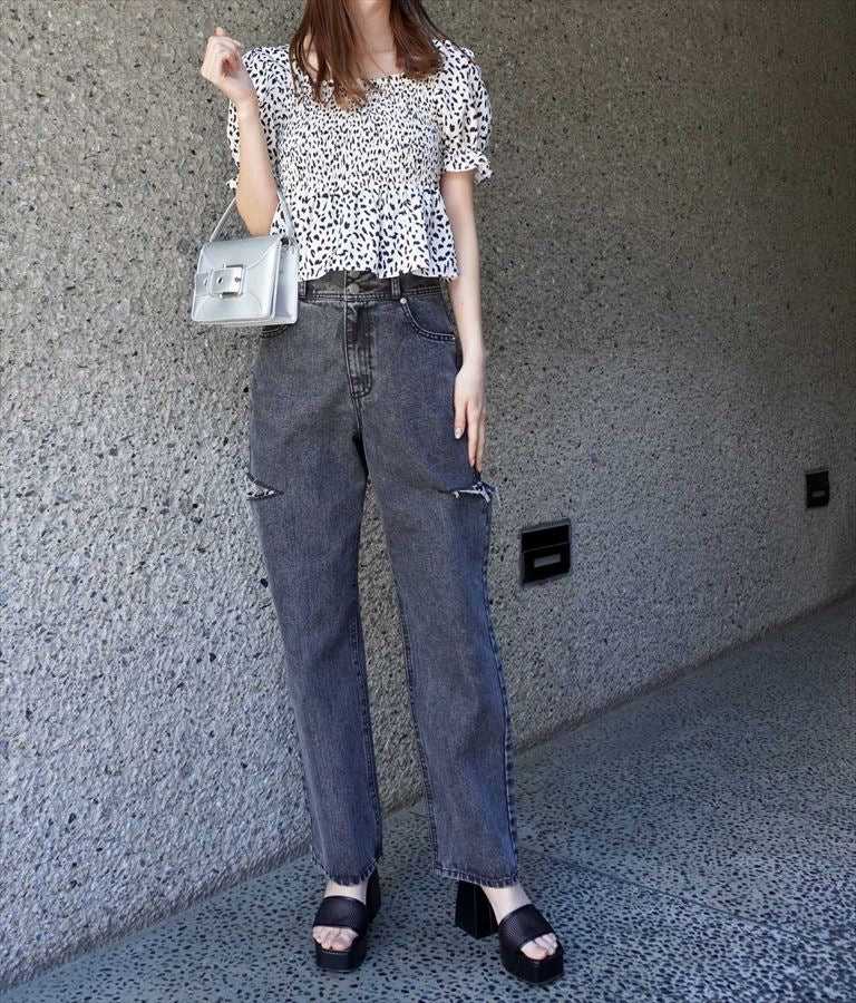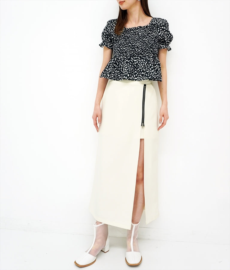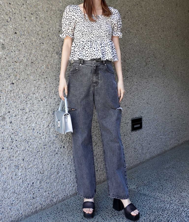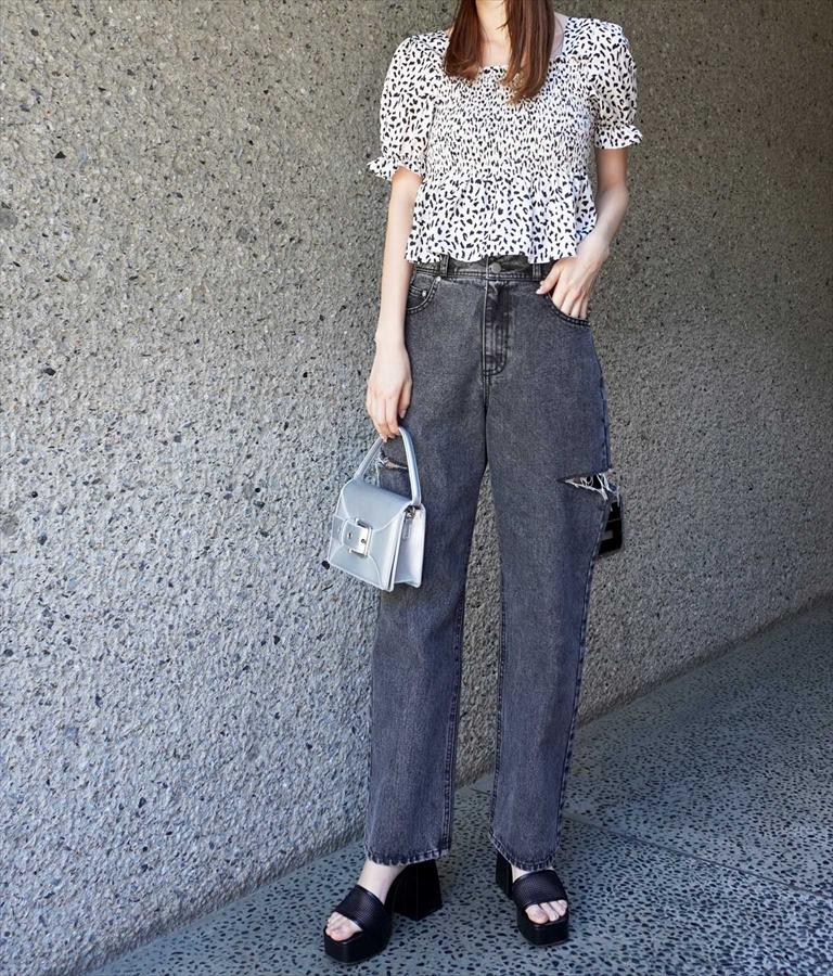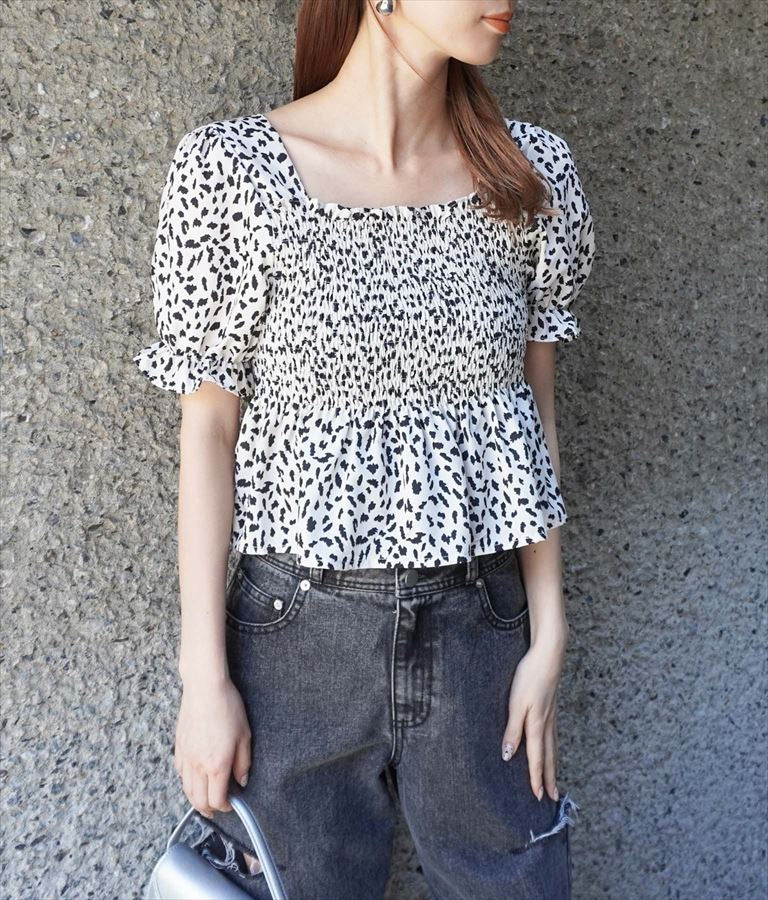 甘めなパフスリーブやフリルとクールな総柄の甘辛ミックスのバランスが◎