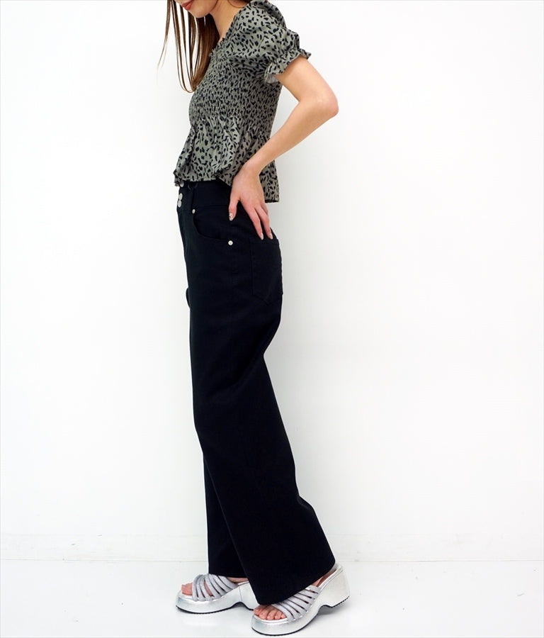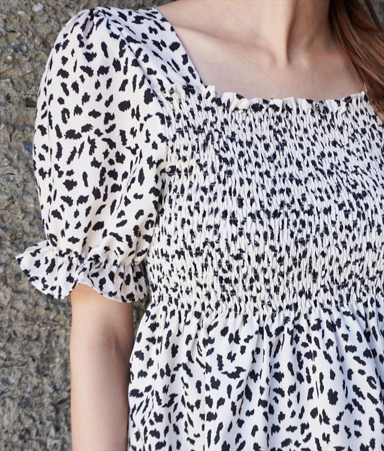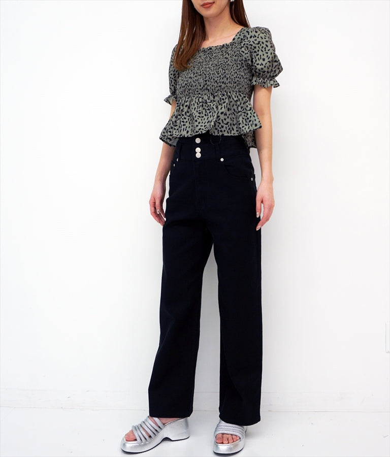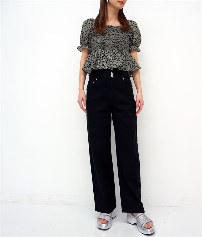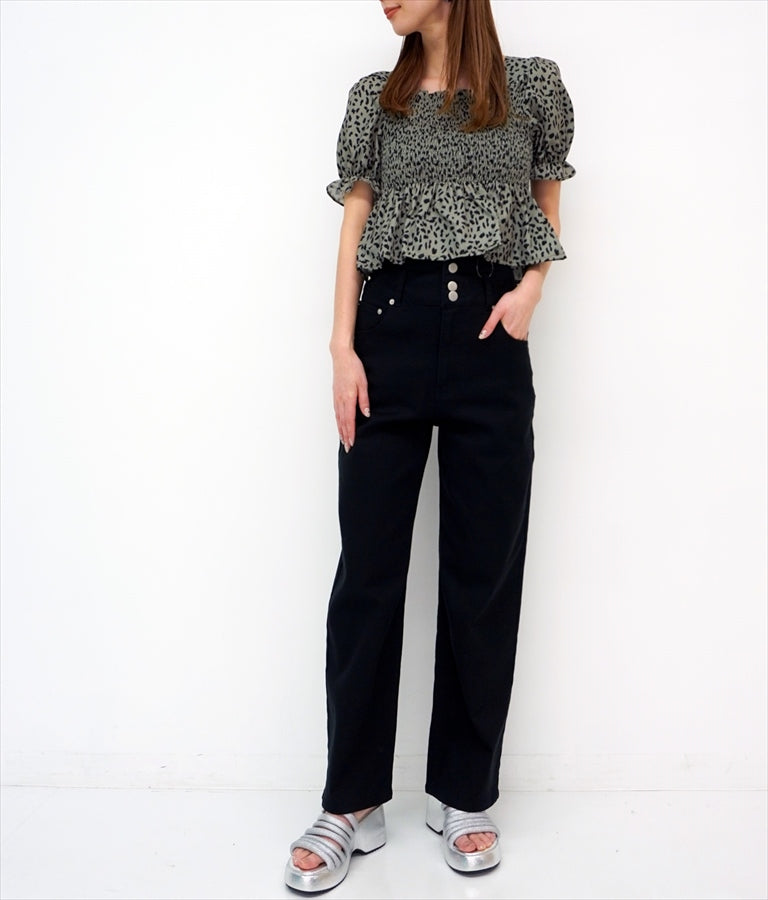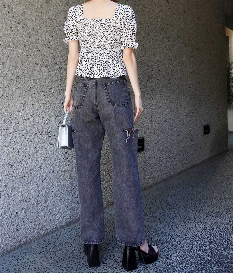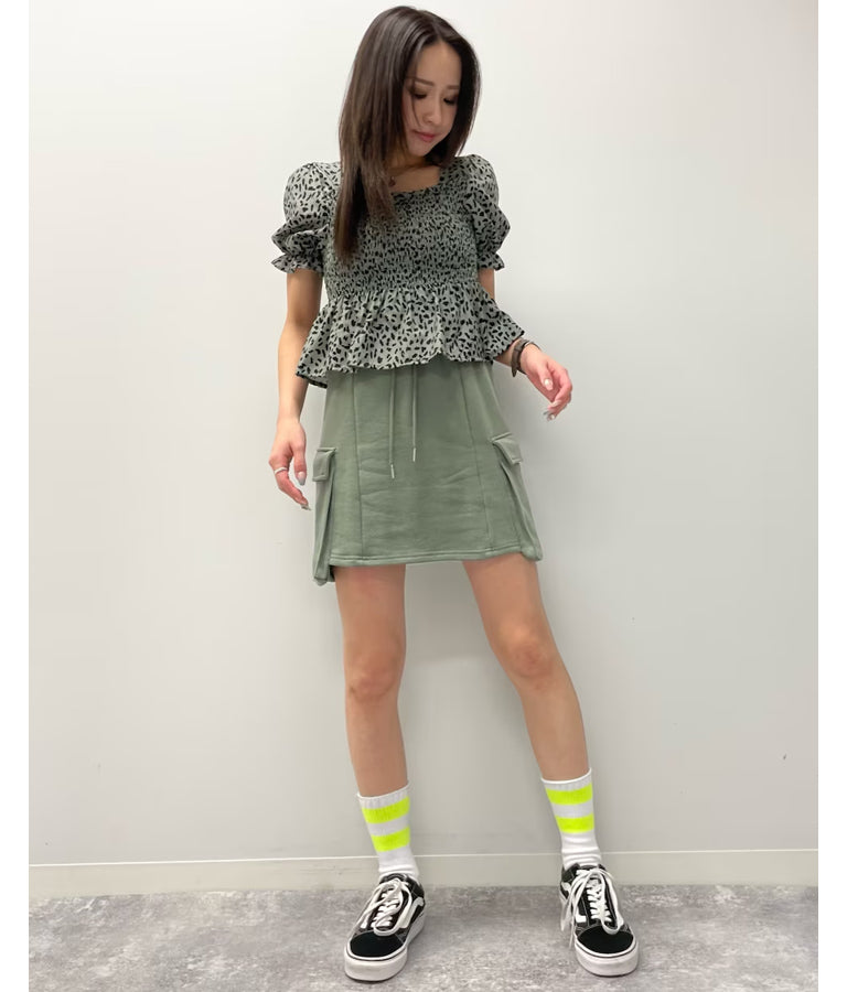 甘めなパフスリーブやフリルとクールな総柄の甘辛ミックスのバランスが◎