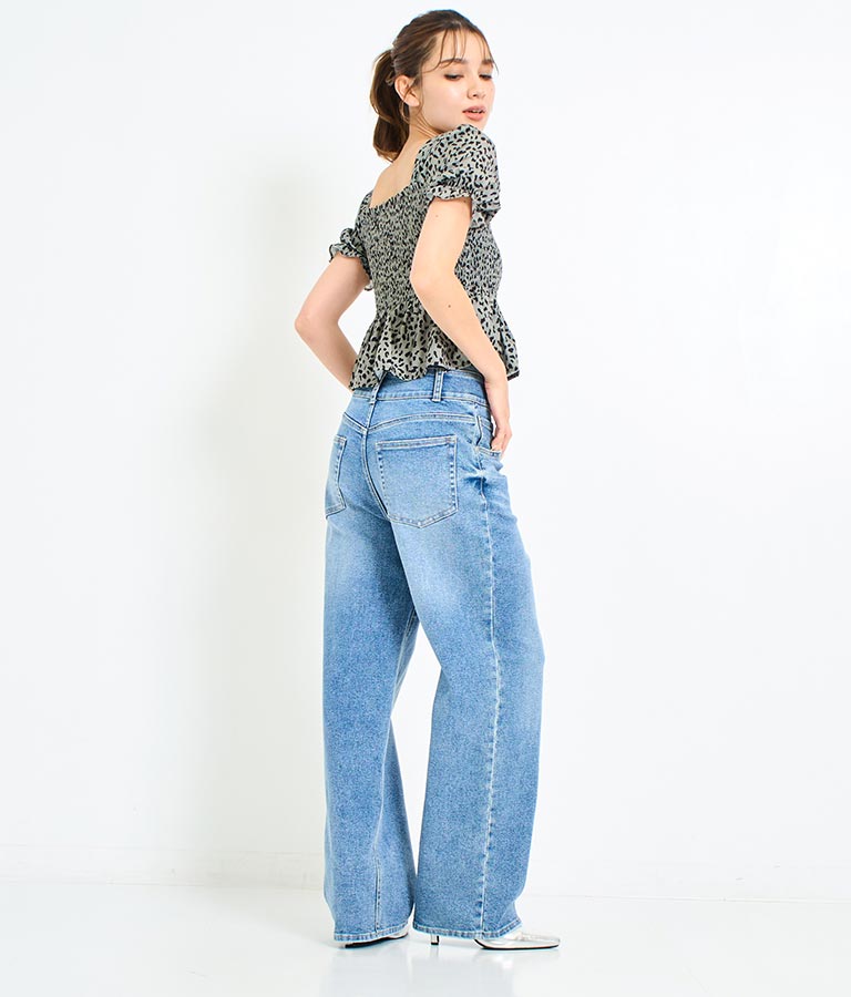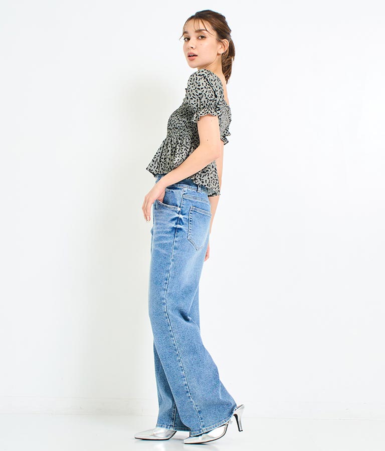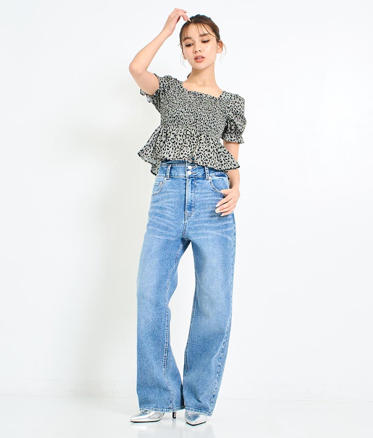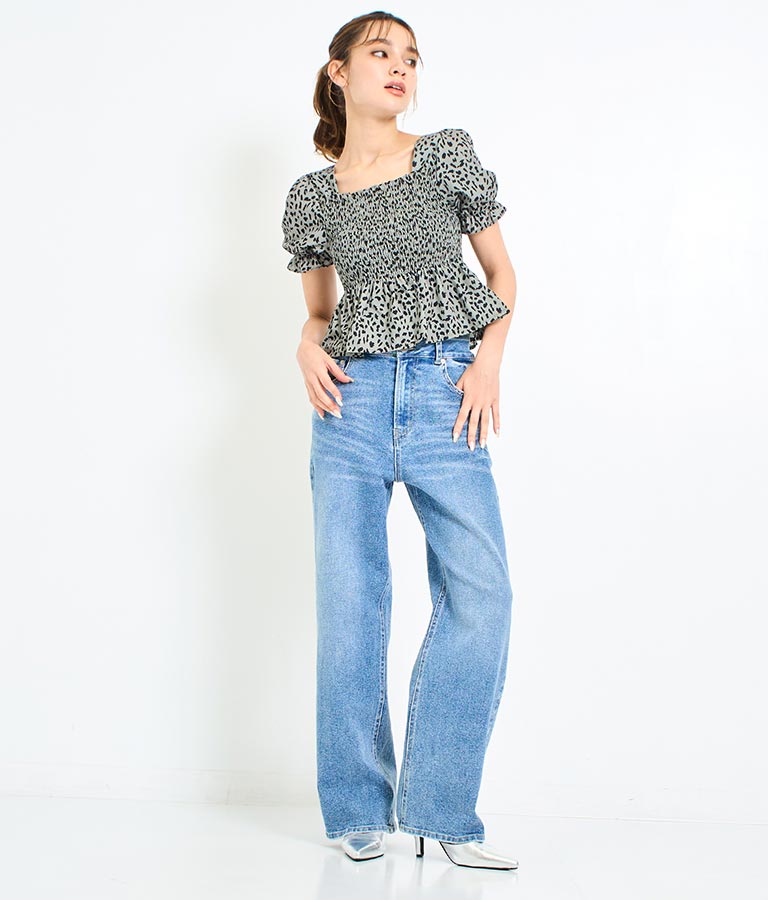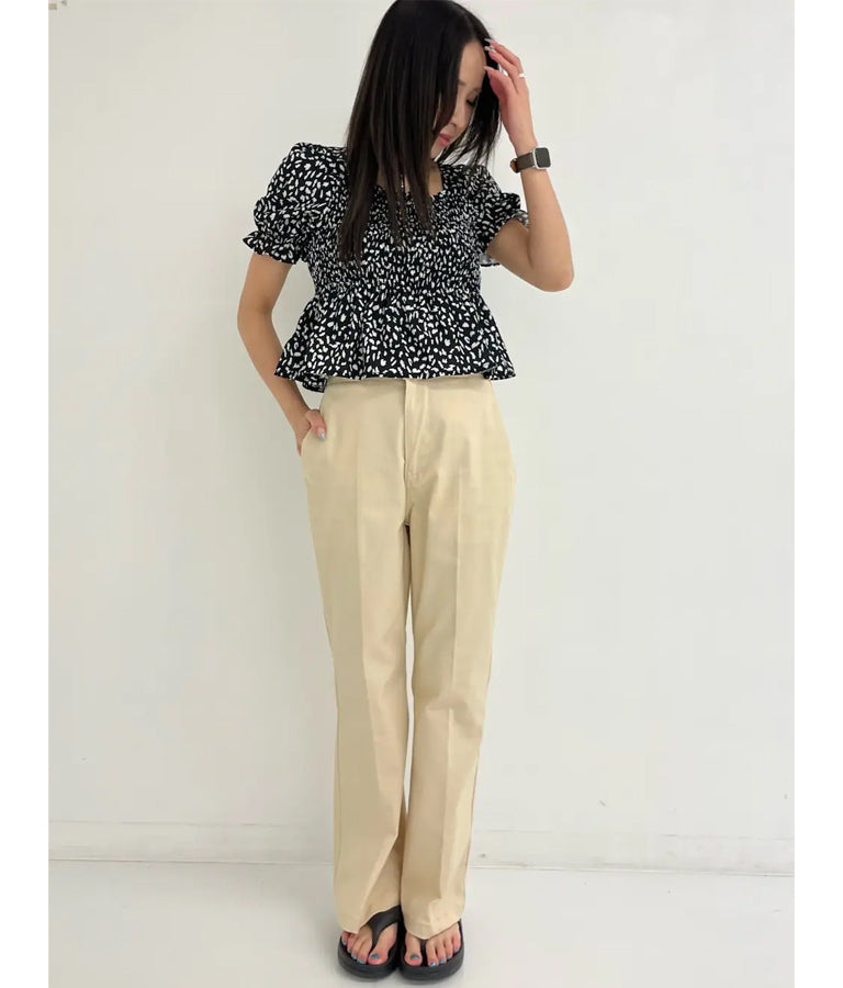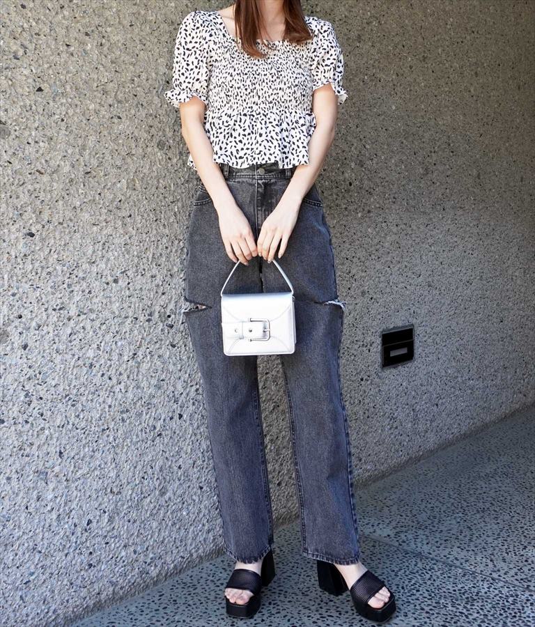 短めの丈なのでハイウエストボトムと相性がよく、トレンドのスクエアネックデザインで顔やデコルテ周りが明るくすっきりした印象に。