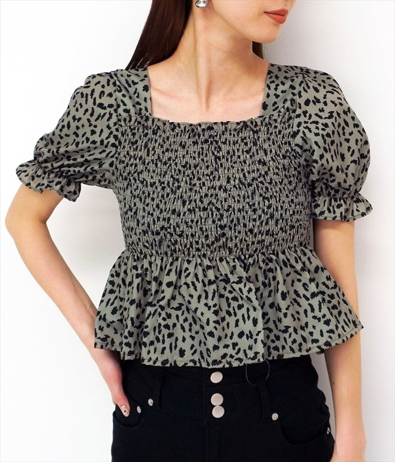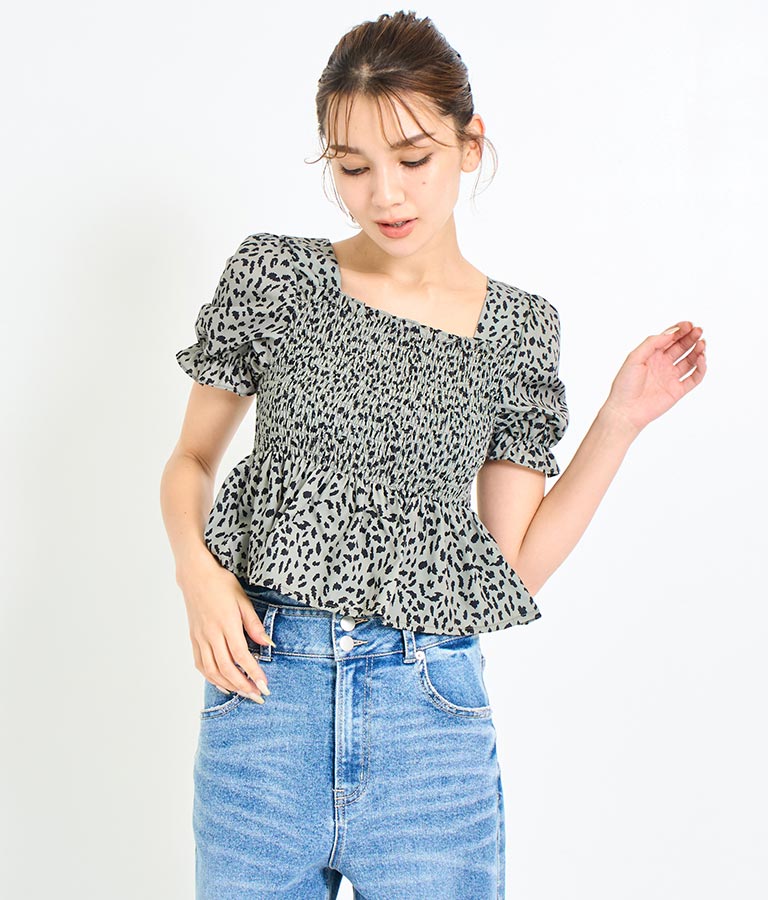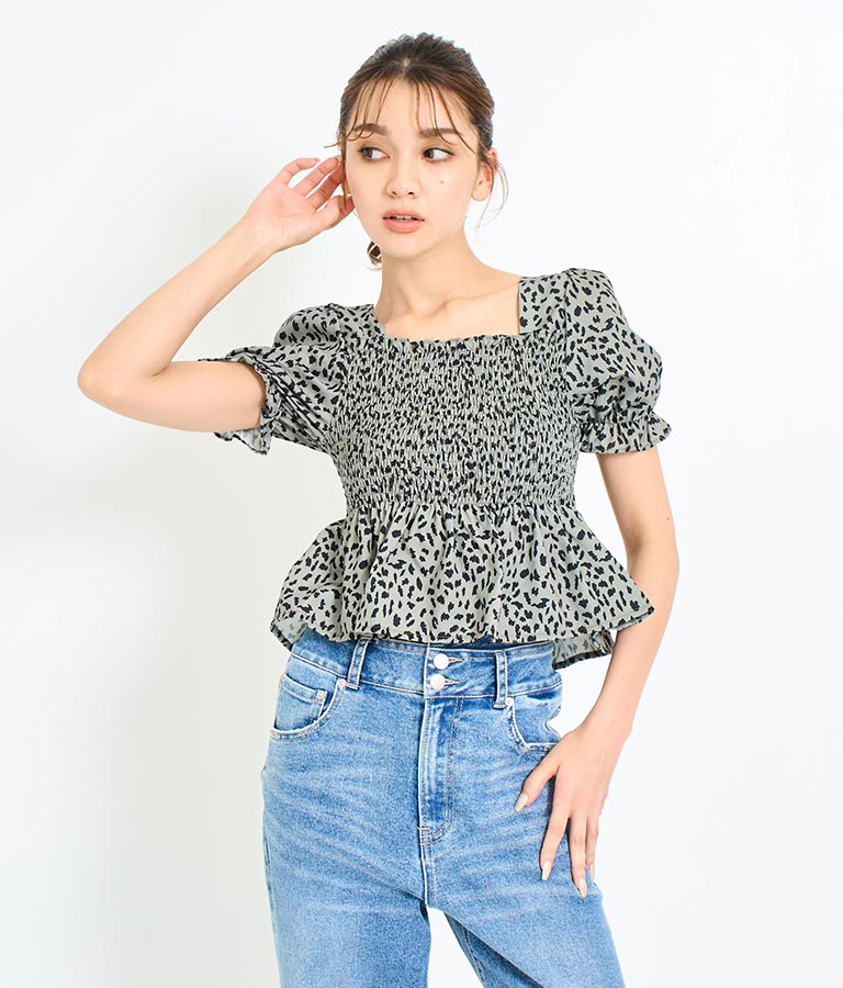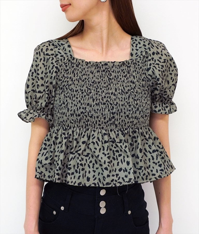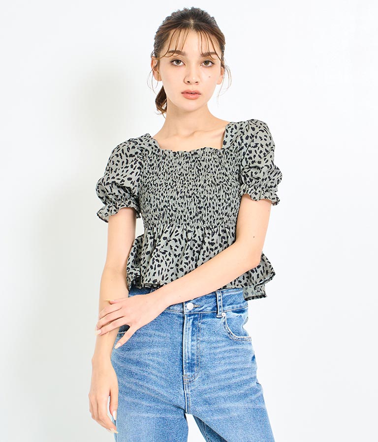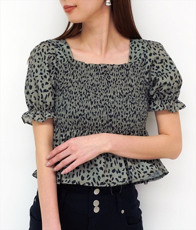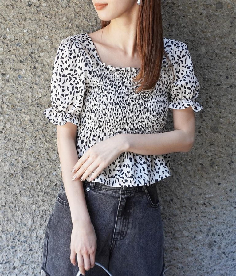 落ち着いた色合いの総柄が大人かわいいシャーリングトップス。