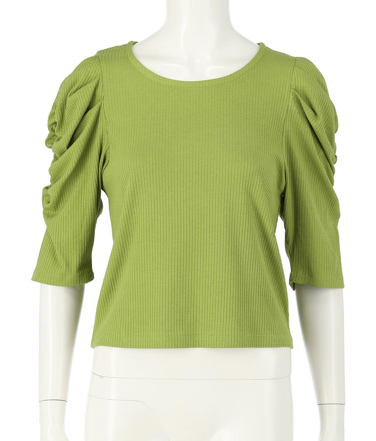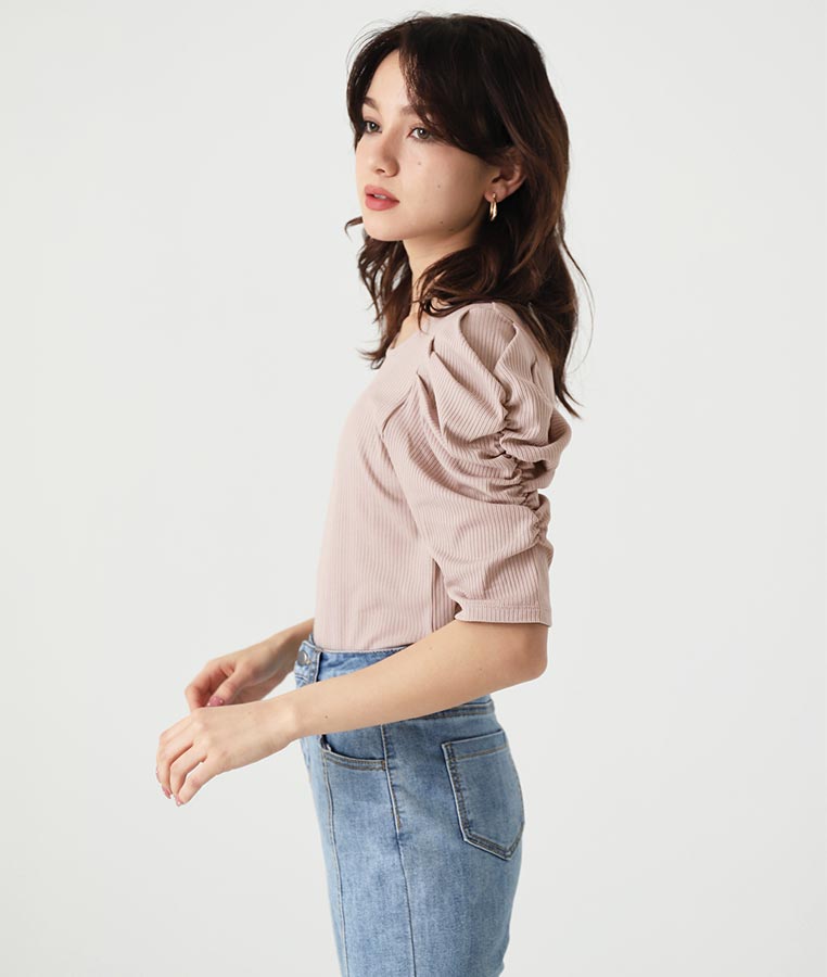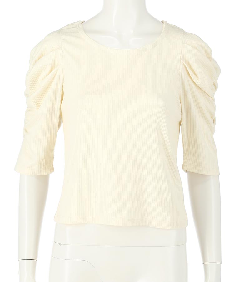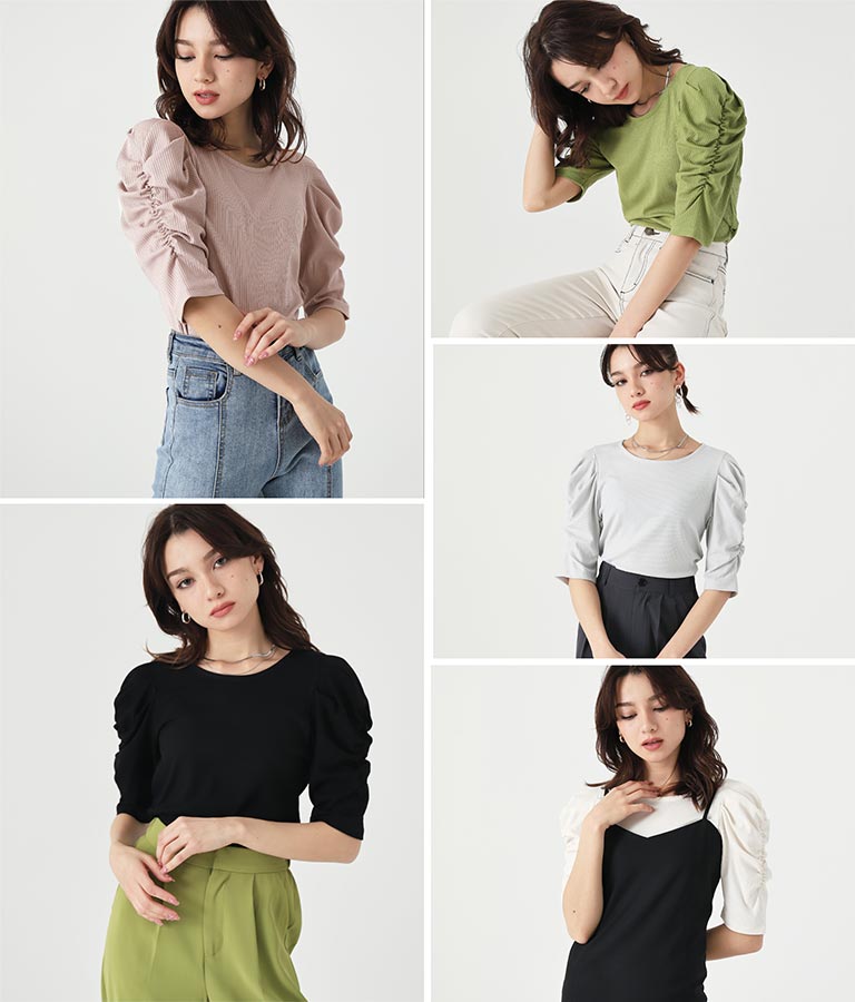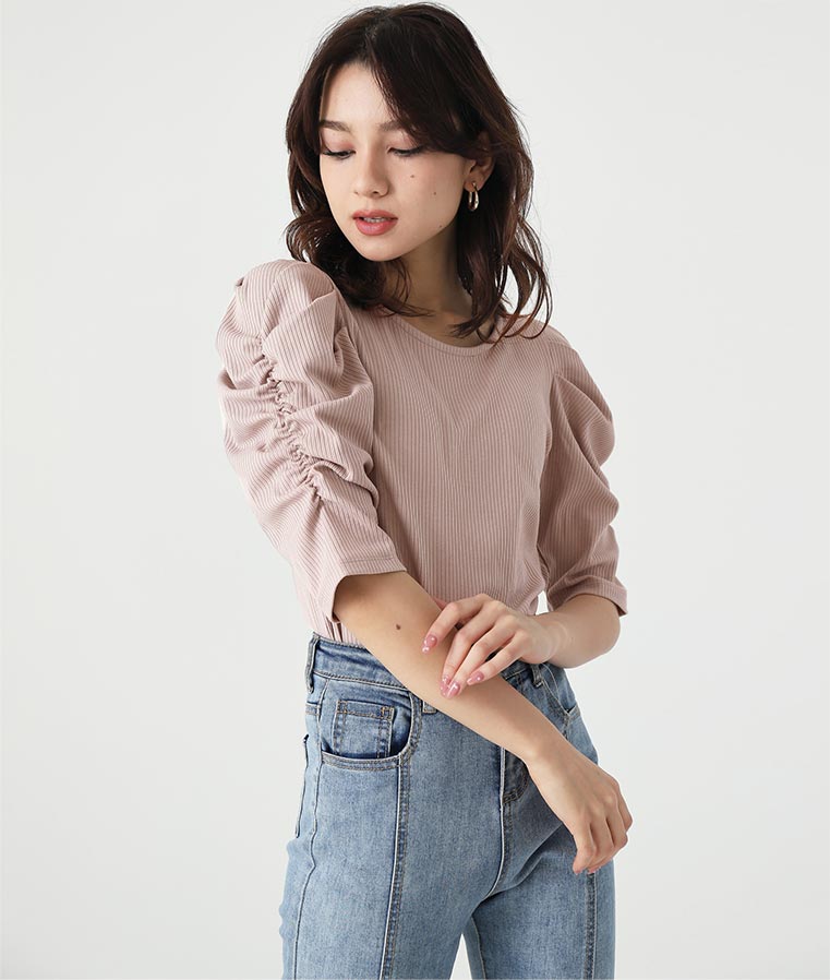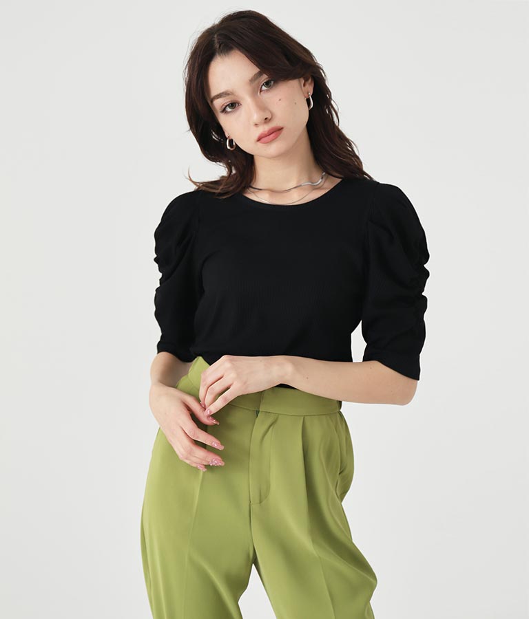 トレンドのパワショルにギャザーを取り入れた華やかなルックスのトップス。