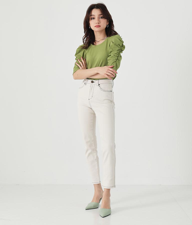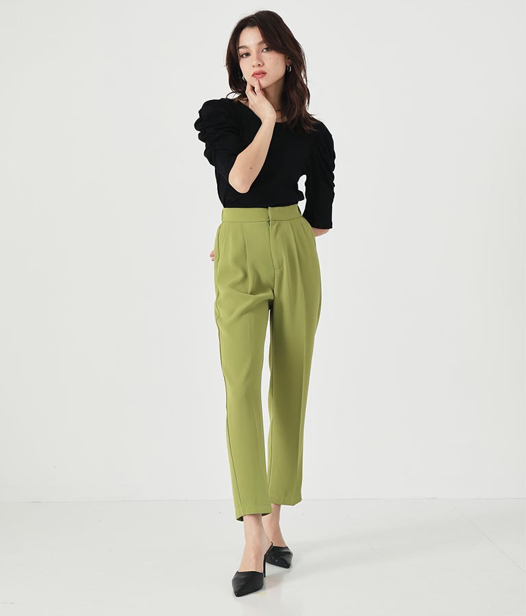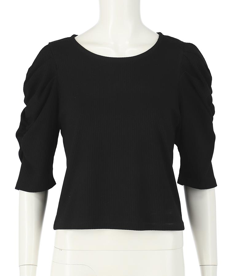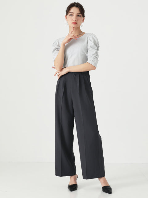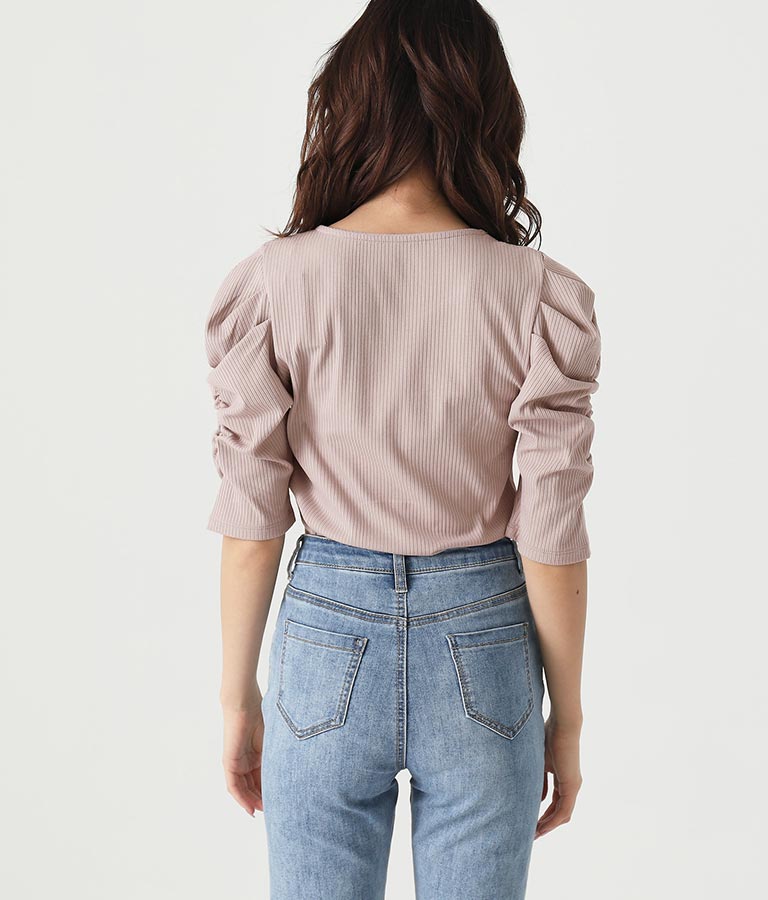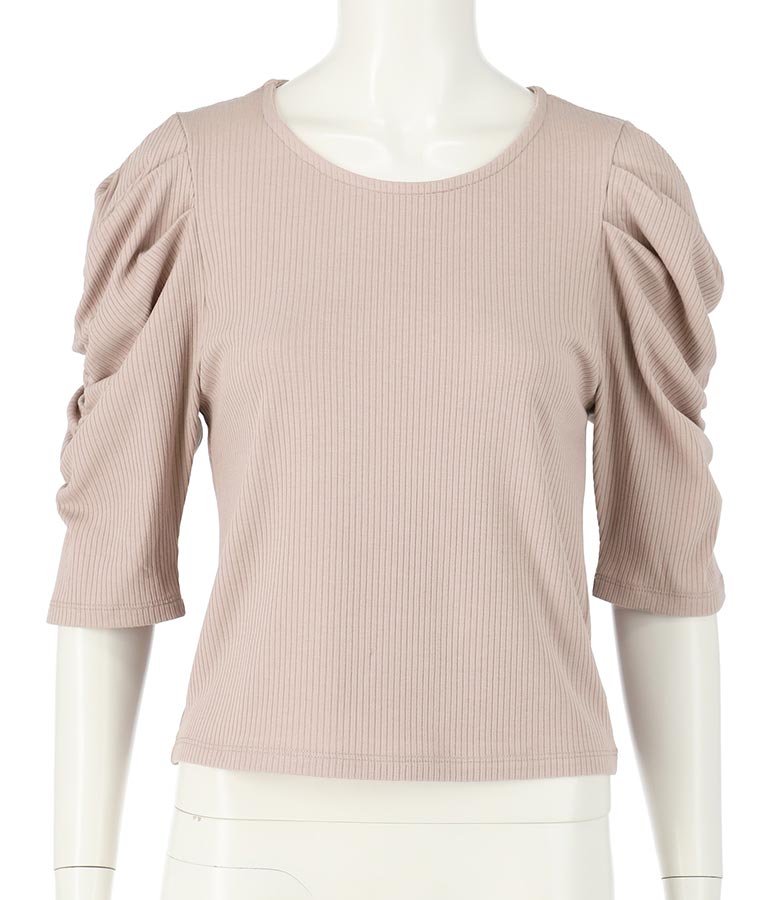 トレンドのパワショルにギャザーを取り入れた華やかなルックスのトップス。