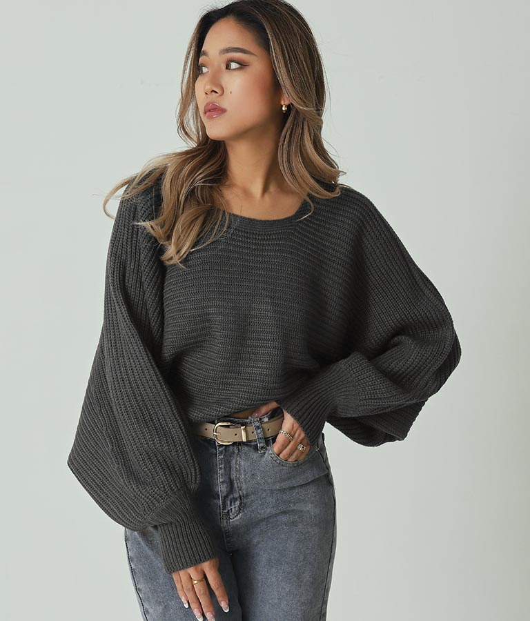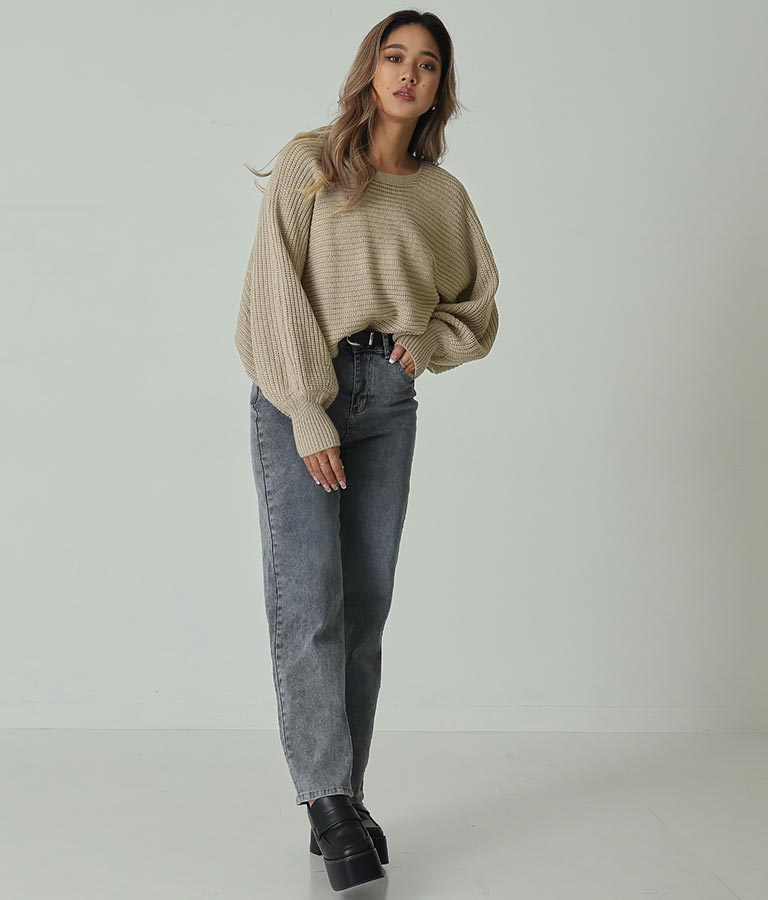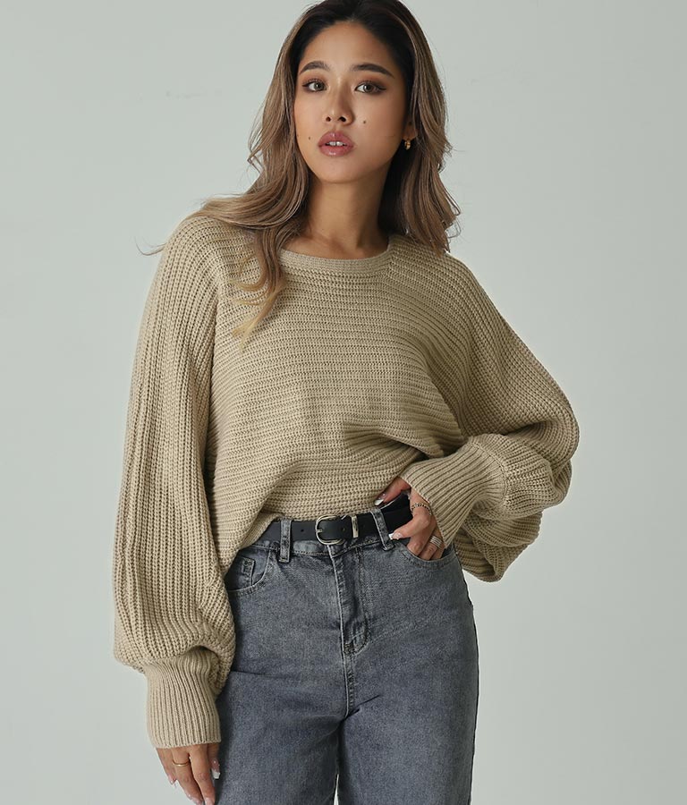 ルーズなドルマンスリーブシルエットで体型をカバーしつつ、女性らしいスタイリングを提案します。