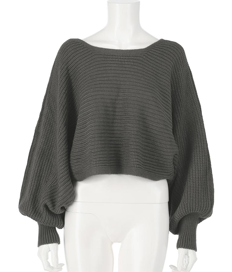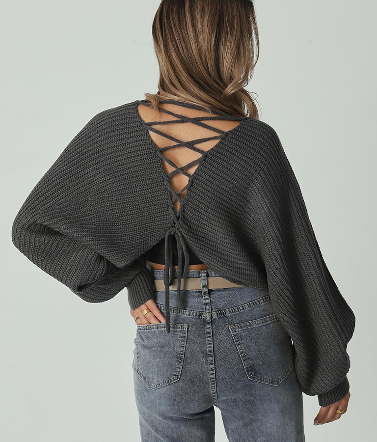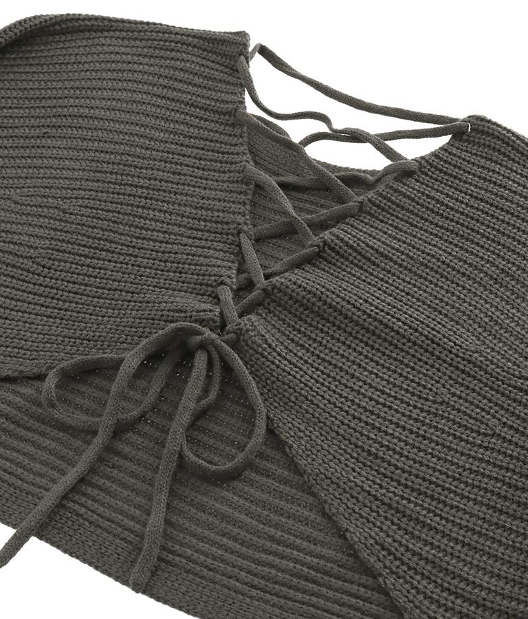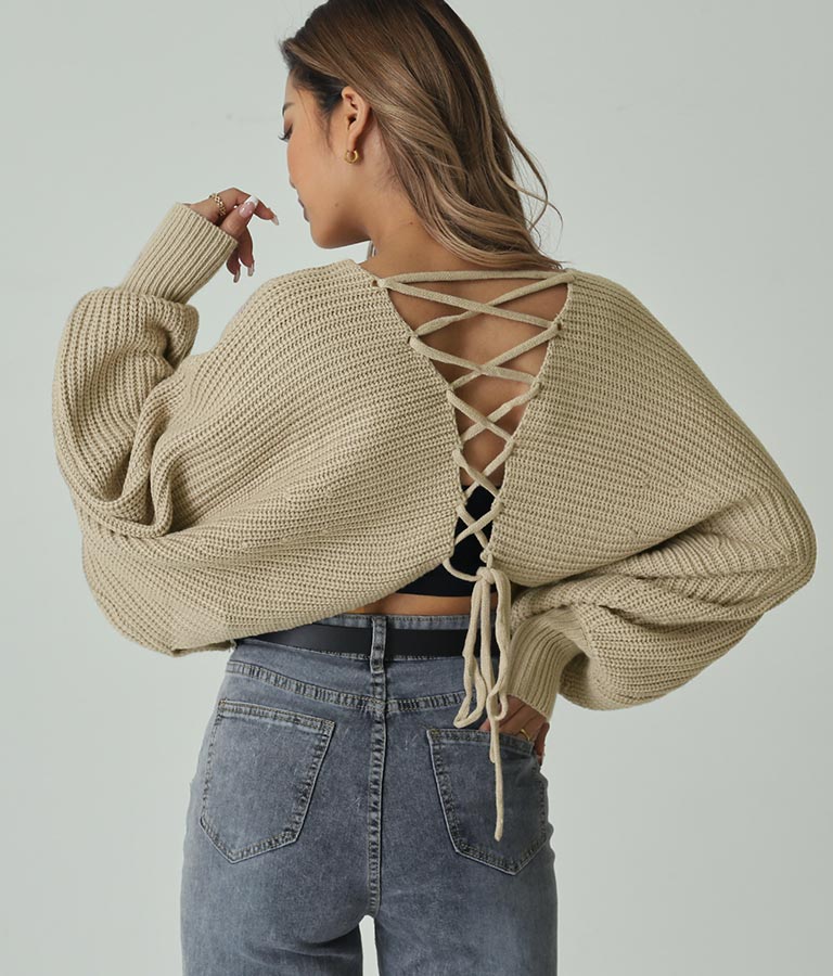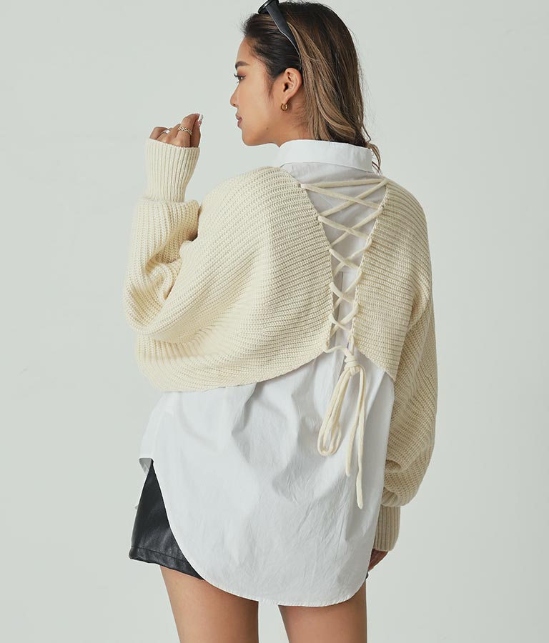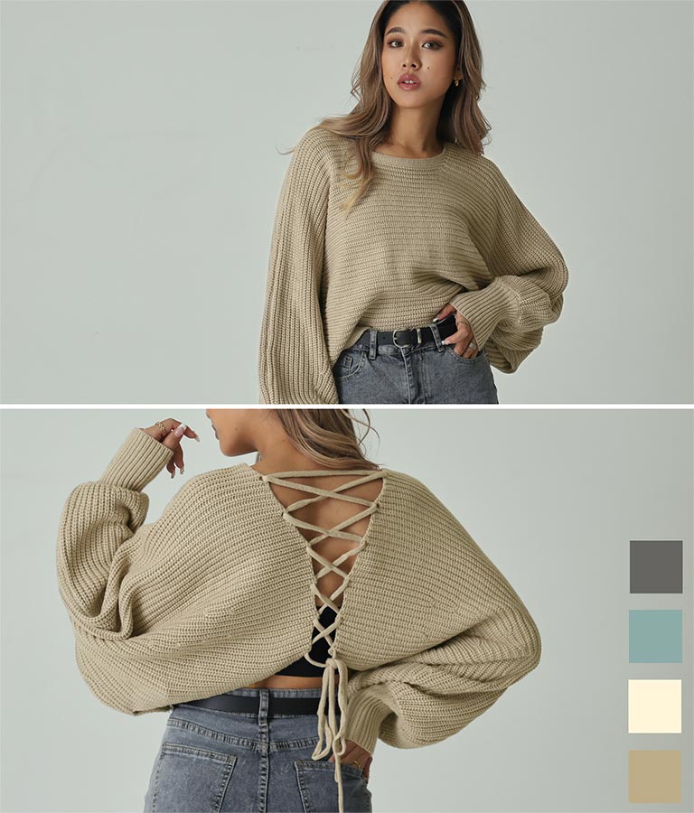 センシュアルな肌見せを楽しめる、背中にレースアップをほどこしたニットトップス。