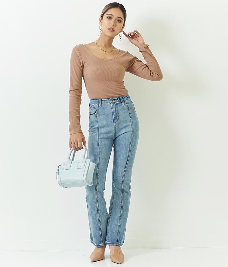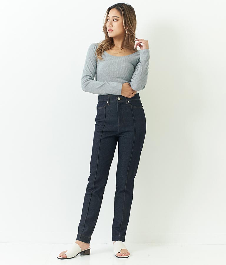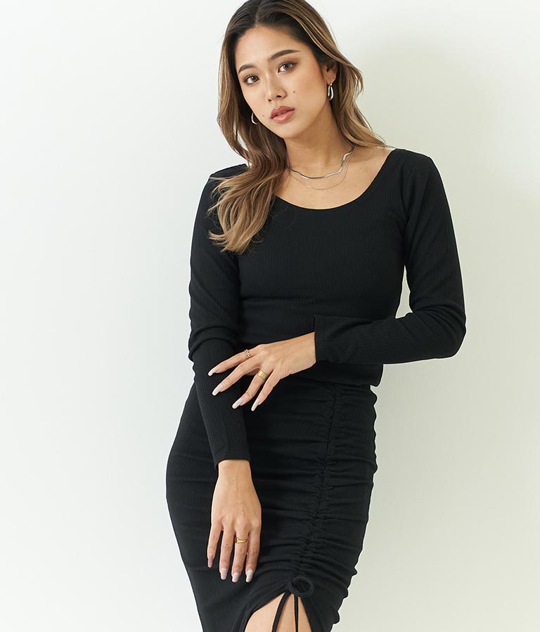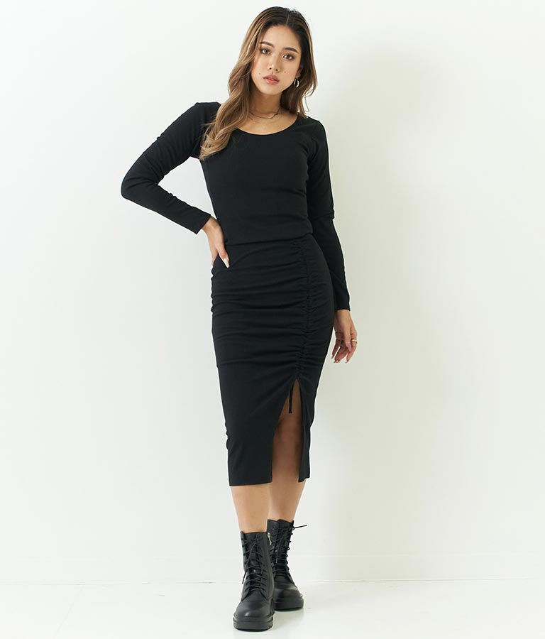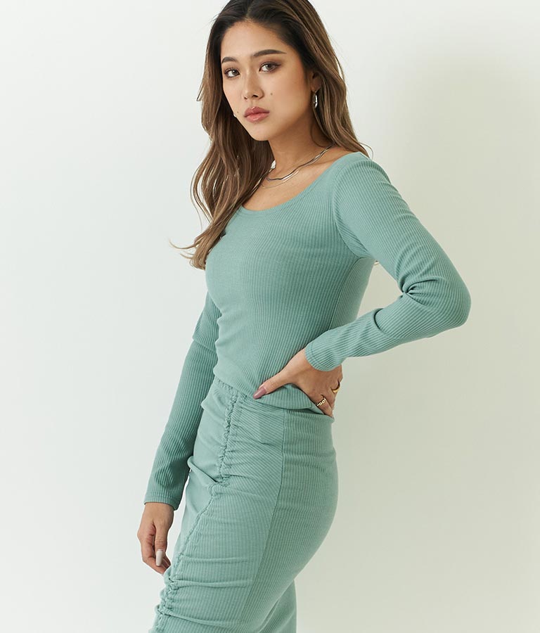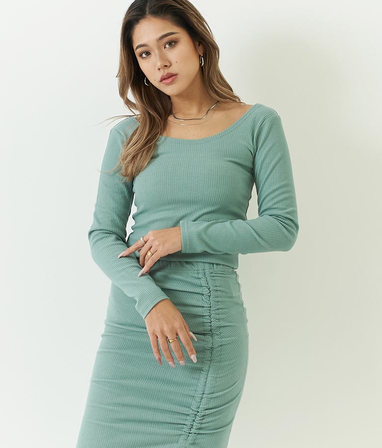 同素材のカットリブスリットデザインタイトスカートとセットアップ可能です。