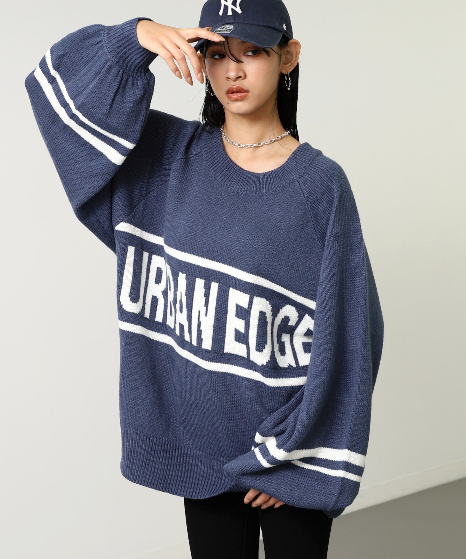 やわらかなニットをベースに、ジャガード編みでロゴを表現した存在感のあるデザインが印象的です。