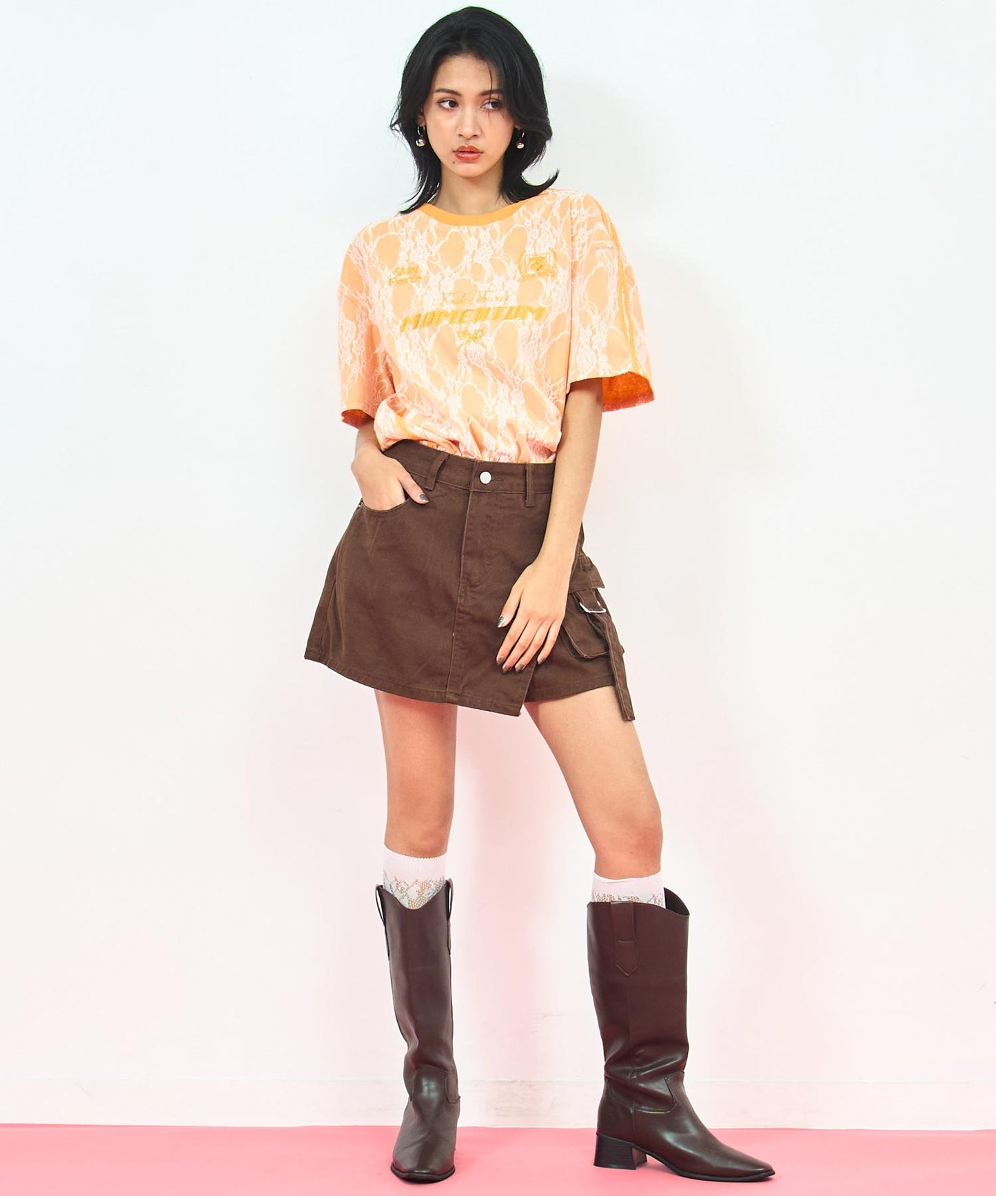 繊細な総レースと存在感のある刺繍ロゴが映えるデザインTシャツ。