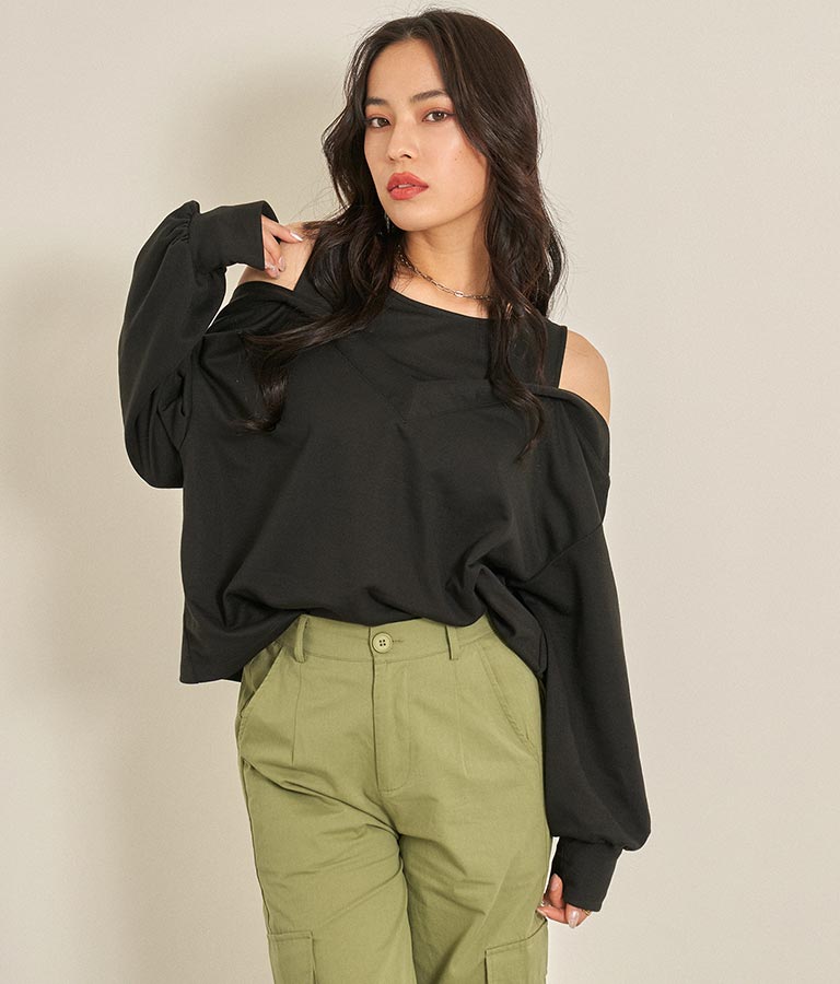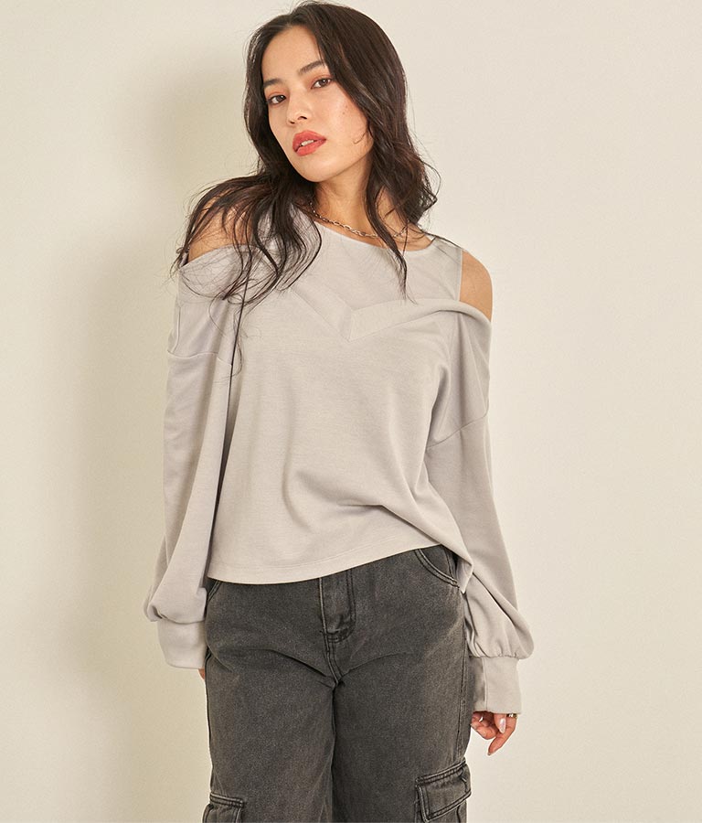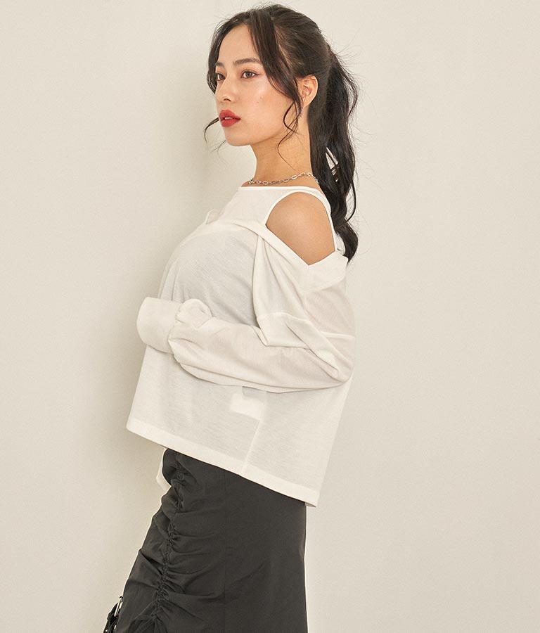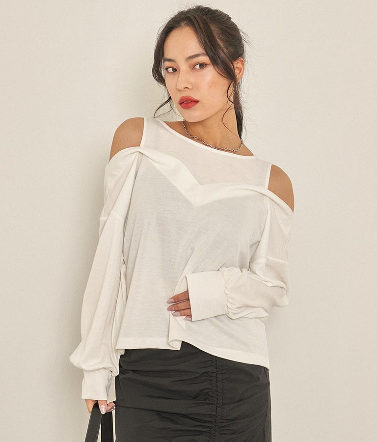ノースリーブとオフショルトップスを重ねたように見えるフェイクデザインがおしゃれ。