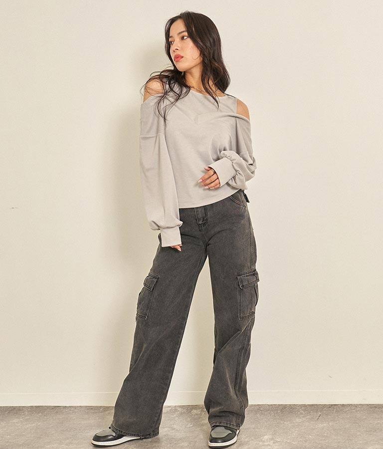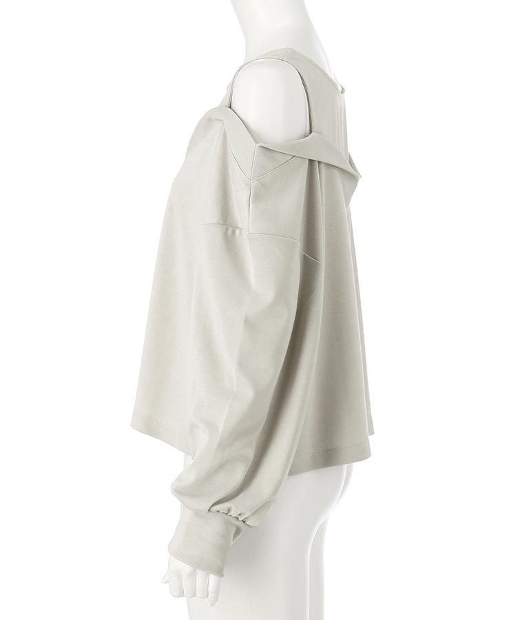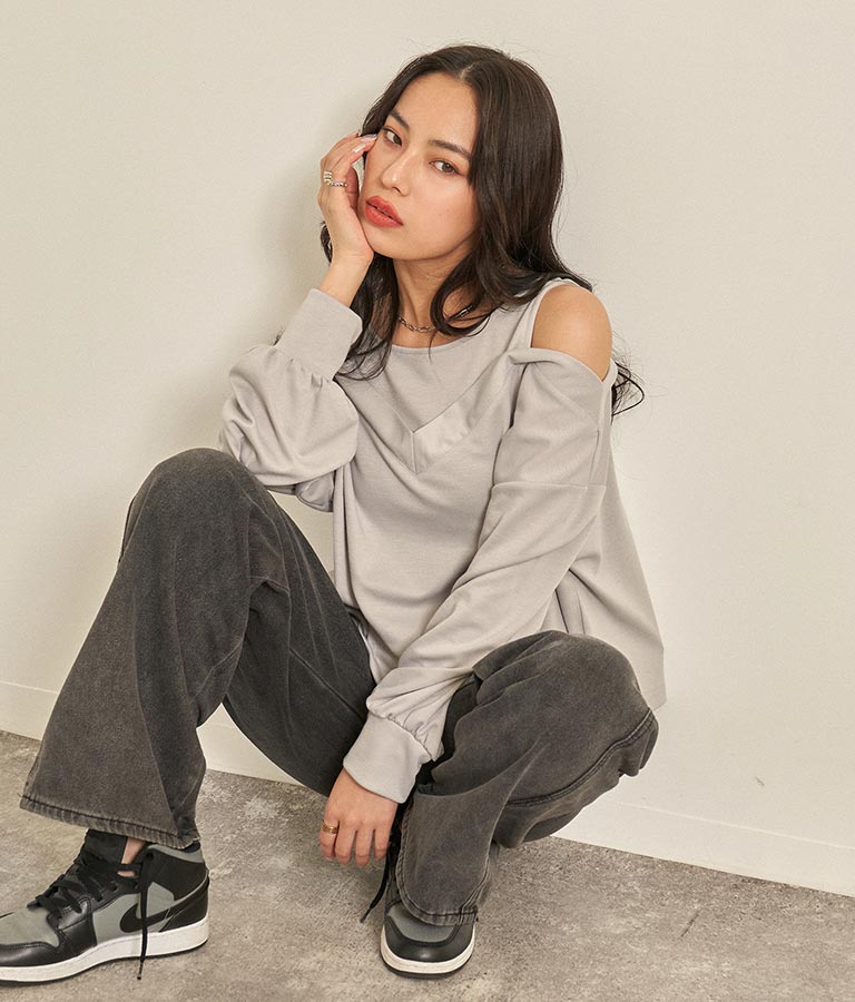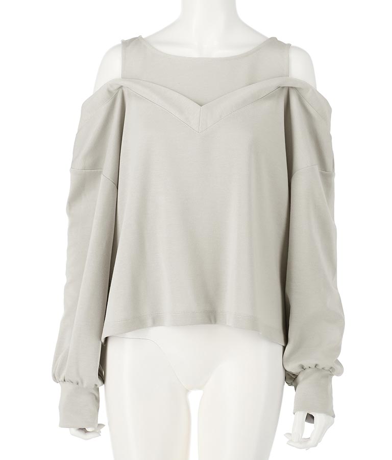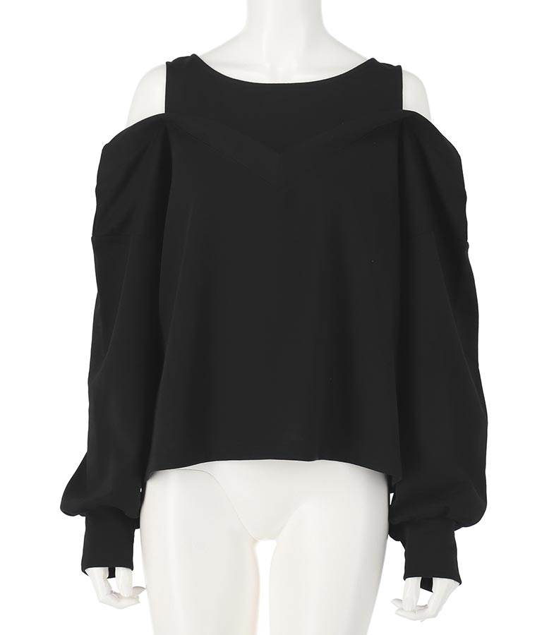 ノースリーブとオフショルトップスを重ねたように見えるフェイクデザインがおしゃれ。