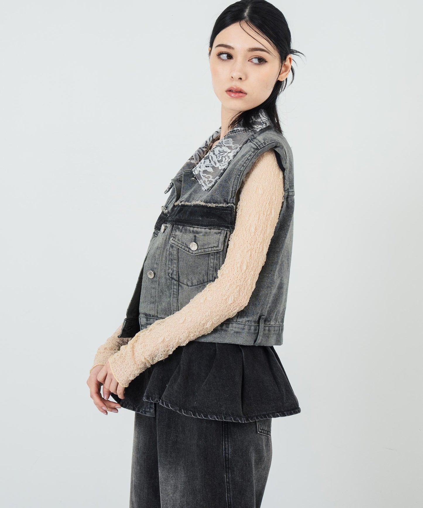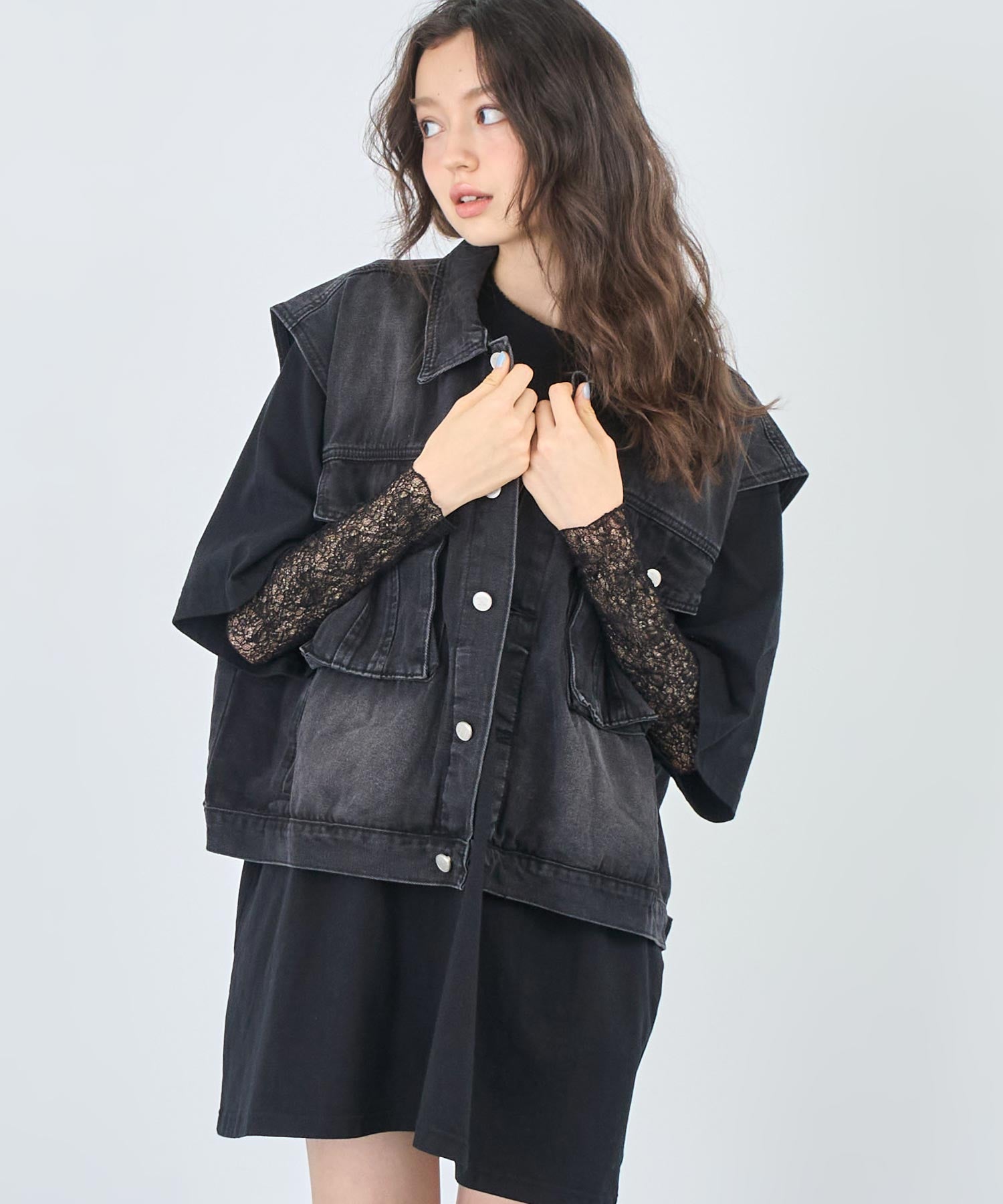 〇辛口な大人カジュアルに→デニムとレザージャケットを合わせて、ラフさの中にレースの繊細さをプラス。上級者感のあるコントラストで、周囲と差がつくスタイルに仕上がります。